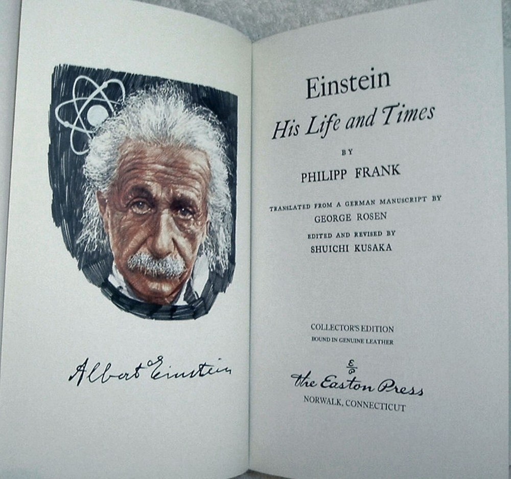 a Peace5eighty6 Auction *** Einstein His Life and Times by Philipp Frank Illustrated Easton Press Collector's Edition 1988 Condition: A s new, dark red full leather edition with ornate covers and title in gold on the spine. This is standard Easton Press quality with gold page edges, full grain cowhide leather, cloth end pages and silk page marker. Corners are sharp and undamaged. The gold page edges are bright and shiny and nearly mark free. There are no signs of former ownership inside. There are several full page b&w photographs throughout. Book size 6.25 by 9.25 inches tall, 198 pages plus index About Easton Press Books: Bound in genuine premium leather Intricate gilt stamped cover designs The page ends are gilded in 22-karat gold 22-karat gold-stamped spine accents Distinctive raised spine hubs With satin ribbon page marker Printed on archival-quality paper Smyth-sewn pages Moire cloth end pages Shipping Terms US Bidders : This item will be shipped by USPS Media mail (5-9 days) or any other method the buyer may select. International Bidders : This item will be shipped worldwide by Ebay Global shipping service. Postage and VAT may apply. Bidder Agreement By bidding in this auction, you are agreeing to all of the terms stated above. Please ask any questions you may have BEFORE you bid. Your bid is a promise to buy. Please read my description and ask me questions before bidding. I make every effort to show the defects (if any) in the pictures provided. If not pleased with this item, return it for a full refund of your purchase price. Official PayPal Conversion Rates Add Currency Converter To Your Items
