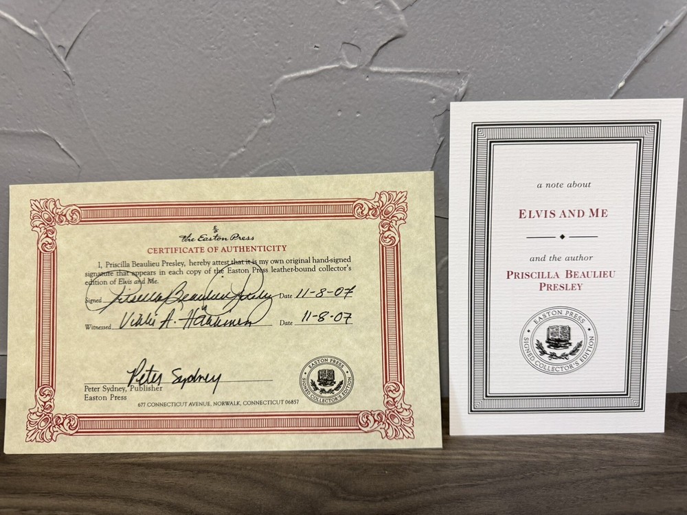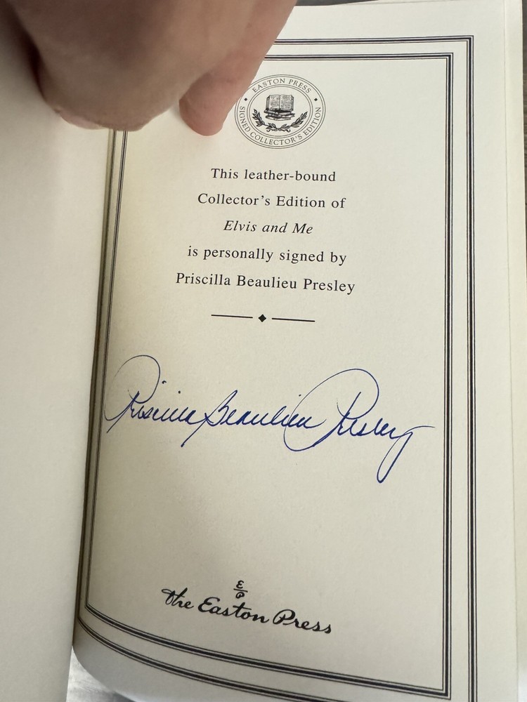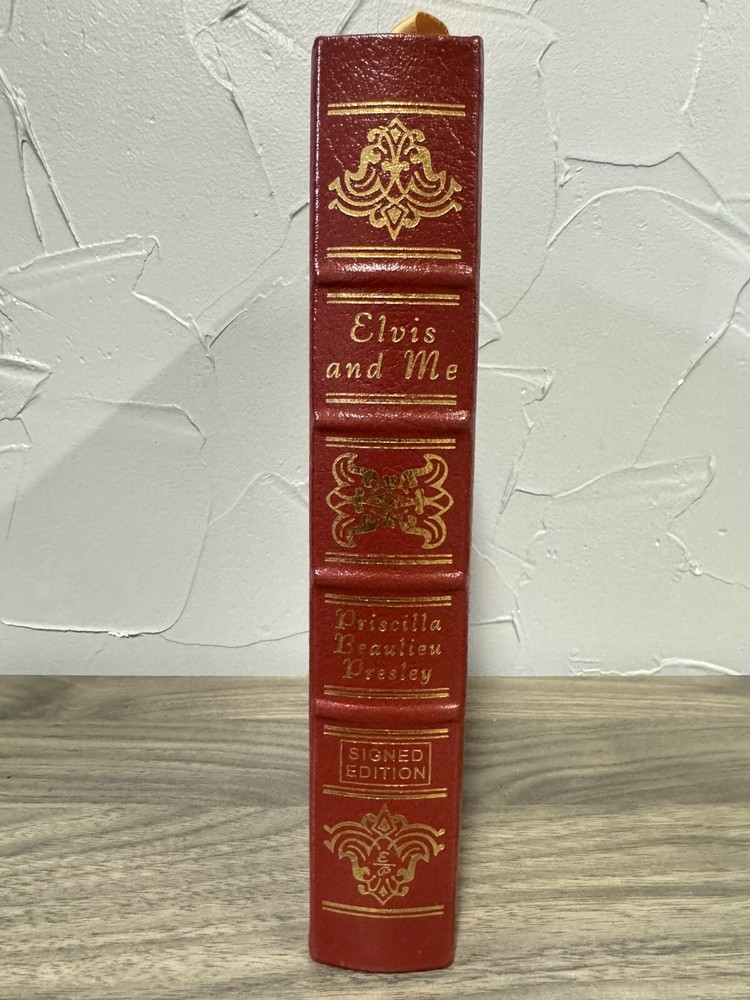 This is a rare and valuable edition of "Elvis and Me" by Priscilla Presley, published by Easton Press in 1985. The book is a hardcover, leather-bound edition that is signed by the author herself. The narrative type of the book is nonfiction, with a focus on the topic of Elvis Presley. The book is in excellent shape and has been well-preserved, making it an ideal addition to any book collection. The features of the book include a beautiful leather-bound cover that adds to its overall appeal. The book is written in English and is perfect for fans of memoirs and Elvis Presley.