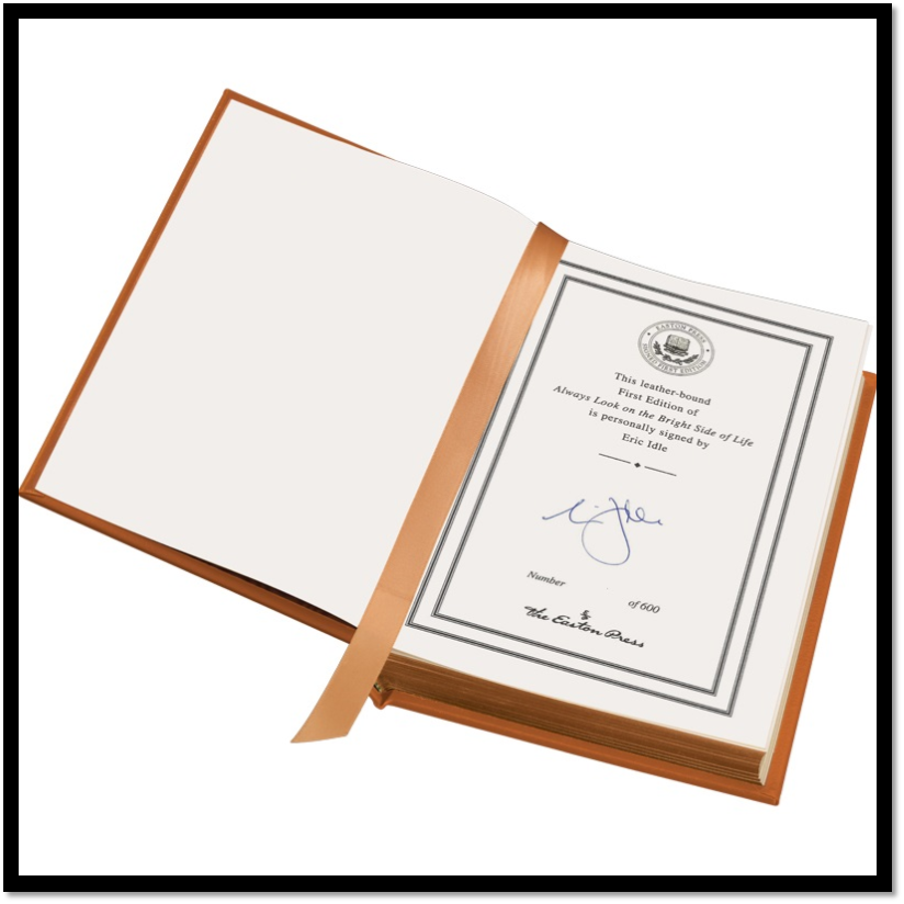Always Look On The Bright Side Of Life This is a brand new Easton Press leather-bound hardback edition of Always Look On The Bright Side of Life signed by Eric Idle. A memoir of unparalleled wit and heartfelt candor from the ingenious comic performer, founding member of Monty Python, and creator of Spamalot . SHIPPING I ship via media mail within the U.S. If you would like an expedited option please let me know before buying. I ship globally, but I use the U.S. service which I ship to in Kentucky and it ships out to the Country and uses their services. Also, if you are an international buyer and would like to combine shipping and the add to cart and request total option is not working please contact me about creating you a listing.