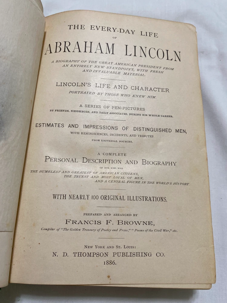 Description Please supersize and examine photos closely above. They are being used to describe this eBay item and its condition. Below I will add any written details that I feel the photos do not or cannot represent. Details: EVERYDAY LIFE OF ABRAHAM LINCOLN 1ST EDITION 1886 ILLUSTRATED FRANCIS BROWNE. No dust Jacket, condition is fair, see all pictures. I don't normally sell books, so if you need any additional info about this item please ask. Measurement: 9" x 6.75" x 1-5/8" If you have more questions about this item, please ask I would be happy to answer them. PAYMENT DETAILS Please pay for your items by no later than four days after your purchase . Thank-you!!! Terms of Sale NOTE to all buyers: Since nearly 95% of the items that I sell are old, used, or vintage, they are offered in "AS-IS" condition , and the buyer will assume any and all risk that may be associated with buying a used item . Since "used" items can have many issues it is many times impossible for me to list, see, or know all the flaws; however, I will always try to describe the item to the best of my ability and provide pictures that are representative of the item(s) condition, but if an item is being sold as "used" it is being sold "as is". My descriptions will be as honest and as accurate as possible; but because I'm no expert your comments and corrections are most welcome. Feel free to email me your questions or comments before you purchase, I will gladly insert your correction in my listing, or answer your question. All of my merchandise is guaranteed! If you feel an item was misrepresented, you may return the item for a refund, please EMAIL ME FIRST before you return your item. I give refunds on clear, non-disputable misrepresentation that is brought to my attention. For example, if I said that an item is not chipped, and it is; OR if I said a product works and it does not. Remember, it is the buyer’s responsibility to read my description, my item specifics, and view my picture(s) closely before purchasing. Thank you. Contact Us Many of the items pnm sales sells are out of our field of expertise. Many times, we need viewers of our items to inform us of details they feel we need to include in our listings. So PLEASE do not hesitate to contact us anytime with any questions, or any additional comments or information you would like to give, about this item, we would greatly appreciate it. Thank you. Please honor your purchase and I will do my best to provide you with prompt, honest, sincere, and excellent service. Please check out my other items in my store!!! Thank you for viewing my listing. Enjoy your eBay experience!