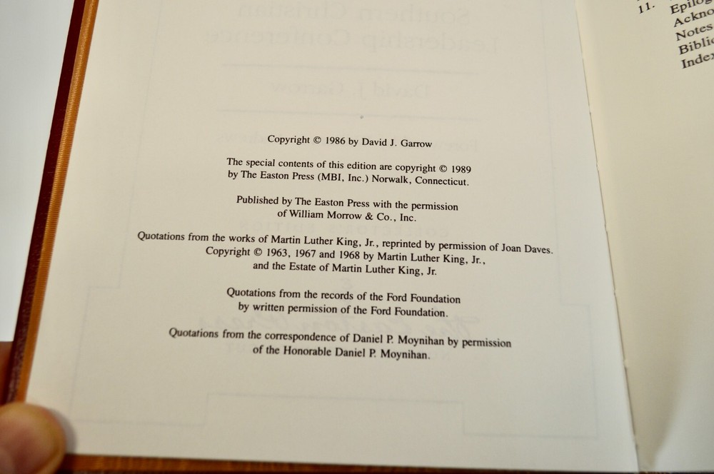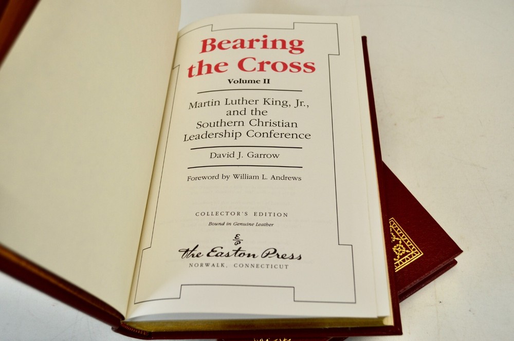 AN IMMACULATE COLLECTOR'S SET. Bearing the Cross; Martin Luther King, Jr. and the Southern Christian Leadership Conference by David J. Garrow published by Easton Press 1994. 2-Volume set. A beautiful book set in mint condition. Blemish-free leather, tight spine, excellent gilt, ribbon in original placement, seemingly unread. ~~~~~~~~~~~~~~~~~~~~~~~~ Easton Press is recognized as the highest quality modern leather books available, and will make a stunning addition to your library or a fitting start to a fine binding leather book collection. Each book is bound in a signature color and design, and exhibits 22 karat gold foil stamping of the titles and jacket designs. They are printed on archival quality acid-neutral paper and include silk moire endpapers, an expensive hubbed spine, bound-in silk ribbons bookmarks, gilded page edges, Smyth-sewn pages for strength and durability and often contain beautiful illustrations. ~~~~~~~~~~~~~~~~The Fine Print~~~~~~~~~~~~~~~~: At Rarified Books, we take pride in offering items of extraordinary quality, value and condition. We offer the finest in modern leather-bound books and more. Books are sourced from smoke free homes, and are carefully inspected. Other items are equally carefully sourced ... check out our other listings and see! All descriptions are to the best of our knowledge. Sales are made as-is and no warranty is offered as to authenticity or provenance. Title passes to the buyer upon shipment. All sales are final. Sales tax may apply which is collected automatically by eBay. Returns are not accepted except in rare circumstances upon agreement. Shipping is the responsibility of the buyer unless otherwise noted or agreed. Books are wrapped and protected in bubble wrapping for shipping, with additional cushioning paper filler in an appropriately sized carton or padded envelope. Most books will be shipped via USPS Media Mail with tracking or FedEx Home Delivery. International Shipping through eBay's Global Shipping Program only. International buyers are responsible for all local customs fees, taxes, and duties. These charges are not included in our shipping costs. We also buy books and are always open to purchasing excellent condition books from Easton Press, Franklin Library, Folio Society and similar as well as other rare and collectible books. See our website www.modernleatherbooks.com and let us know what you have. Thank you for considering our listing!