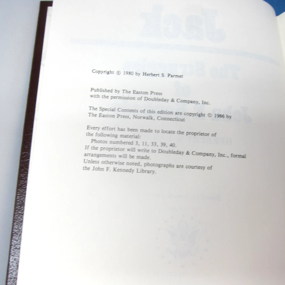 Jack and JFK, 2 volume set by Herbert S. Parmet, leather-bound, gilt edged and decor from Easton Press. Collector's Notes are included in both volumes, and 1 unused bookplate....