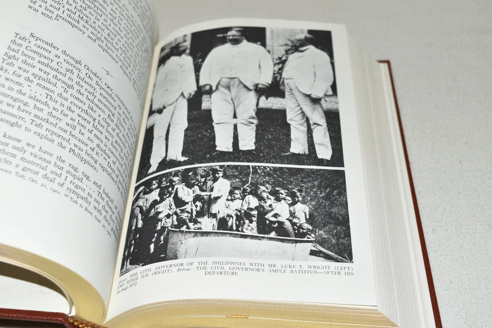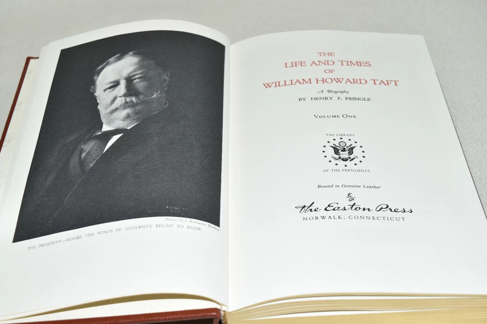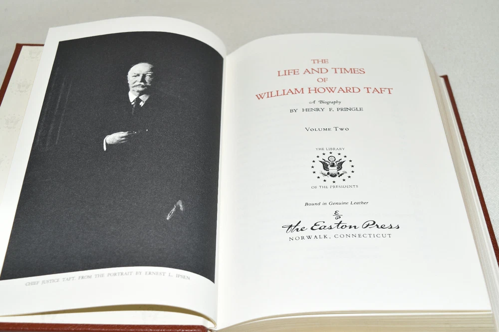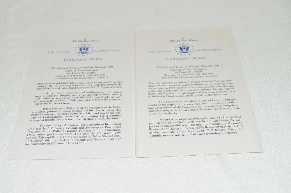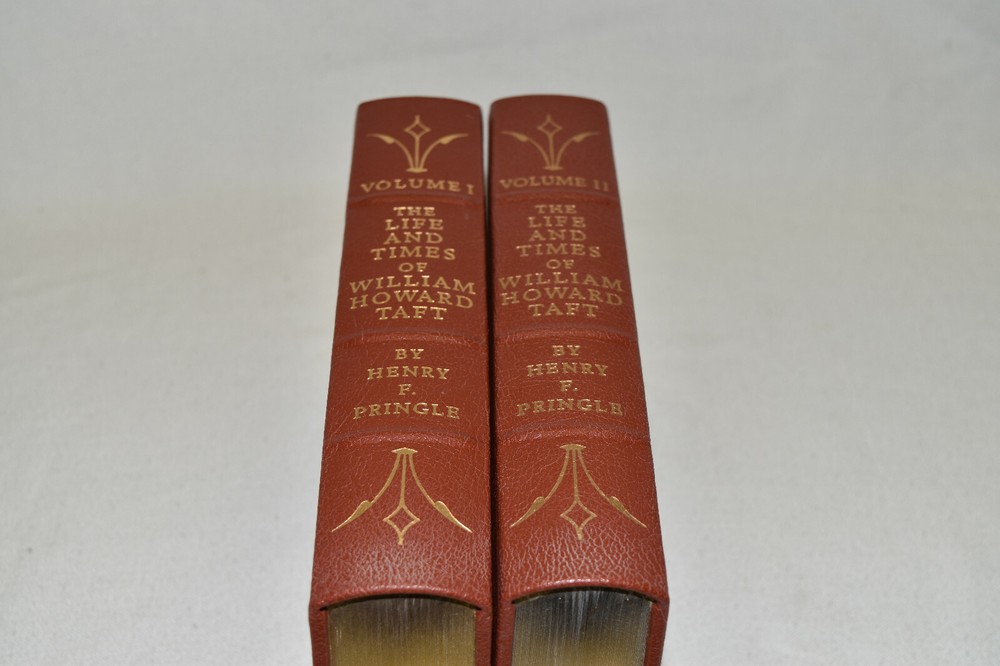 From the Easton Press Library of Presidents Collection... The Life and Times of William Howard Taft Complete 2 Volume Set by Henry Pringle Copyright 1986 by The Easton Press Bound in Premium Full Leather These volumes contain all of the classic Easton Press trimmings: Premium Leather Decorated Endleaves Distinctive Cover Design Hubbed Spine, Accented in Real 22KT Gold Satin Ribbon Page Marker Gilded Page Edges Long-lasting, High Quality Acid-neutral Paper Smyth-sewn Pages for Strength and Durability Beautiful Illustrations Scarce titles in any condition, this two-volume set is in Near Fine - Fine condition. The front and back covers are both in near perfect condition showing faint wear and the gilded page edges show only light wear (see pictures of all sides of gilt)! There are no writing, markings, bookplates, or other signs of prior ownership in these books. The bindings are tight and square without spine lean. This set is part of The Library of Presidents Collection published by Easton Press and comes complete with Collector's Notes. It would be a beautiful addition to your Easton Press collection. Overall, this set is a grade collector's set. This set is very elusive in this superior condition, as only a limited number of them were ever published, so now is the time to act. Hopefully you can add this set to your collection and enjoy it in the years to come... Please Email Me With Any Questions You Might Have! Shipping Info: Buyer to Pay Shipping & Handling International Bidders Pay Extra Shipping Forms of Payment Accepted: Paypal Good luck and happy bidding! Powered by eBay Turbo Lister The free listing tool. List your items fast and easy and manage your active items.