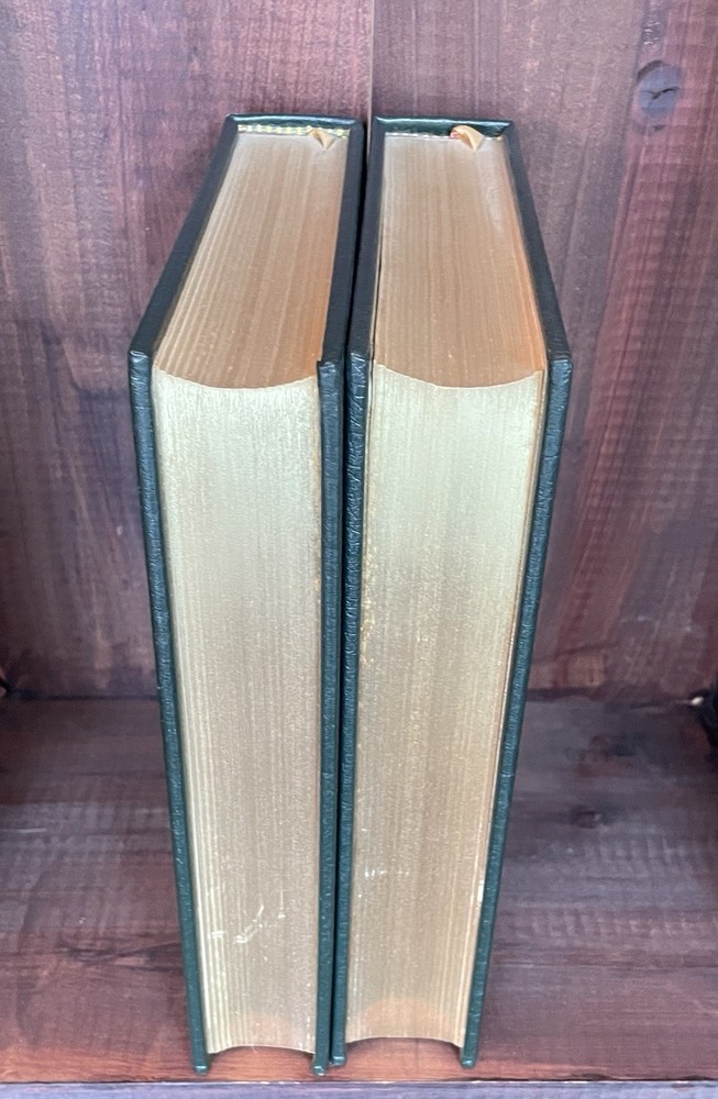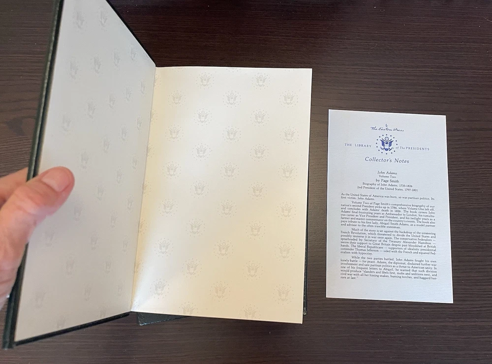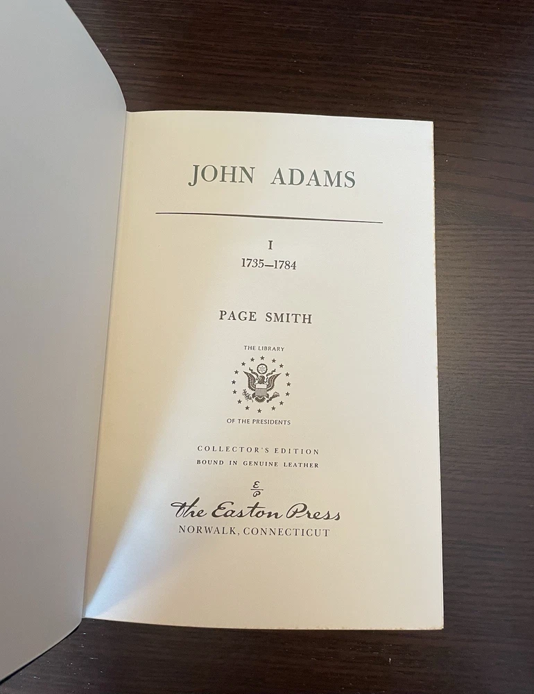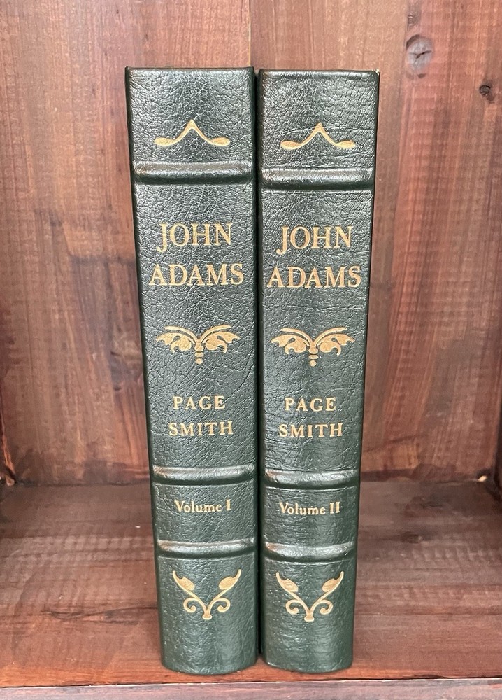Offering this handsome 2-volume deluxe leather fine binding set of John Adams by Page Smith. Norwalk: Easton Press, 1988. Collector's Edition, The Library of the Presidents. Full leather hardcover decorated with 22k gold, and gold page edges, and attached ribbon page marker and blank Easton Press book plates. Collector's Notes included for volume 2 only. Light foxing to page edges, else clean and unmarked with light wear. A nice set!