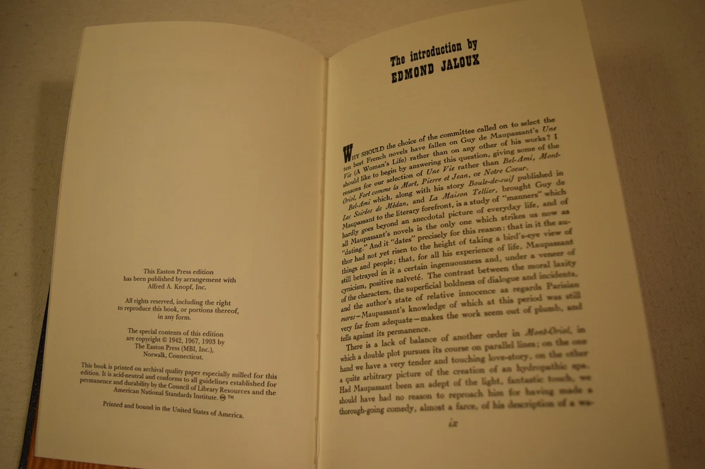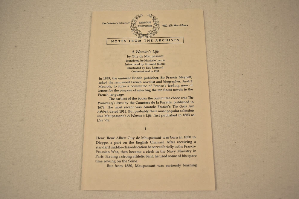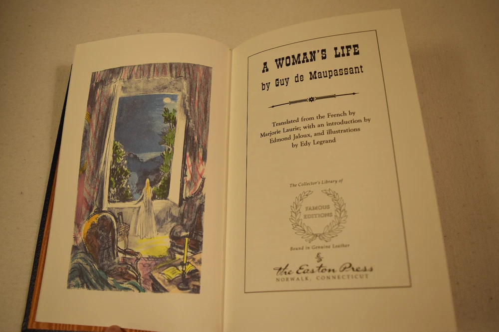 From the Easton Press Famous Editions Collection... A Woman's Life by Guy de Maupassant Illustrated by Edy Legrand Translated by Marjorie Laurie Copyright 1993 by The Easton Press Bound in Premium Full Leather This volume contains all of the classic Easton Press trimmings: Premium Leather Silk Moire Endleaves Distinctive Cover Design Hubbed Spine, Accented in Real 22KT Gold Satin Ribbon Page Marker Gilded Page Edges Long-lasting, High Quality Acid-neutral Paper Smyth-sewn Pages for Strength and Durability Beautiful Illustrations A very scarce title in any condition, this volume is in Fine condition. There are no markings, bookplates, or other signs of prior ownership in this book . The front and back covers are in near perfect condition and the gilded page edges show hardly any wear (see pictures). This book is part of the Library of Famous Editions Collection published by Easton Press. It comes complete with Collector's Notes and would be a beautiful addition to your Easton Press collection. Overall, this copy is a grade collector's book. This book is very elusive in this superior condition, as only a limited number of them were ever published, so now is the time to act. Hopefully you can add this book to your collection and enjoy it in the years to come... Please Email Me With Any Questions You Might Have! Shipping Info: Buyer to Pay Shipping and Handling International Bidders Pay Extra Shipping Seller Not Responsible For Uninsured Items Lost or Damaged in Mail Good luck and happy bidding!