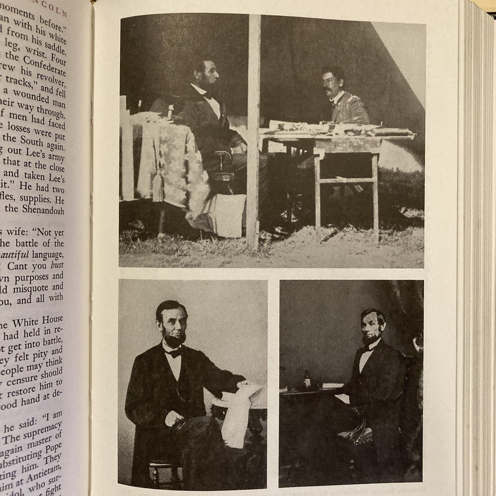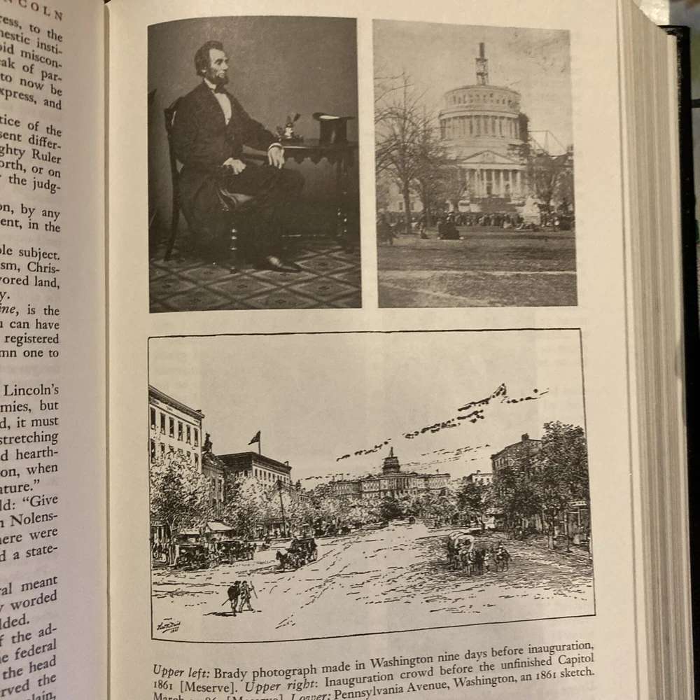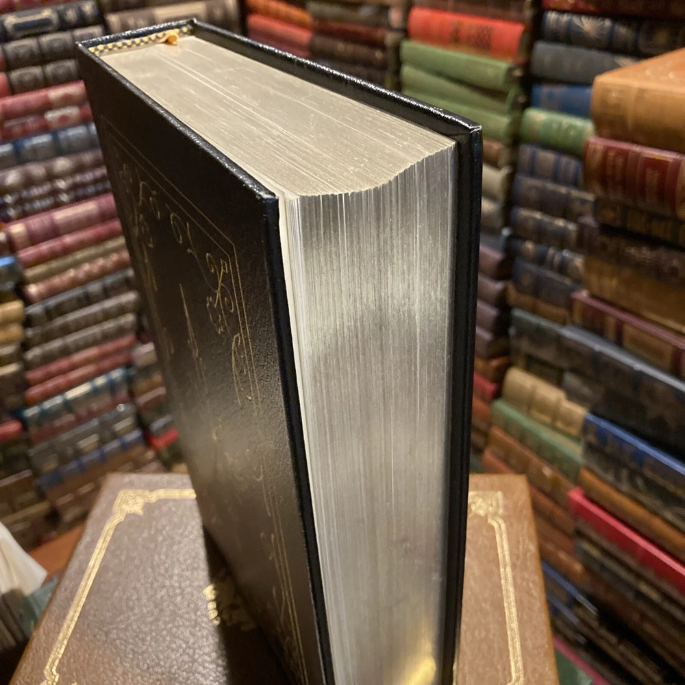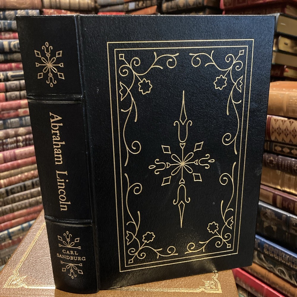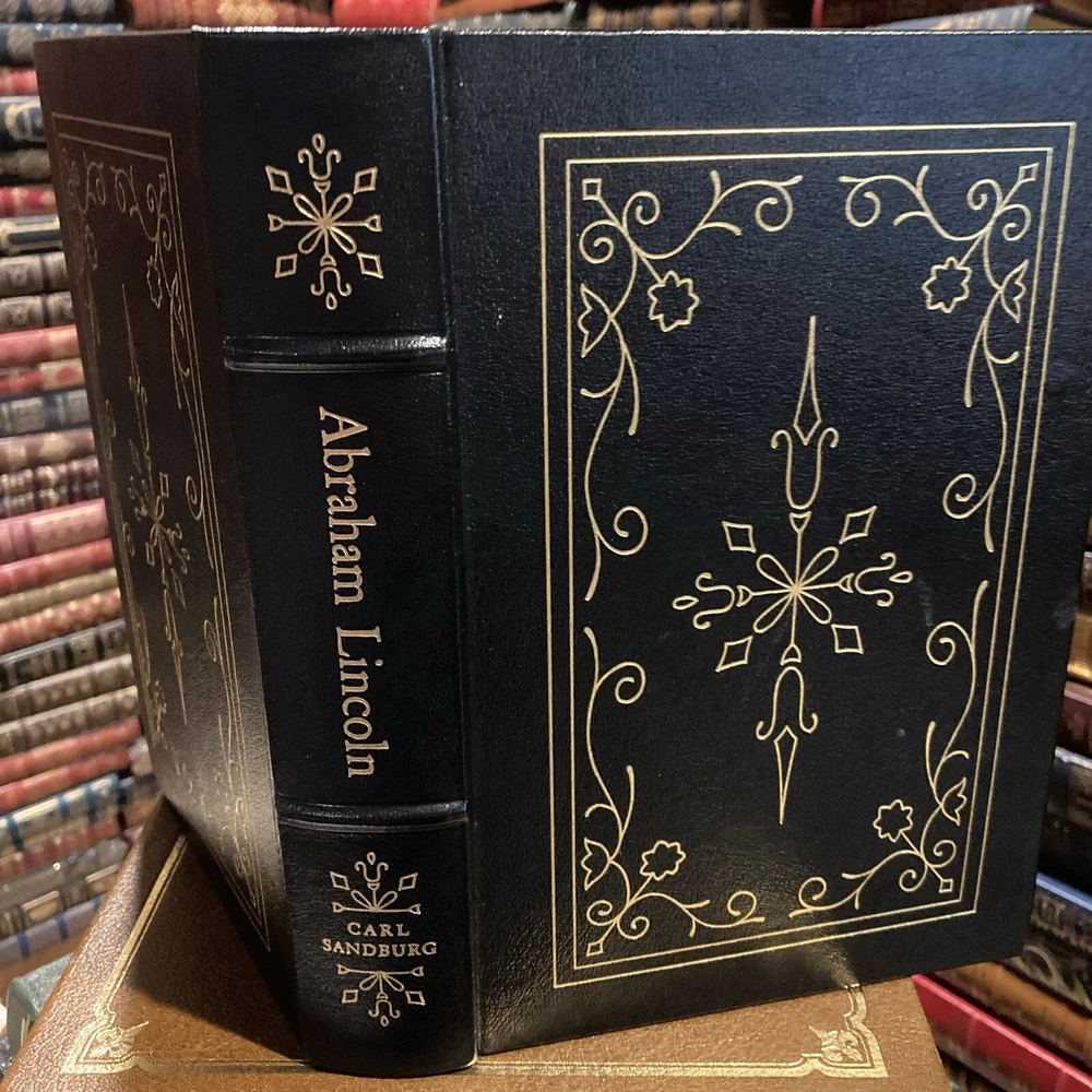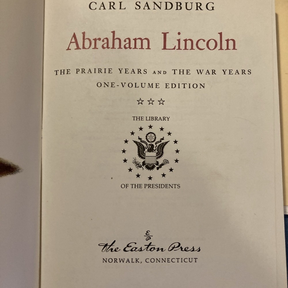 Easton Press leather edition of Carl Sandburg's "Abraham Lincoln: The Prairie Years and The War Years: One-Volume Edition," a COLLECTOR'S edition, Illustrated with photographs and engravings of the period, one of the LIBRARY OF THE PRESIDENTS seies, Reprinted with permission of Harcourt Brace, Frontispiece Portrait of Lincoln, published in 1984. Bound in hunter green leather, the book has decorative paper end leaves, acid-free paper, Symth-sewn binding, hubbed spine, gold gilding on three edges, a satin book marker---in Very good/near FINE condition---except for two 'blank' bookplates, one on the inside fly leaf and one on the second page---covering original owner's name . [See photo.] In the Preface, Sandburg wrote: "As a growing boy in an Illinois prairie town I saw marching men who had fought under Grant and Sherman; I listened to stories of old-timers who had known Abraham Lincoln. At twenty in 1898 I served in the 6th Illinois Volunteers. The Lincoln lore of that time and place was of the man in his Illinois backgrounds and settings. . .I have tried to compress the essential story of Lincoln the Man and President into one volume." Abraham Lincoln, who lived from 1809-1865, was born in a log cabin in KENTUCKY to illiterate and frontier parents. After navigating a flatboat to New Orleans, Lincoln returned to NEW SALEM, ILLINOIS, where he did various jobs while studying law. Lincoln was a volunteer in the BLACK HAWK WAR and later served in the Illinois State Legislature, 1831-37. He courted and married MARY TODD LINCOLN and was elected PRESIDENT of the U.S. in 1860. Lincoln never served a day in President's office when the country was not engaged in the bitter CIVIL WAR. Sandburg wrote: "Perhaps no other American held so definitely in himself both those elements---the genius of the Tragic---the spirit of the Comic. The fate of man, his burdens and crosses, the pity of circumstance, the extent of tragedy in human life, these stood forth in word shadows of the Lincoln utterance. . . And in contrast he came to be known nevertheless as the first authentic humorist to occupy the Executive Mansion in Washington, his gift of laughter and his flair for the funny being taken as a national belonging." Sandburg covers JEFFERSON DAVIS, a Mississippi cotton farmer, West Point graduate, Black Hawk Lieutenant, Mexican War veteran, U.S. Senator, Secretary of War under the Pierce Administration, orator, horseman, and man of fate. Lincoln's army of 75,000 volunteers Davis called a "posse comitatus" to round up 5,000,000 outlaws. . ." Davis was chosen to head the 11 states that had committed to him against 23 states formally still in the Union with Lincoln. Sandburg discusses other leaders of the period including: William Henry Herndon, Mary Todd Lincoln, Charles Sumner, Thurlow Weed, Harriet Beecher Stowe, Ulysses S. Grant, William Tecumseh Sherman, Jefferson Davis, Thaddeus Stevens, John Wilkes Booth, Gideon Wells, Salmon Portland Chase, Philip Henry Sheridan, William Henry Seward, Stephen Arnold Douglas, Robert E. Lee, George Brinton McClellan, and Horace Greeley. Often considered the "definitive biography of President Lincoln," this volume won the PULITZER PRIZE for History. 762 pages, including Sources and Bibliography and an Index. I offer Combined shipping.