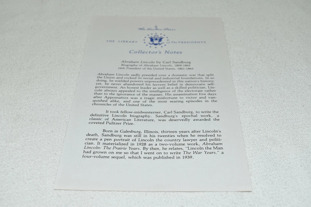 From the Easton Press Library of the Presidents Collector's Edition Series... Abraham Lincoln The Prairie Years and The War Years by Carl Sandburg Copyright 1986 by The Easton Press Bound in Premium Full Leather This volume contains all of the classic Easton Press trimmings: Premium Leather Decorated Endleaves Distinctive Cover Design Hubbed Spine, Accented in Real 22KT Gold Satin Ribbon Page Marker Gilded Page Edges Long-lasting, High Quality Acid-neutral Paper Smyth-sewn Pages for Strength and Durability A very scarce title in any condition, this copy is in Fine condition. The front and back covers are both in near perfect condition and the gilded page edges show hardly any wear (see pictures of all sides). There are no writing, markings, bookplates, or other signs of prior ownership in this book. The binding is tight and square without spine lean. This book is part of the Library of Presidents published by Easton Press and comes complete with a Collector's Notes. It would be a beautiful addition to your Easton Press collection. Overall, this copy is a grade collector's book. This book is very elusive in this superior condition, as only a limited number of them were ever published, so now is the time to act. Hopefully you can add this book to your collection and enjoy it in the years to come... Please Email Me With Any Questions You Might Have! Shipping Info: Buyer to Pay Shipping and Handling International Bidders Pay Extra Shipping Forms of Payment Accepted: Paypal Good luck and happy bidding! Powered by eBay Turbo Lister The free listing tool. List your items fast and easy and manage your active items.