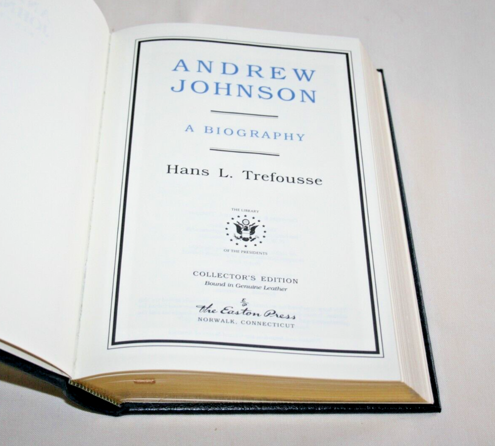 From the Easton Press Library of the Presidents Collector's Edition Series... Andrew Johnson A Biography by Hans L. Trefousse Copyright 1996 by The Easton Press Bound in Premium Full Leather This volume contains all of the classic Easton Press trimmings: Premium Leather Decorated Endleaves Distinctive Cover Design Hubbed Spine, Accented in Real 22KT Gold Satin Ribbon Page Marker Gilded Page Edges Long-lasting, High Quality Acid-neutral Paper Smyth-sewn Pages for Strength and Durability A very scarce title in any condition, this copy is in Absolute Mint and Unread condition. The front and back covers are both in Perfect condition and the gilded page edges show no wear at all! There are no writing, markings, bookplates, or other signs of prior ownership in this book. The binding is tight and square without spine lean. This book is part of the Library of Presidents published by Easton Press and comes complete with a Collector's Notes. It would be a beautiful addition to your Easton Press collection. This book is very elusive in this superior condition, as only a limited number of them were ever published, so now is the time to act. Hopefully you can add this book to your collection and enjoy it in the years to come... Please Email Me With Any Questions You Might Have! Shipping Info: Buyer to Pay Shipping and Handling International Bidders Pay Extra Shipping Good luck and happy bidding!