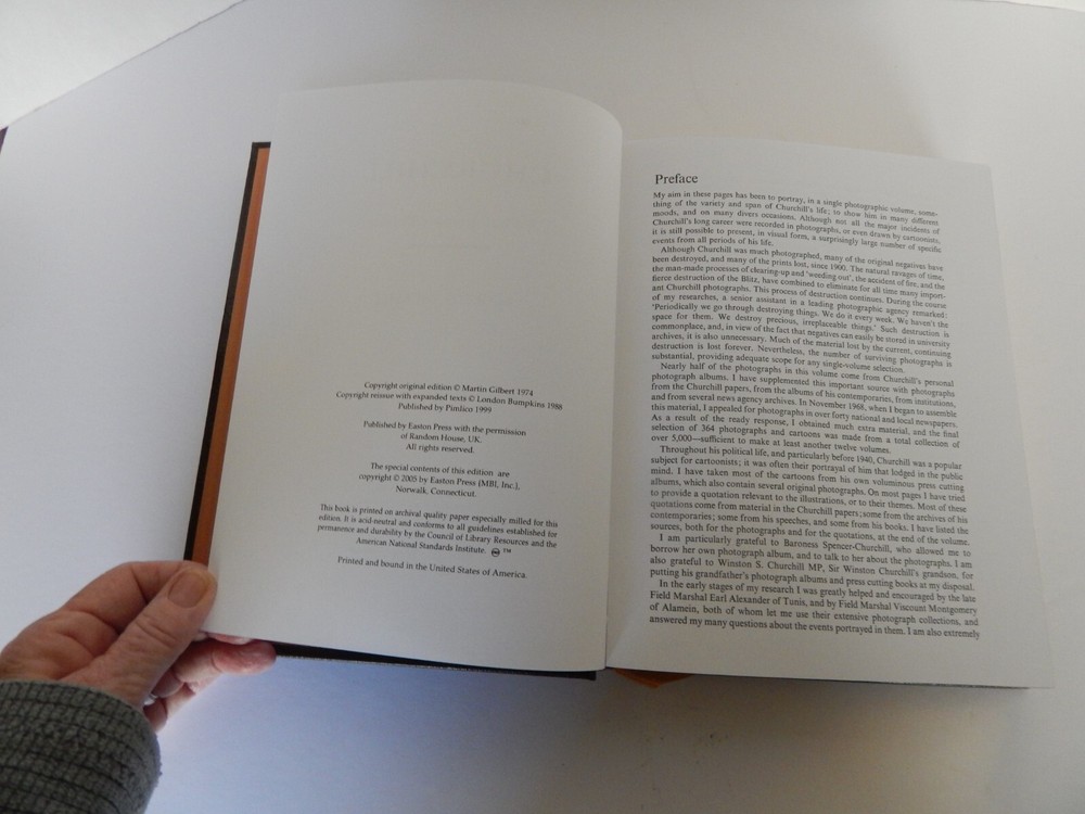 Easton Press CHURCHILL A Photographic Portrait by Martin Gilbert--HB Leather; 2005. Collector Edition. Like New Condition; not sure it has ever been read. Book measures 10" x 7.5" x 1.5". 364 Photos. To the best of my inspection no missing, torn or marked pages. Ribbon bookmark. See photos for best description. Smoke Free Home. Willing to combine shipping if you place items in your cart and request invoice before paying.