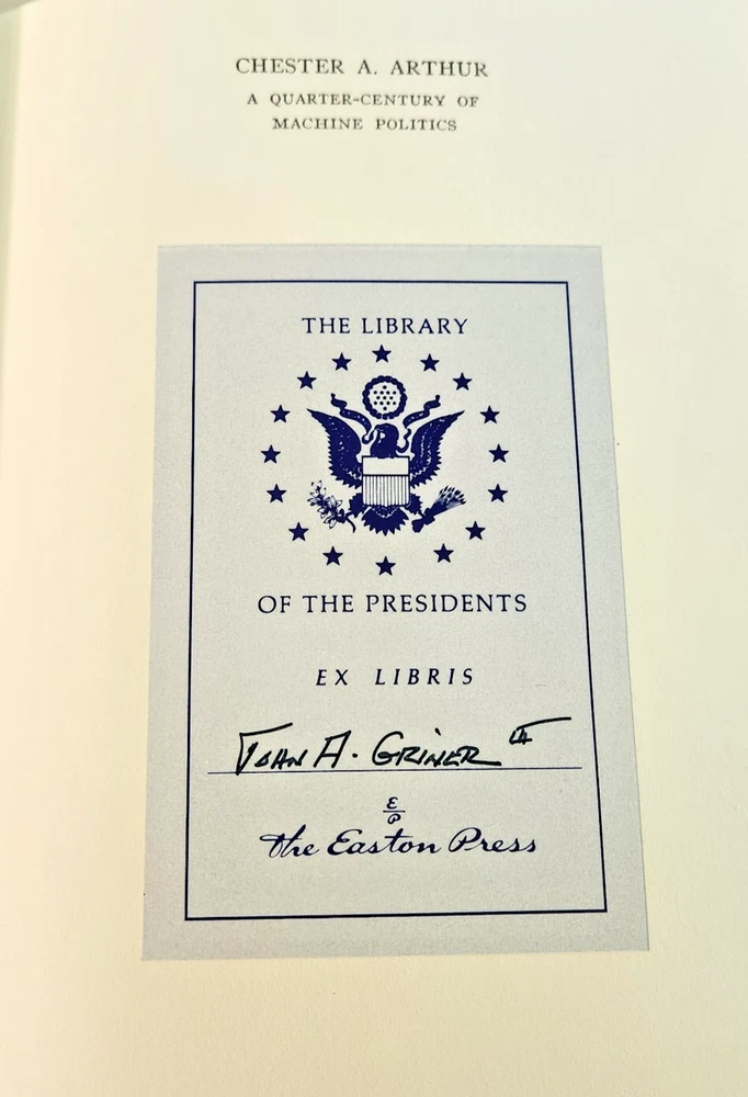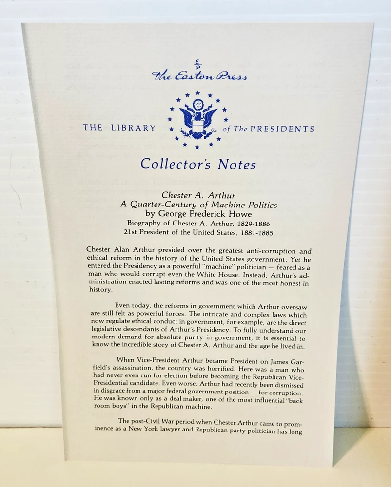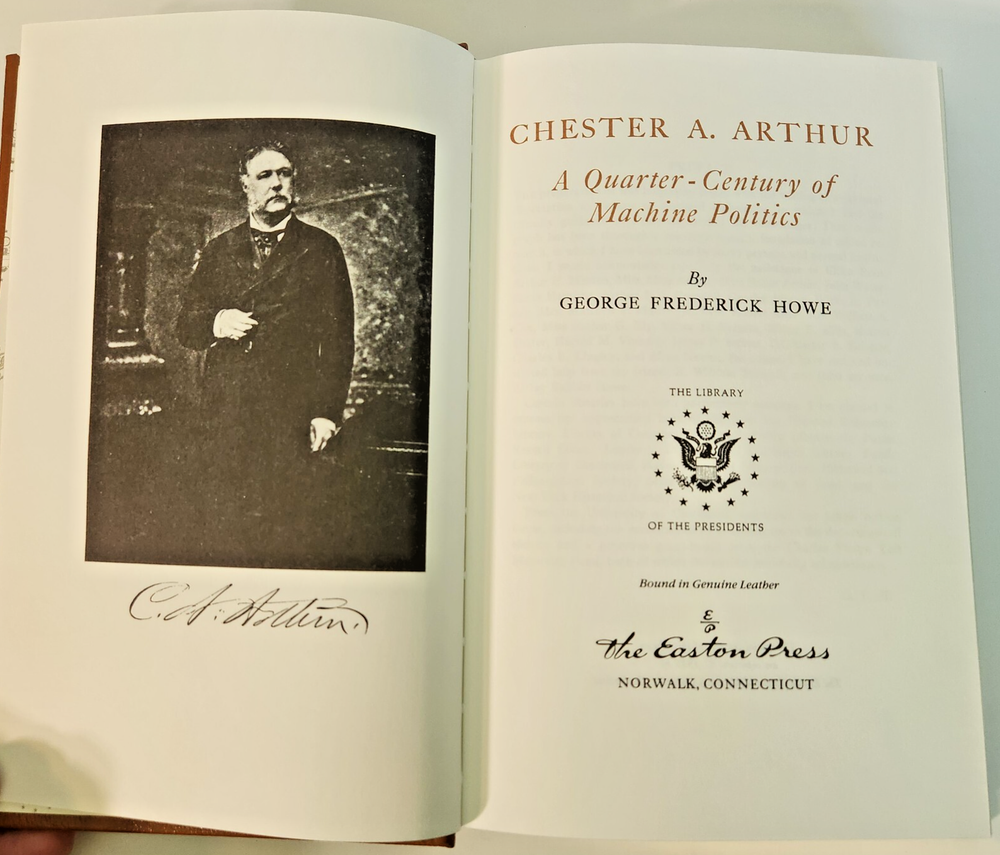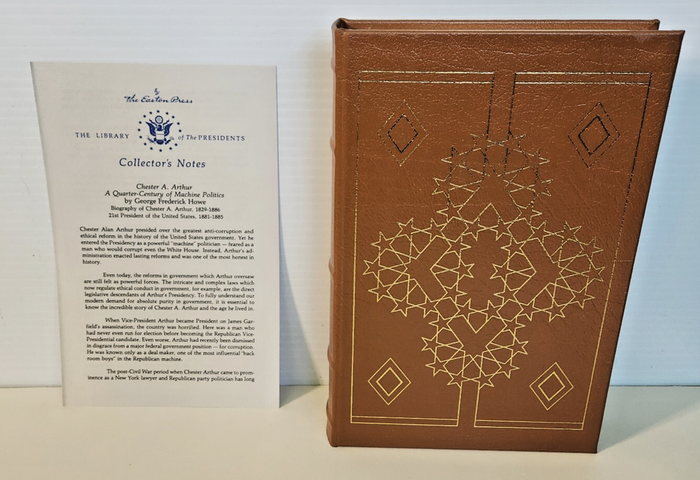 EASTON PRESS Chester A. Arthur George Frederick Howe 1987 Leather-bound Presidents Collector's Edition Series 22kt gold accents deeply inlaid on the "hubbed" spine. Heavy duty binding boards enhance the book’s durability. Superbly printed on acid-neutral paper that lasts for generations. Sewn pages — not just glued like ordinary books. Handsome moiré end pages and a satin-ribbon page marker. Gilded page ends. Printed and bound in the USA using imported materials. Superb craftsmanship and commitment to quality. Condition – Excellent "like new"; ex Libris attached bookplate ; may have some dust from storage. Smoke free history.