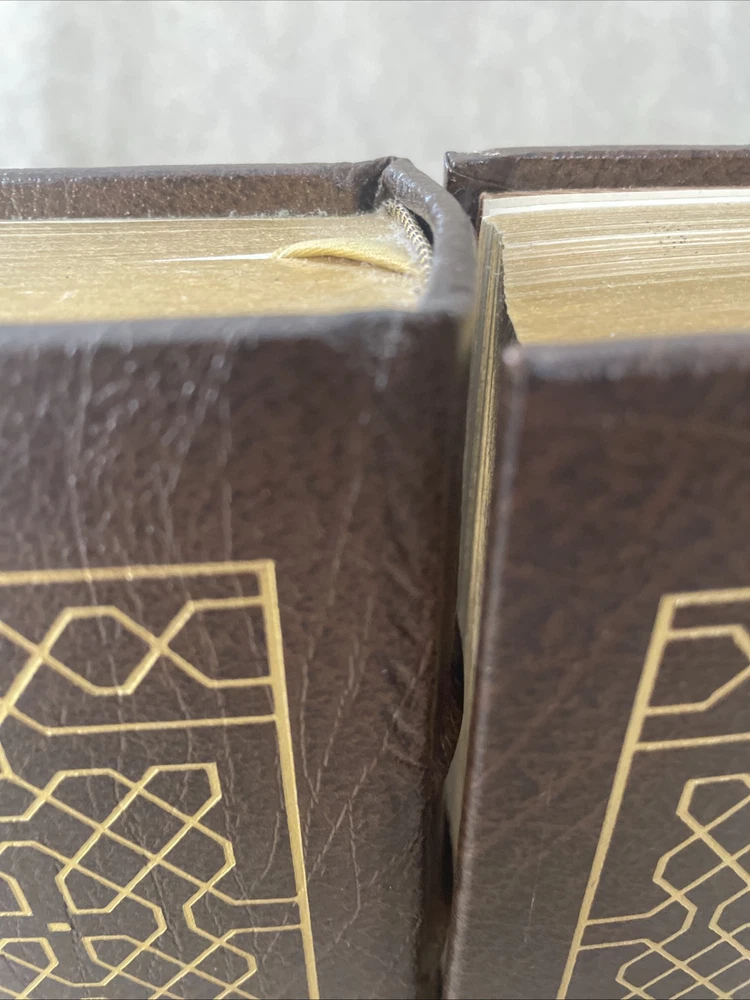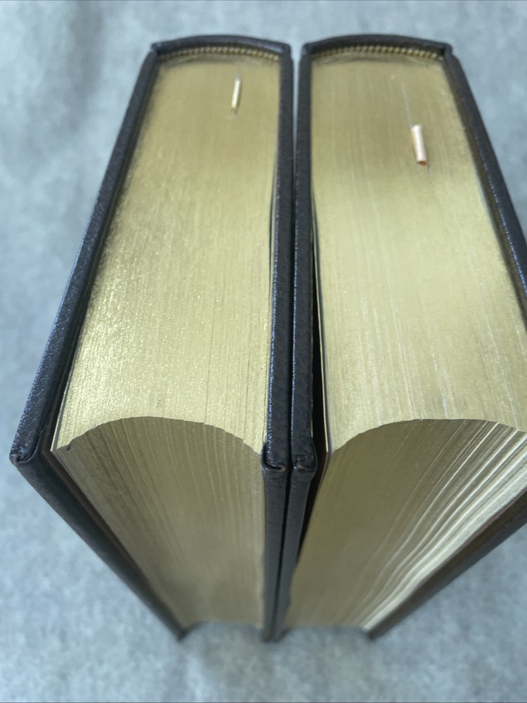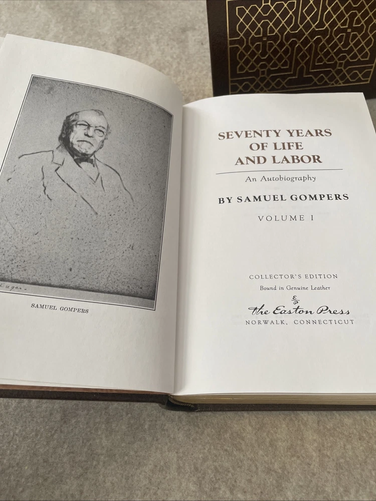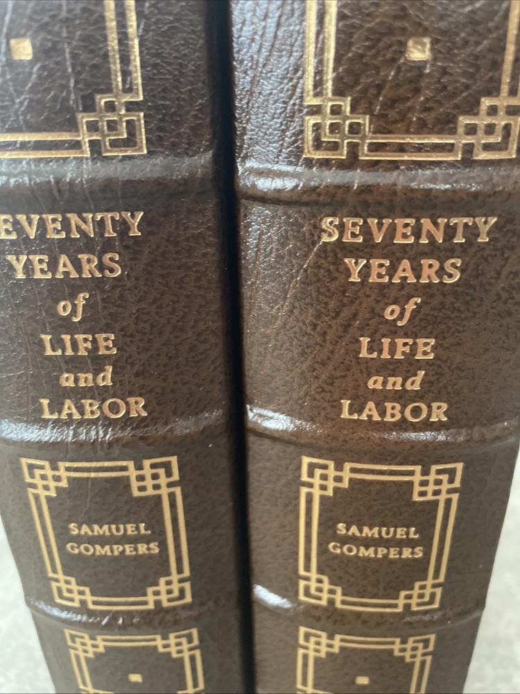 Easton Press Collector's Edition Seventy Years of Life and Labor by Samuel Gompers in 2 volumes The books are full leather. There are no bookplates in the books, but there is a light stain inside the front cover of each where one had been. These books are in near mint condition with one light bump to a corner in volume 2 only. The gold on the covers looks like new. The end pages show no fading. The gilt on the edge of the pages is in excellent condition with light scratches here and there. Please see photos. We try to describe as accurately as possible so you will be satisfied with your purchase. We have more books from this set on eBay and we would be happy to combine on shipping to save you money. All books are sent with insurance via USPS Media Mail.