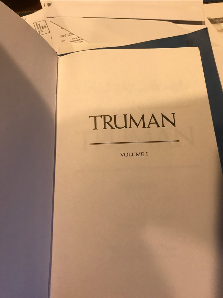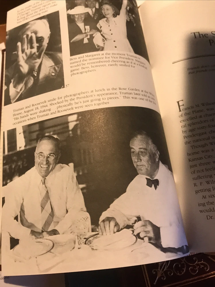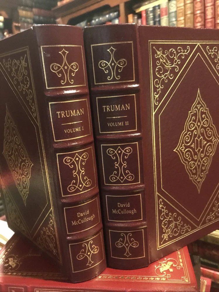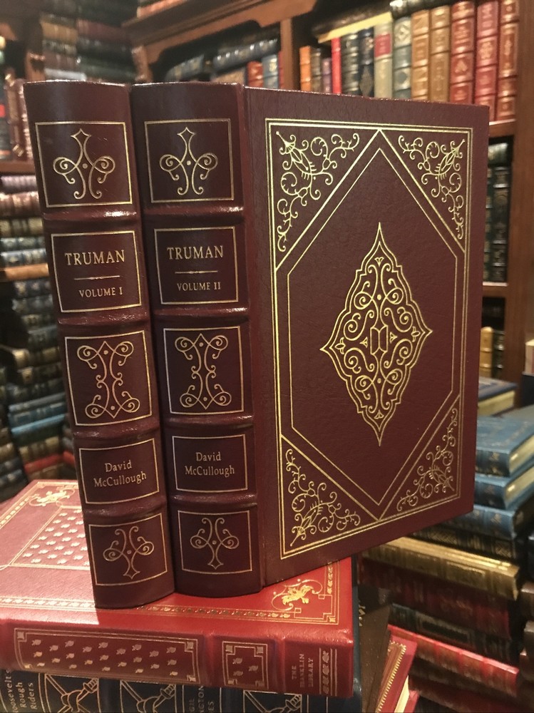Easton Press leather edition of David McCullough's "Truman," COLLECTOR'S editions, two of the LIBRARY OF THE PRESIDENTS series, published in 1994. Bound in hunter green leather, the books have decorative paper end leaves, satin book marker, acid-free paper, Symth-sewn binding, hubbed spine, gold gilding on three edges---in near FINE condition---except for blank attached bookplates on inside fly leaf and a small crimped book press on first two pages of each volume. COLLECTOR'S NOTE is included. Harry S. Truman, who lived from 1884--1972, was the 33rd President of the U.S., 1945-1953. Ten years in the writing, this remarkable Pulitzer Prize-winning biography began where Truman began, on the Western Missouri frontier, where he lived a hard, but in many ways typical, turn-of-the-century boyhood on the family farm. With no formal education beyond high school, he was 33 before he left the family farm to enlist in the army. When he returned he married his childhood sweetheart, BESS WALLACE. At 38, after his haberdashery business went bankrupt, Truman was plucked from obscurity by KANSAS CITY'S Democratic political boss, TOM PENDERGAST, the uncle of an army buddy. Pendergast orchestrated Truman's election to county judge, and then, in 1934, to the U.S. Senate. Once in Washington, Truman was often scorned as the "Senator from Pendergast." He became President Franklin D. Roosevelt's running mate in 1944 and less than a year later, he assumed the Presidency. Truman dealt with GEORGE MARSHALL, DEAN ACHESON, and WINSTON CHURCHILL. He was responsible for reconstructing America's foreign policy after WWII, and for the MARSHALL PLAN, NATO, and the BERLIN AIRLIFT. He established the Defense Department, started the CIA, approved the development of the hydrogen bomb, and made a forceful response to the invasion of South Korea. He even stood up to DOUGLAS MACARTHUR over the principle of civilian control over the military. Truman wasted no words in expressing how he felt. "Give 'em Hell Harry," "Mr. Prima Donna," "Brass Hat," "Five Star MacArthur," "the Sabotage Press," "The buck stops here," "The Great White Prison"---Harry was feisty and sensitive. John Hopkins University history professor David McCullough said: "As much as any president since Lincoln, he brought to the highest office the language and values of the common American people. He held to the old guidelines: work hard, do your best, speak the truth, assumer no airs, trust in God, have no fear. . .qualities that made him a figure of world stature, both a great and good man, and a great American president." After the presidency, Truman and his wife Bess returned to Independence, Missouri, where they adapted to country living and enjoyed their retirement years. Truman worked establishing his Presidential Library. Even in retirement, when President Truman arose, he dressed in a shirt, necktie, and jacket and he wore this until he undressed for bed. He and Bess ate in the dining room each evening. Yale-educated historian David McCullough has won both the Francis Parkman Prize, the Los Angeles Times Book Award, and is a two-time winner of the National Book Award. These two volumes have 1117 pages, including a Bibliography and Index---and are considered by many historians as the "definitive" biography. I offer Combined shipping.