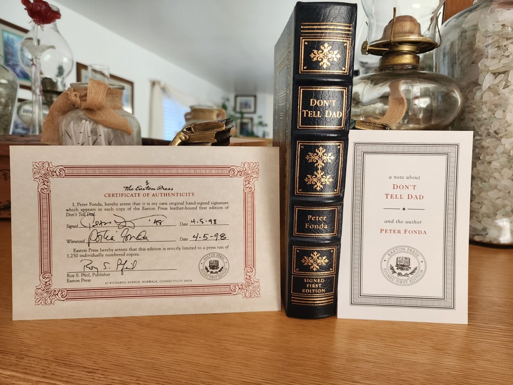 The product is a first edition of "Don't Tell Dad" by Peter Fonda, a signed autobiography published by Easton Press. The book is bound in leather and is a collectible item for fans of Peter Fonda and those interested in biographies. This edition holds a special significance as it is signed by the author himself, adding to its rarity and appeal to collectors of antiquarian books.