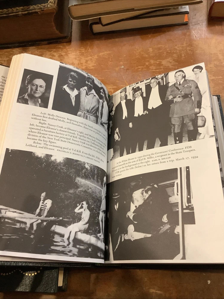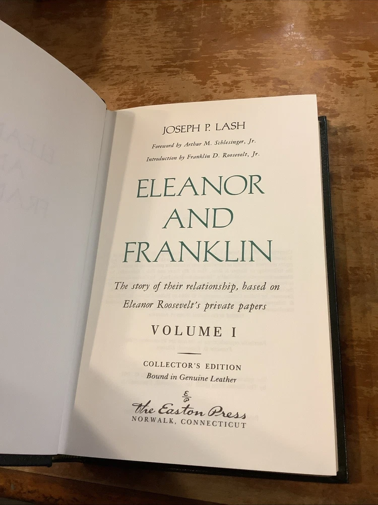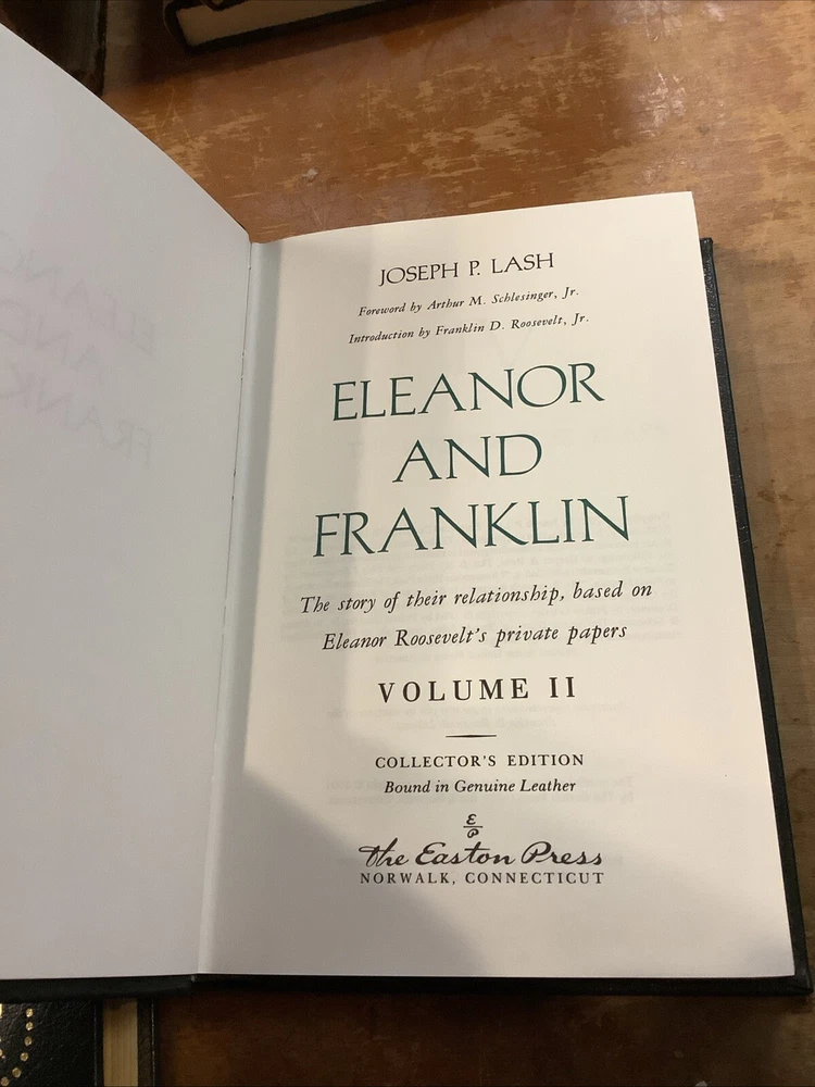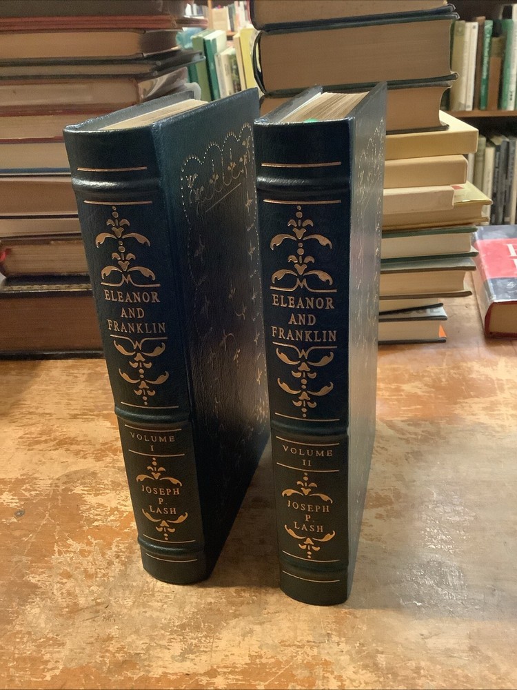 Eleanor and Franklin by Joseph P. Lash. Two volume Easton Press set, 1991. Hardcover bound in leather with gilt page edges and ribbon bookmark. No markings or bookplates. Volume 2 has a small scuff to rear corner.