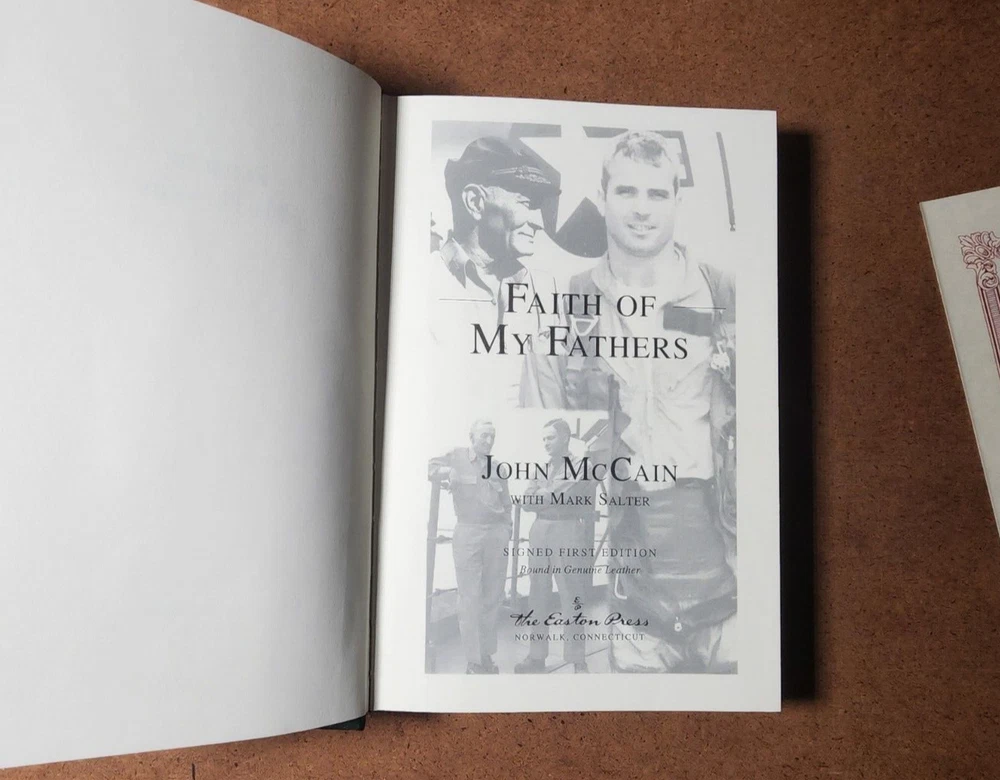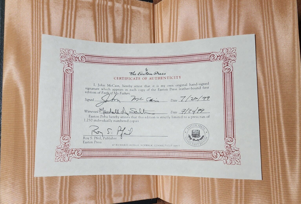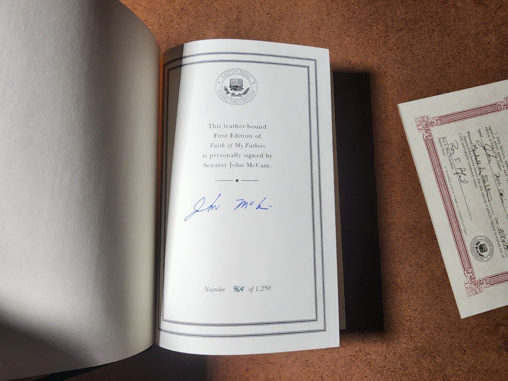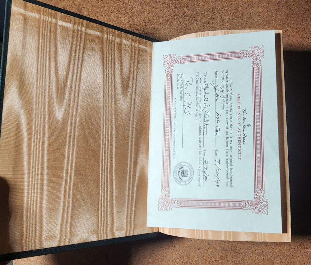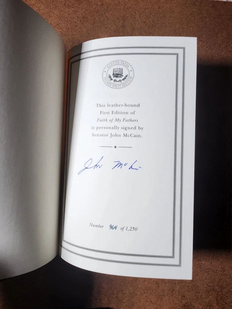 Easton Press FAITH OF MY FATHERS John McCain SIGNED 1st Edtn w/COA - Leather Bound This book is in very good condition. All pages are intact. NO rips or damage. This book has been hand SIGNED by John McCain as shown. No other markings. This book comes with a COA which has also been hand SIGNED by John McCain. This book is a First Edition. This book is also a Limited Edition 964/1250. Leather bound hardcover. John McCain American politician, military officer, and presidential candidate (1936–2018) John Sidney McCain III was an American politician and United States Navy officer who served as a United States senator from Arizona from 1987 until his death in 2018. He previously served two terms in the United States House of Representatives and was the Republican nominee for president of the United States in the 2008 election. McCain was a son of Admiral John S. McCain Jr. and grandson of Admiral John S. McCain Sr. He graduated from the United States Naval Academy in 1958 and received a commission in the United States Navy. McCain became a naval aviator and flew ground-attack aircraft from aircraft carriers. During the Vietnam War, he almost died in the 1967 USS Forrestal fire. While on a bombing mission during Operation Rolling Thunder over Hanoi in October 1967, McCain was shot down, seriously injured, and captured by the North Vietnamese. He was a prisoner of war until 1973. McCain experienced episodes of torture and refused an out-of-sequence early release. Born John Sidney McCain III, August 29, 1936, Coco Solo, Panama Canal Zone Age at death 81 years Died August 25, 2018, Cornville, Arizona, U.S. Resting place United States Naval Academy Cemetery We have been selling books online since 2003. Our book stock covers a wide range of subjects such as First editions, Signed editions, Fiction, History, and many more. Our Guarantee Any purchase can be returned for any reason; we will fully refund the purchase price if notified within 30 days of receipt and the book(s) is returned in the same condition as sent. Shipping charges will also be refunded if the book has been incorrectly described. Shipping All books shipped to US destinations are sent US Post Office Media Mail. Faster shipping is available, please ask before paying. We will combine shipping on items purchased at the same time. International Buyers - Please Note: Import duties, taxes, and charges are not included in the item price or shipping cost. These charges are the buyer's responsibility. Please check with your country's customs office to determine what these additional costs will be prior to bidding or buying.