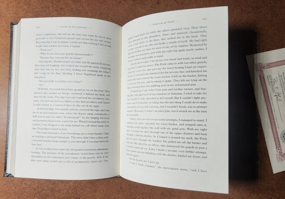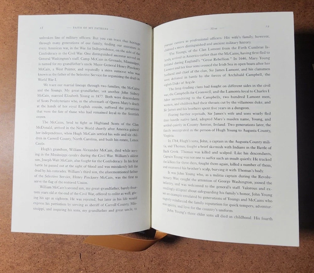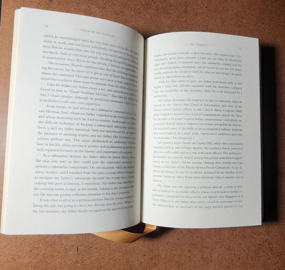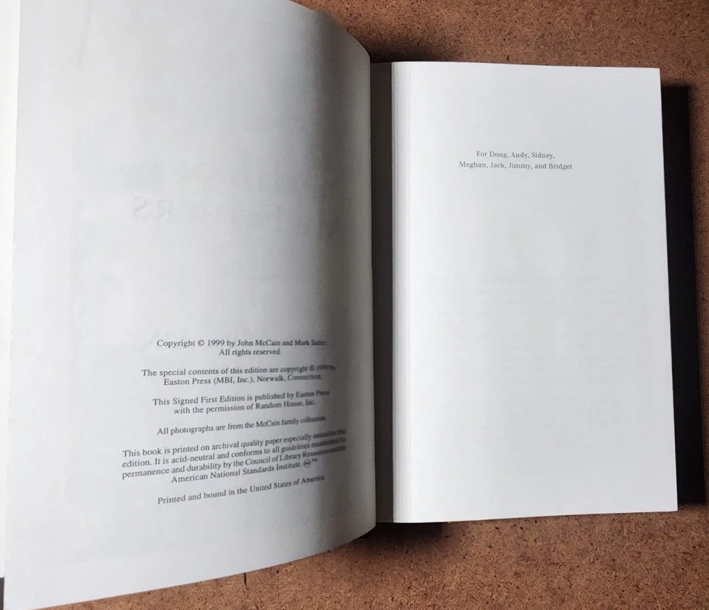 Easton Press FAITH OF MY FATHERS John McCain SIGNED 1st Edtn w/COA - Leather Bound This book is in very good condition. All pages are intact. NO rips or damage. This book has been hand SIGNED by John McCain as shown. No other markings. This book comes with a COA which has also been hand SIGNED by John McCain. This book is a First Edition. This book is also a Limited Edition 964/1250. Leather bound hardcover. John McCain American politician, military officer, and presidential candidate (1936–2018) John Sidney McCain III was an American politician and United States Navy officer who served as a United States senator from Arizona from 1987 until his death in 2018. He previously served two terms in the United States House of Representatives and was the Republican nominee for president of the United States in the 2008 election. McCain was a son of Admiral John S. McCain Jr. and grandson of Admiral John S. McCain Sr. He graduated from the United States Naval Academy in 1958 and received a commission in the United States Navy. McCain became a naval aviator and flew ground-attack aircraft from aircraft carriers. During the Vietnam War, he almost died in the 1967 USS Forrestal fire. While on a bombing mission during Operation Rolling Thunder over Hanoi in October 1967, McCain was shot down, seriously injured, and captured by the North Vietnamese. He was a prisoner of war until 1973. McCain experienced episodes of torture and refused an out-of-sequence early release. Born John Sidney McCain III, August 29, 1936, Coco Solo, Panama Canal Zone Age at death 81 years Died August 25, 2018, Cornville, Arizona, U.S. Resting place United States Naval Academy Cemetery We have been selling books online since 2003. Our book stock covers a wide range of subjects such as First editions, Signed editions, Fiction, History, and many more. Our Guarantee Any purchase can be returned for any reason; we will fully refund the purchase price if notified within 30 days of receipt and the book(s) is returned in the same condition as sent. Shipping charges will also be refunded if the book has been incorrectly described. Shipping All books shipped to US destinations are sent US Post Office Media Mail. Faster shipping is available, please ask before paying. We will combine shipping on items purchased at the same time. International Buyers - Please Note: Import duties, taxes, and charges are not included in the item price or shipping cost. These charges are the buyer's responsibility. Please check with your country's customs office to determine what these additional costs will be prior to bidding or buying.