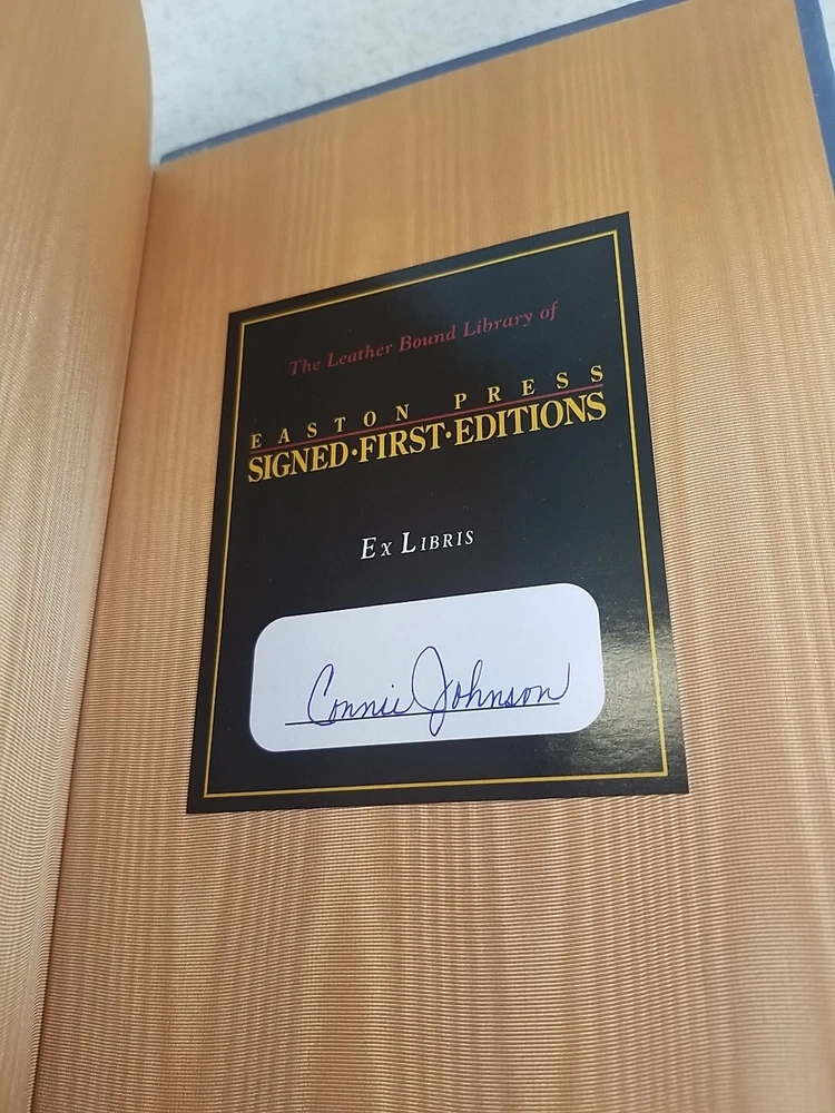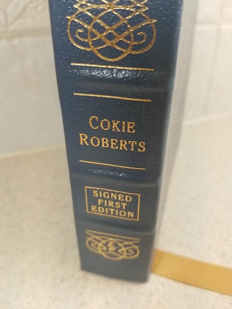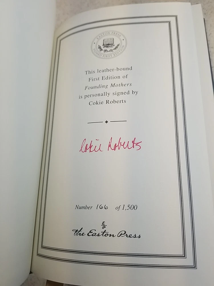 This is a signed first edition leather-bound book titled "FOUNDING MOTHERS" by Cokie Roberts, published by Easton Press. This limited edition collector's item focuses on historical biographies and autobiographies, offering a unique insight into the lives of the founding mothers of the United States. The high-quality leather binding adds to the timeless appeal of this special edition, making it a valuable addition to any book collection for history enthusiasts and collectors alike. It is clean showing very little wear. I will note a book plate on the inside of the back cover from the original owner. Please see all of my pics and please contact me with any questions. I will respond promptly. Thanks for looking!
