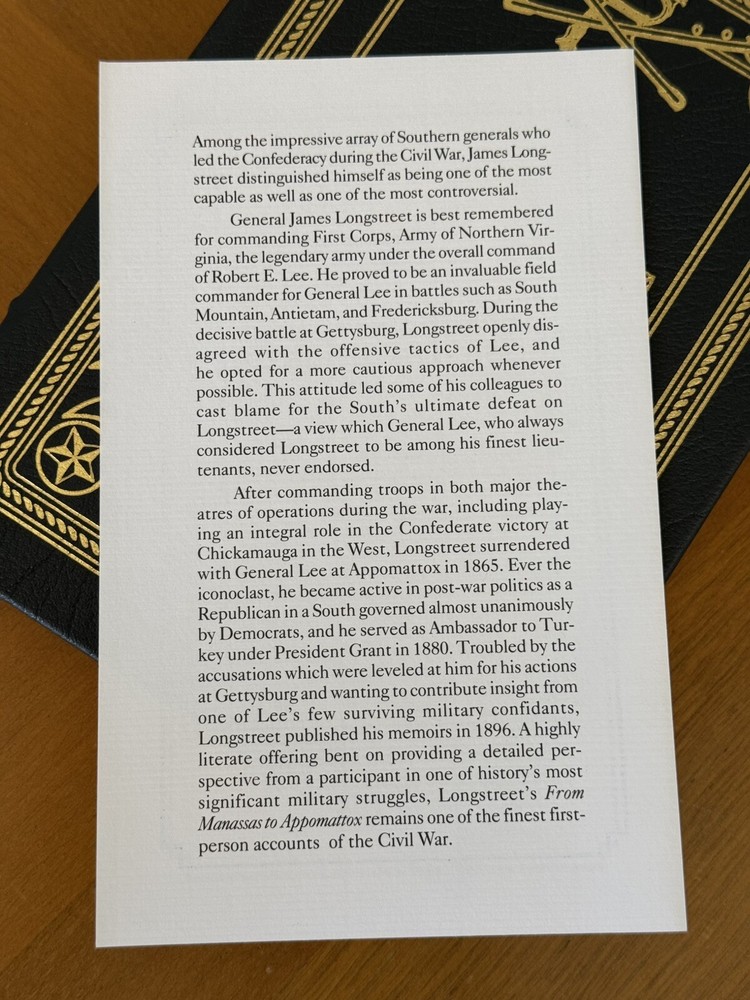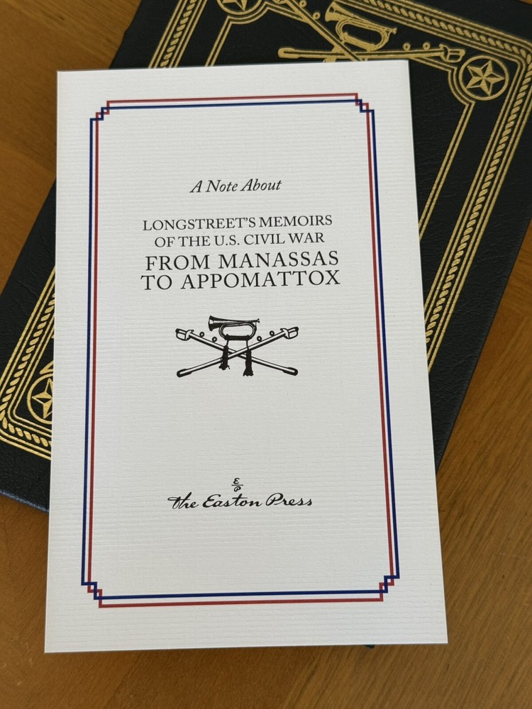 Title : From Manassas to Appomattox Author : James Longstreet Publisher : The Easton Press Copyright : 1998 Condition : Mint. Contains attached bookplate from previous owner. Externals : Full leatherbound hardcover edition. No Marks or blemishes to spine or boards. No bumped corners. No marks to gold page gilt edges. Internals : This book contains an affixed Easton Press bookplate from previous owner. Crisp, clean pages with no marks or writing anywhere. Easton Press Features Include : Full Genuine Leather Binding w/ 22kt Gold Inlay Design 22kt Gold Outside Page Edges Smyth Sewn Binding Acid Neutral Paper Silk Moire End Sheets Satin Ribbon Page Marker Your purchase will be packed out well protected to ensure it arrives in its beautiful condition. Ships promptly in 1-2 business days via USPS Media Mail (option to upgrade to USPS Priority Mail). Comes from a smoke free home with no pets. This item is guaranteed to be as described so you may buy with confidence. Thank you for looking!