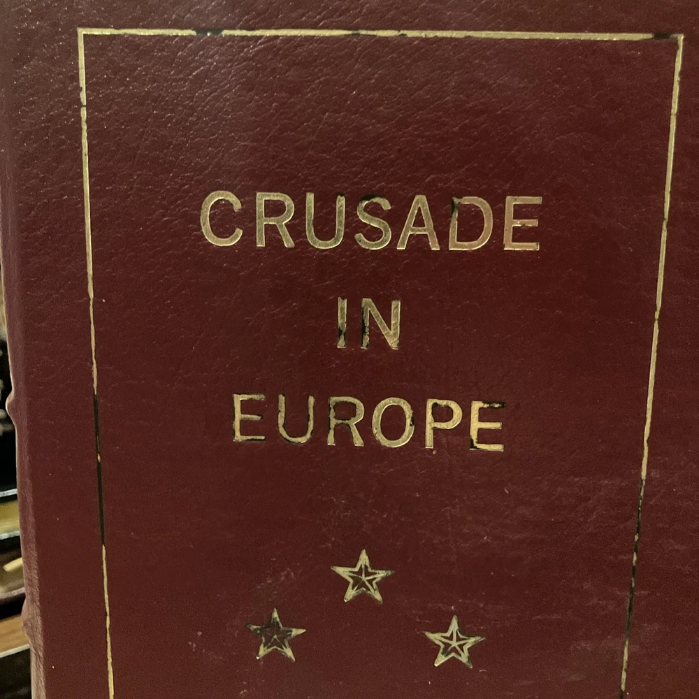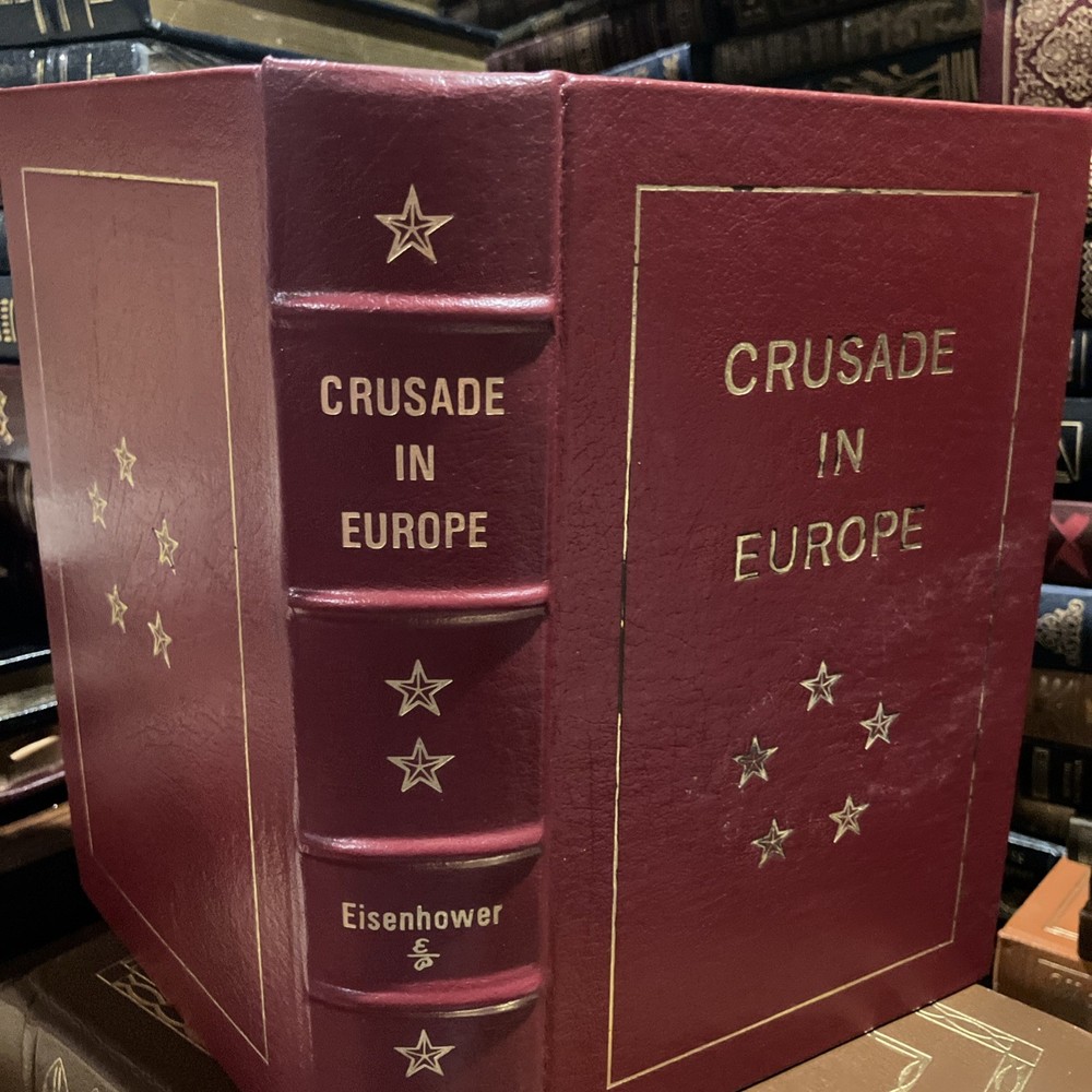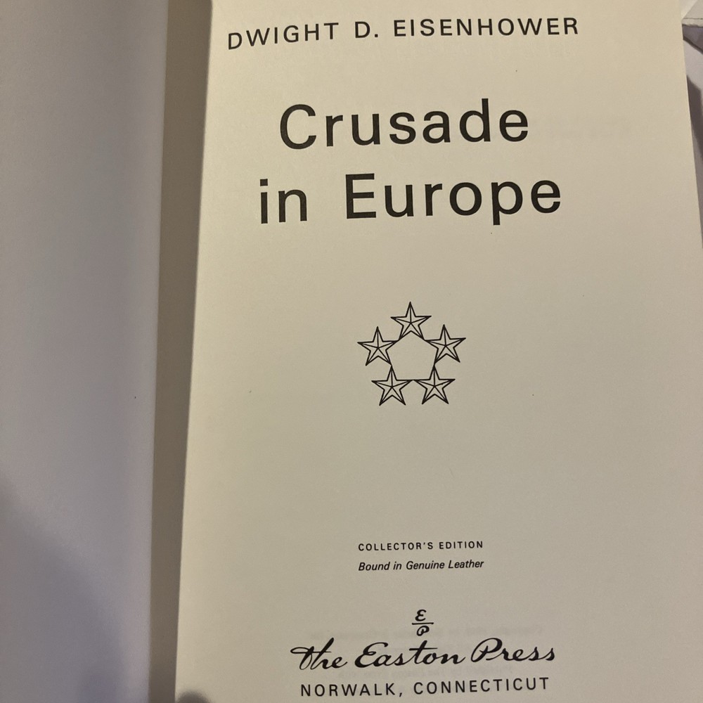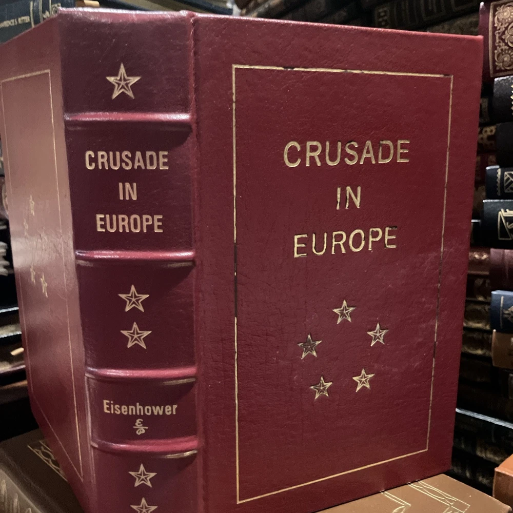 Easton Press leather edition of Dwight D. Eisenhower's "Crusade in Europe," a COLLECTOR'S edition, Period Maps, one of the LIBRARY OF MILITARY HISTORY series, published in 1948. Bound in deep red l eather, the book has camel tan French moire end leaves, satin book marker, hubbed spine, acid-free paper, Symth-sewn binding, gold gilding on three edges---in near FINE condition---except for a 'blank' attached bookplate on second blank page. Born in Texas but reared in Abilene, Kansas, Dwight Eisenhower, who lived from 1890-1969, described himself as a "Kansas farm boy." He possessed a razor-sharp mind and extraordinary organizational skills. Eisenhower was appointed to WEST POINT in 1911. At six feet tall, weighing 170 pounds, with strong, broad shoulders, and rock-hard muscles, he was the embodiment of a manly athlete. Ike married MAMIE DOUD in 1916. Eisenhower arrived in Manila with Douglas MacArthur to help build a Philippine defense force, but he admitted bitter disappointment with what he perceived as a dead-end assignment and a dislike for his superior. By 1939, Ike had requested a transfer back to the States. When Pearl Harbor set the American war machine in motion, Eisenhower got the opportunity he had been waiting for. "Crusade in Europe" is a book of wartime memoirs, originally published in 1948. The book recounts his appointment by General George Marshall to plan a defense of the Philippines and continues to describe his appointment to, and execution of the role of Supreme Allied Commander in Northern Europe. Ike was often frustrated with those in power. In the Allied Headquarters at Reims, Field Marshall Jodl signed the instrument of German surrender on May 7, 1945. At midnight of the next day there ended, in Europe, a conflict that had been raging since September 1, 1939. Between these two dates millions of Europeans had been killed. All Europe west of the Rhine had, with minor exceptions, lived for more than four years under the domination of an occupying army. Free institutions and free speech had disappeared. Economics were broken and industry prostrated. In Germany, her bridges were down, her cities in ruins, and her great industrial capacity practically paralyzed. Great Britain had exhausted herself economically and financially to carry on her part of the war. Russian industry west of the Volga had been almost obliterated. American had not been spared: by V-J Day in the Pacific, 322, 188 of her youth had been lost in battle or had died in the service and approximately 700,000 had been wounded. "Crusade in Europe" provides an intimate look at World history. With a big smile, warm manner, sincerity, and integrity, Eisenhower had irresistible charisma, charming everyone who met him, from ordinary soldiers to world leaders. Stephen Ambrose, professor of history at the University of New Orleans, wrote: "Dwight Eisenhower was a great and good man," and even "Ike's" harshest critics agreed. He was a heroic figure, immensely popular and admired throughout the world. Ike had none of Patton's flare, nothing of Field Marshall Montgomery's flamboyance, little of De Gaulle's imposing personality; but he had a rare talent for managing people, a genius for planning, and a successful long-term objective. "Crusade in Europe" is a brilliant and unusual because Eisenhower was a commanding officer, and he wrote it himself---without ghost writers. It's a soldier's personal narrative as naturally told and moving as a letter from a foxhole. Eisenhower offers private opinions of, and personal experiences of Patton, Montgomery, Bradley, Marshall, MacArthur, and Roosevelt. On D- Day when the Allies invaded Hitler's Europe, Eisenhower controlled nearly three million troops, over 10,000 aircraft, and more than 6,00 sea-going vessels. Neither Napoleon nor Alexander the Great ever led any army of that size or power. Later Dwight Eisenhower became the 34th President of the U.S., 1953-1961. 559 pages, including an Index. I offer Combined shipping .