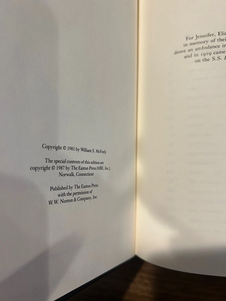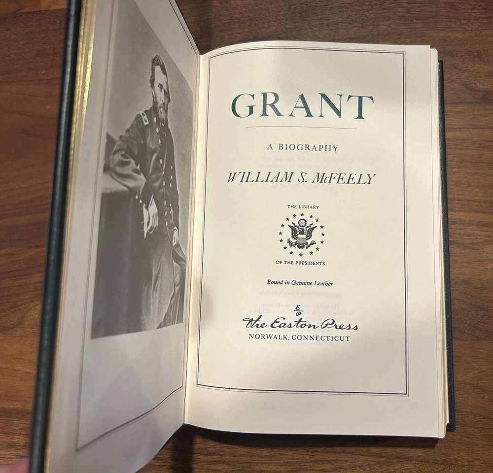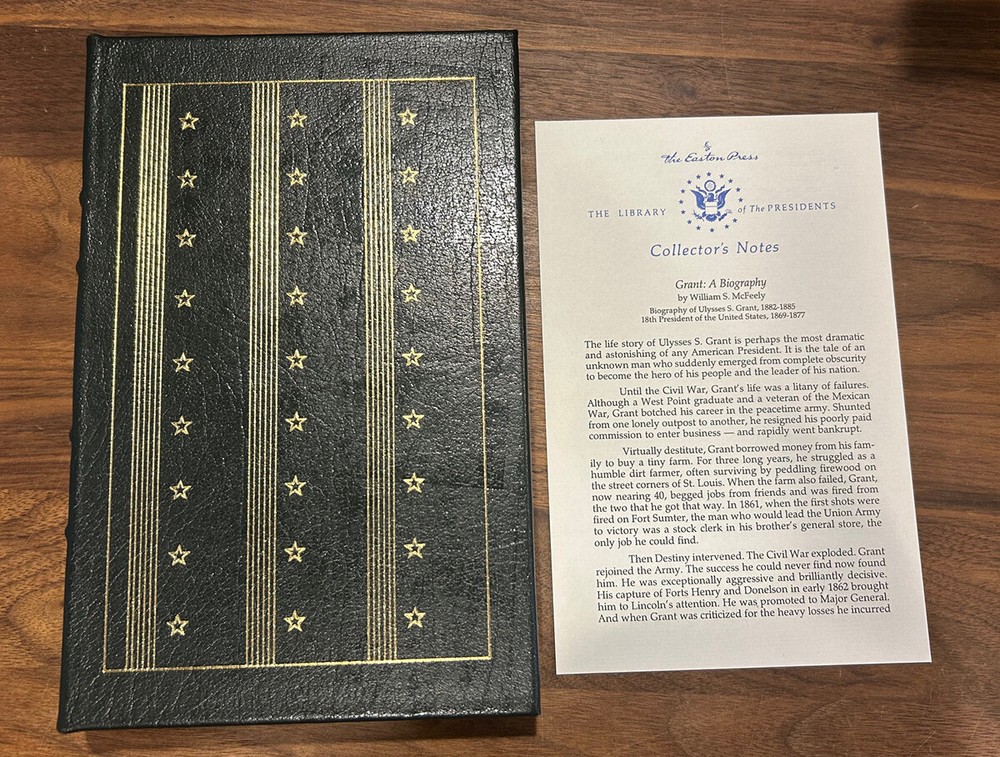 Grant, A Biography - William S. McFeely - Collector's Edition / Easton Press Hardcover Norwalk, Connecticut Easton Press, Leather Bound Limited Edition. Includes Collector's Notes. Book accented in 22kt gold. Printed on archival paper with gilded edges. The endsheets are of moire fabric with a silk ribbon page marker. Smyth sewing and concealed muslin joints to ensure the highest quality binding. This book is in full leather with hubbed spines. There is some damage on back bottom corner - see pics for details. Bind is extremely tight like new. William S. McFeely Grant, A Biography Special Edition Bound in Genuine Leather The Easton Press 1987 Includes Collector's Notes