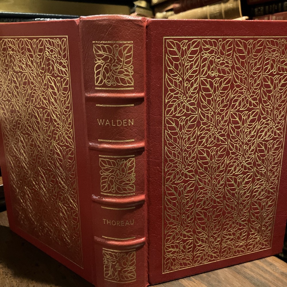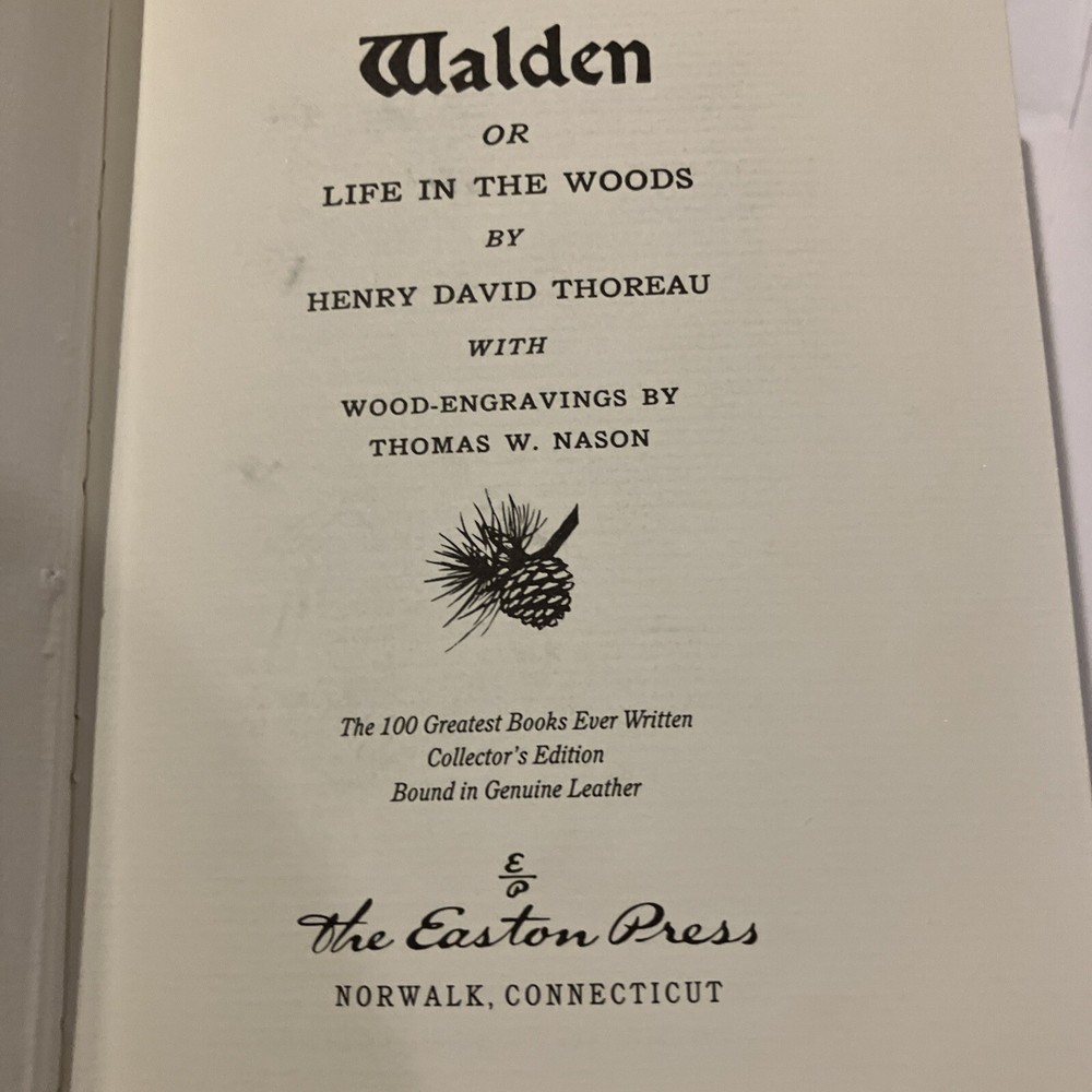 Easton Press leather edition of Henry David Thoreau's "Walden, or Life in the Woods," a Limited edition, Designed by Carl Purlington Rollins and Illustrated with Wood-Engravings by Thomas W. Nason made at Walden Pond, one of the 100 GREATEST BOOKS EVER WRITTEN series, published in 1981. Bound in burgundy leather, the book has tan French moire silk end leaves, acid-free paper, Symth-sewn binding, hubbed spine, a satin book marker, gold gilding on three edges---in near FINE condition---except for a blank attached bookplate on second blank page. Henry David Thoreau, who lived from 1817-1862, was born in CONCORD, Massachusetts, graduated from HARVARD in 1837, and later taught school. Thoreau built himself a hut where he lived from July 4, 1845, to Sept. 1847. Thoreau once spent the night in the Concord jail because he refused to pay taxes! First published in 1854, " Walden" details Thoreau's experiences over the course of two years, two months, and two days in a cabin he built near WALDEN POND , amidst woodland owned by his friend and mentor RALPH WALDO EMERSON. The book compresses the time into a single calendar year and uses passages of four seasons to symbolize human development. By immersing himself in nature, Thoreau hoped to gain a more objective understanding of society through personal introspection. Simple living and self-sufficiency were Thoreau's other goals, and the whole project was inspired by transcendentalist philosophy. Thoreau wanted to live in harmony with nature. 335 pages. I offer Combined shipping.