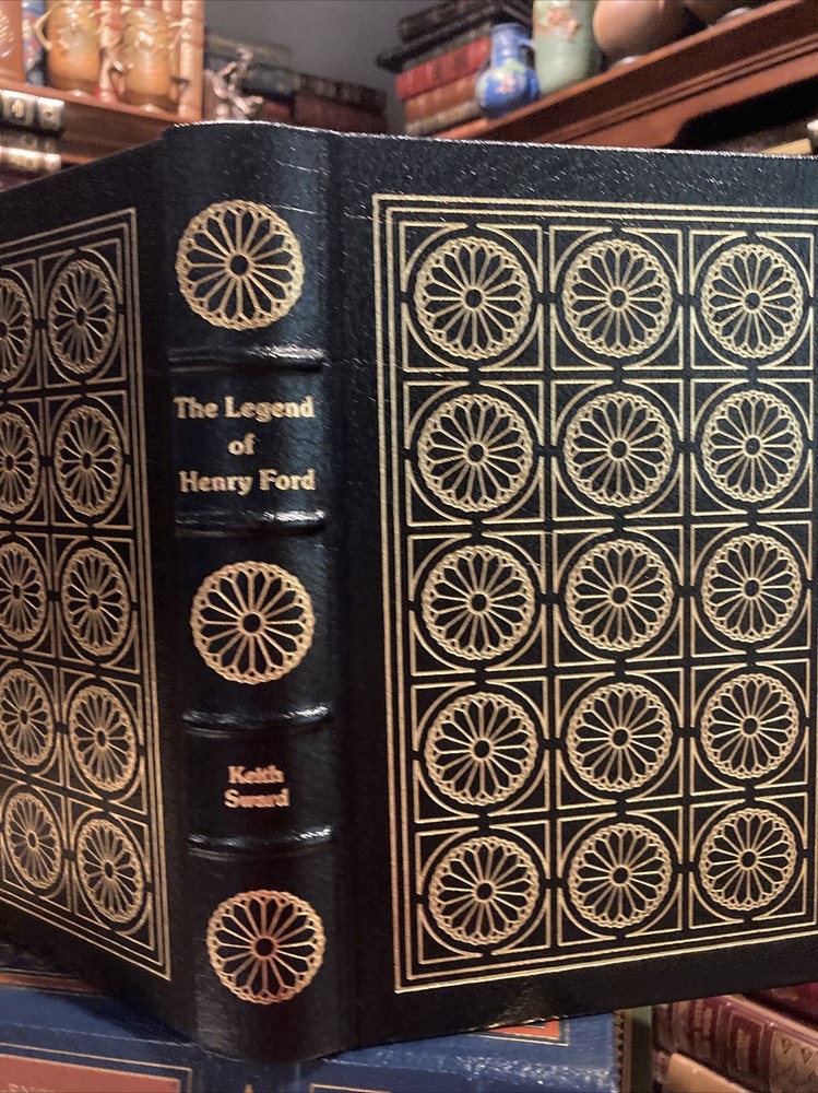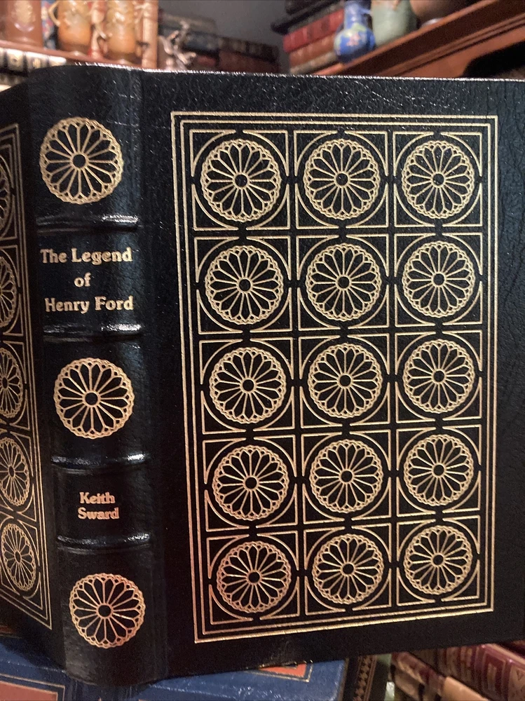 Easton Press leather edition of Keith Sward's "The Legend of Henry Ford," Foreword by G.R. Funkhouser, Ph.D., one of the LIBRARY OF GREAT LIVES series, published in 1989. Bound in hunter green leather, the book has camel tan moire silk end leaves, a satin book marker, acid-free paper, Symth-sewn binding, hubbed spine, gold gilding on three edges---in near FINE condition. COLLECTOR'S NOTE is included. Henry Ford, who lived from 1863 – 1947, was an American industrialist, business magnate, founder of the Ford Motor Company, and chief developer of the assembly line technique of mass production. By creating the first automobile that middle-class Americans could afford, he converted the automobile from an expensive luxury into an accessible conveyance that profoundly impacted the landscape of the 20th century.His introduction of the Ford MODEL T automobile revolutionized transportation and American industry. As the Ford Motor Company owner, he became one of the richest and best-known people in the world. He is credited with "Fordism," the mass production of inexpensive goods coupled with high wages for workers. Ford had a global vision, with consumerism as the key to peace. His intense commitment to systematically lowering costs resulted in many technical and business innovations, including a franchise system that put dealerships throughout North America and major cities on six continents. Ford left most of his vast wealth to the Ford Foundation and arranged for his family to permanently control it. Ford's stature as a revolutionary technologist was heightened by the fact that his corporation was family-owned. Ford was also widely known for his pacifism during the first years of World War I---threatening his employees that they would lose their jobs if they heeded President Wilson's call-up for patrol duty along the Mexican border n 1916. However, Ford supported the war effort in World War 2 when he closed his automobile factories and converted them to produce airplane parts at his Willow Run factory. Henry Ford put American on wheels, changing the nation's appearance and its way of life. In 1914, Ford began paying workers $5.00 per day when the average wage was $11.00 per week. Ford was eccentric and in the 1930s he demanded that his employees stop drinking liquor either in public or even in the privacy of their homes----or face the pain of dismissal. In 1926, he instituted the 40-hour work week. Ford was a major force in shaping modern America. He dallied with mechanized farming, became a square dance fanatic, and established an immense, eclectic museum of nostalgia---even if he did once say that "history was more or less bunk!" Ford knew the other "shakers and movers" of his time including THOMAS EDISON, HARVEY GOODYEAR, CHARLES LINDBERGH, and PRESIDENTS HOOVER, ROOSEVELT and TRUMAN. 501 pages, including an Index. I offer Combined shipping.
