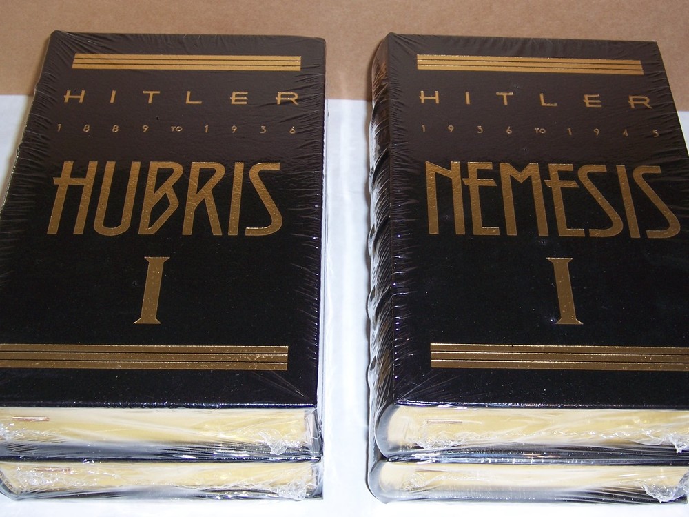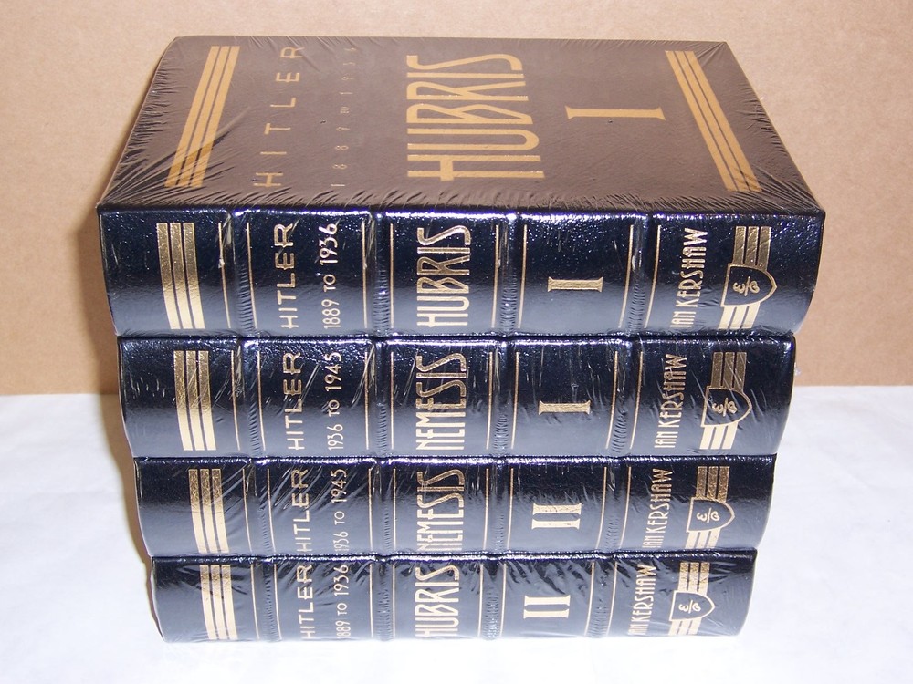 Heirloom edition Easton Press HITLER in 4 volumes by Ian Kershaw Black leather binding measured by 6 1/4" x 9 1/2" out-of-print, do not miss out this good deal Copyright by The Easton Press hubbed spine, bound in premium full leathers distinctive cover design, beautiful illustrations handsome, readable typefaces, permanent satin ribbon page marker elegant gilded page edges, endsheets of rich moire fabric thread-sewn pages for durability and strength, long-lasting high quality, acid-neutral paper LIST OF TITLES: a complete series in 4 volumes: 1. HITLER 1889 TO 1936 HUBRIS, Vol. I 2. HITLER 1889 TO 1936 HUBRIS, Vol. II 3. HITLER 1936 TO 1945 NEMESIS, Vol. I 4. HITLER 1936 TO 1945 NEMESIS, Vol. II CONDITION DESCRIPTION: Mint and unread condition, factory-sealed in shrinkwrap, clean inside, binding is tight and gold page edging still shiny, beautiful bright endleaves and satin ribbon page marker. This set could be a precious addition to your family library. SHIPPING / HANDLING: Book(s) will be handled/packed very safely, and shipped via USPS media mail with delivery confirmation.