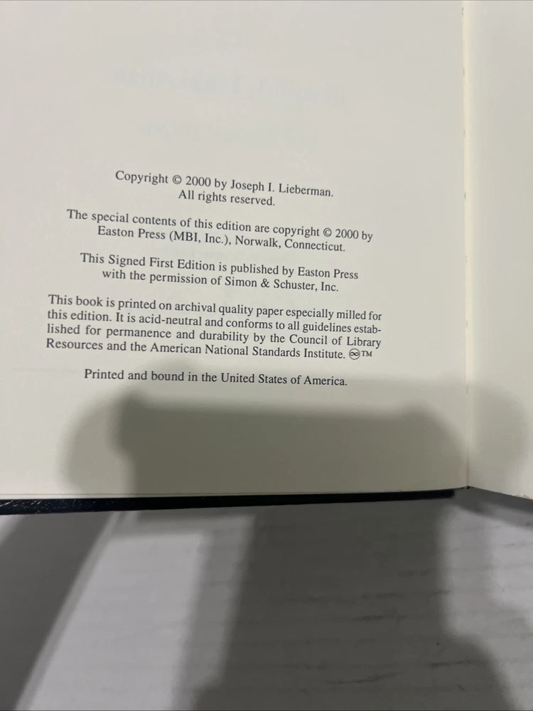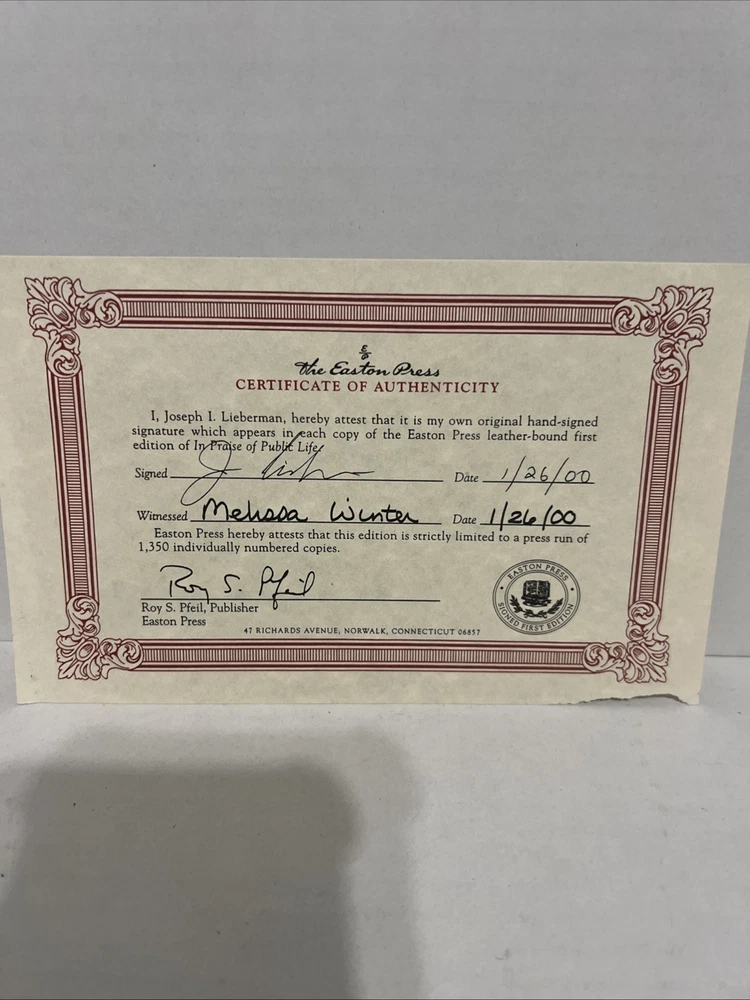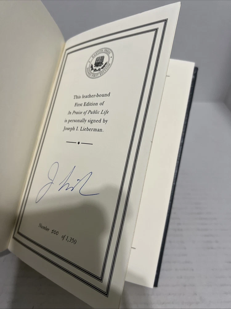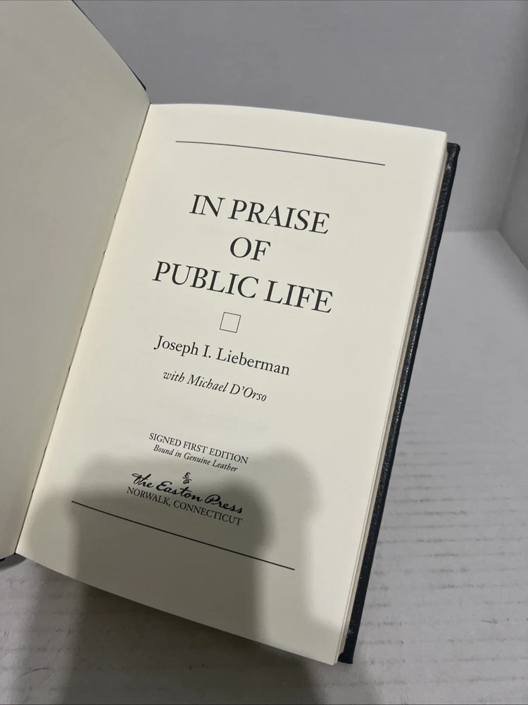 Delve into the world of politics with "In Praise of Public Life" by Joe Lieberman, a compelling exploration of service and leadership. This signed first edition by the esteemed author is a treasure for collectors and political aficionados alike, complete with a Certificate of Authenticity from Easton Press. The luxurious leather binding adds a touch of elegance to this English language volume, making it a standout addition to any library. Proudly manufactured in the United States, this book is not only a testament to the author's career but also a symbol of the values of public service. As a collectible from the distinguished Easton Press, it embodies the fusion of intellectualism and collectability, ideal for those who appreciate the intricacies of political life.