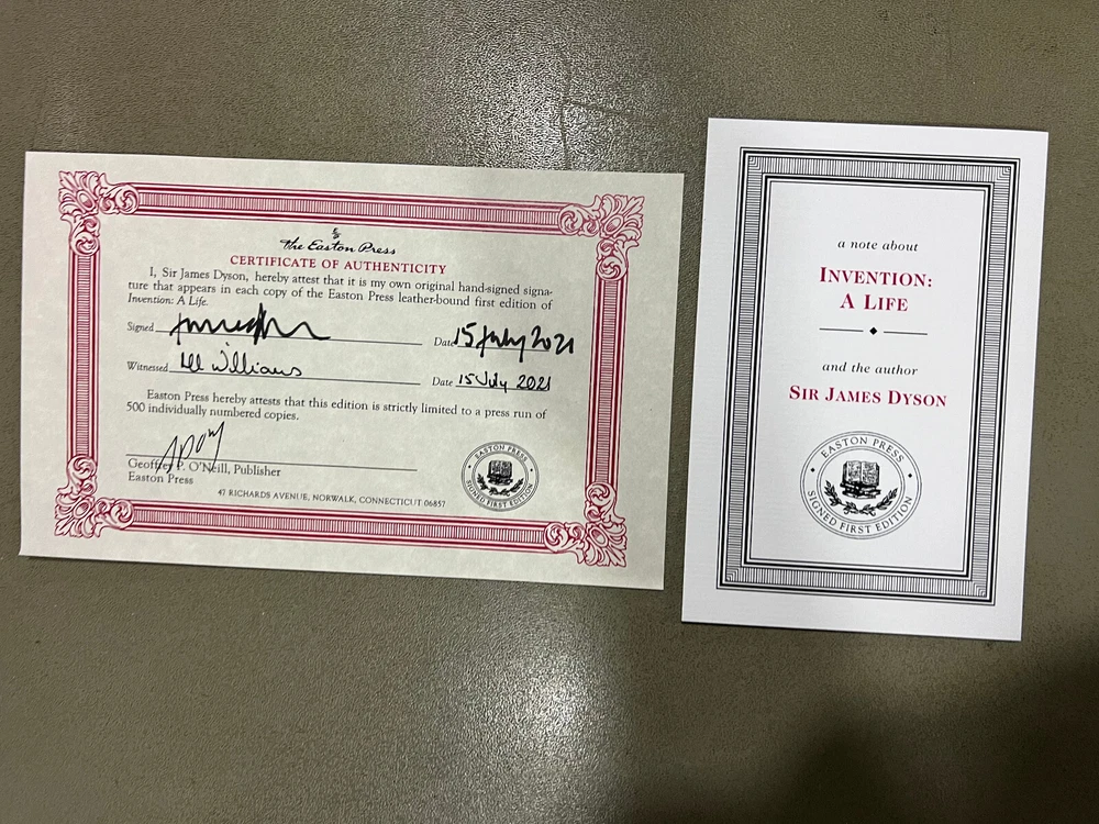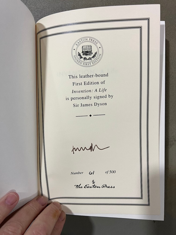 Invention: A Life by James Dyson Signed Easton Press 1st Editions Excellent Condition with Certificate of Authenticity! New Books get listed daily !!! 100s of Easton Press and Franklin Library books available!! All books get cleaned with a leather cleaner to remove any dust, odor and restore the beauty of leather!! Combined Shipping Discount: USA buyers - every book $1 off International combined shipping: 1 or 2 books - $40 3 or 4 books - $70 5 + books $17 per book 10+ books $13 per book WE SHIP DAILY!! RETURNS: Hassle-Free 30-days return policy and we pay for a return !! Check our Inventory (Link to eBay Store): http://stores.ebay.com/EastonFranklinBooks