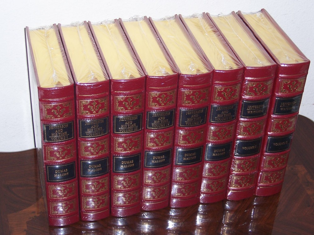 Pulitzer Prize-winning biography Easton Press 1993 JEFFERSON AND HIS TIME in 6 volumes Plus: Thomas Jefferson's Writings in 2 volumes by Dumas Malone with maps and illustrations Uniform wine red leather hardcover binding BOUND IN GENUINE LEATHER Copyright by Easton Press Hubbed Spine, Bound in Premium Full Leather Distinctive Cover Design, Profusely Illustrated Moire Endleaves, Satin Ribbon Page Marker Accented in Real 22KT Gold, Gilt Page Edges Smyth-sewn Pages for Strength and Durability Long-lasting, High Quality Acid-neutral Paper LIST OF TITLES: complete in eight volumes: Vol I : Jefferson the Virginian Vol II : Jefferson and the Rights of Man Vol III: Jefferson and the Ordeal of Liberty Vol IV: Jefferson the President -First Term, 1801-1805 Vol V: Jefferson the President -Second Term, 1805-1809 Vol VI: The Sage of Monticello Vol I : Autobigraphy A Summary View of the Rights of British America Notes on the State of Virginia Public Papers Address, Messages, and Replies Miscellany Vol II: Letters CONDITION DESCRIPTION: this set is in Mint and unread condition: factory sealed in shrinkwrap , clean inside page, and binding is tight, beautiful bright endpapers and satin ribbon page marker. SHIPPING / HANDLING: The book will be shipped via USPS media mail with delivery confirmation, special care will be taken during packing to ensure you receive the books as described.