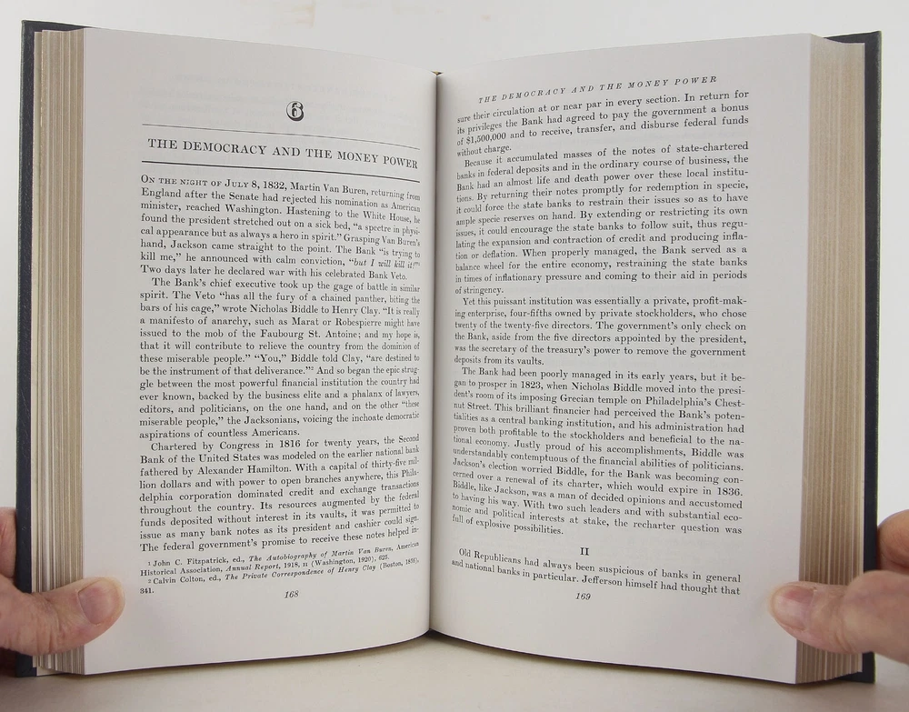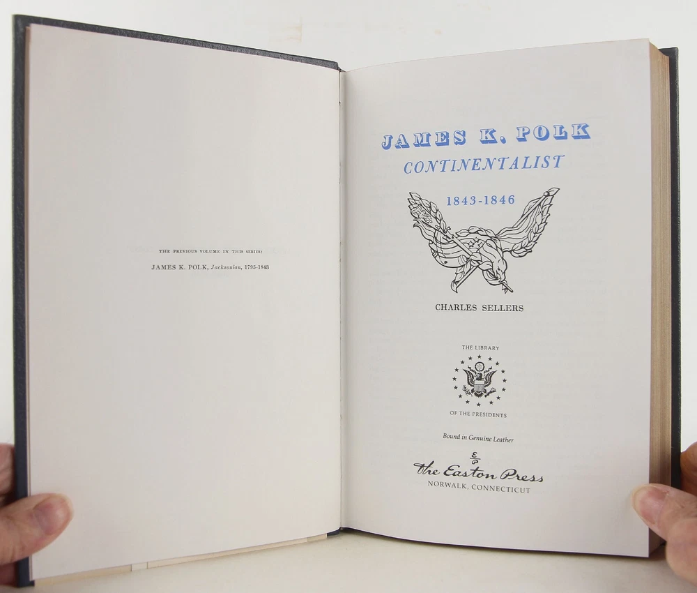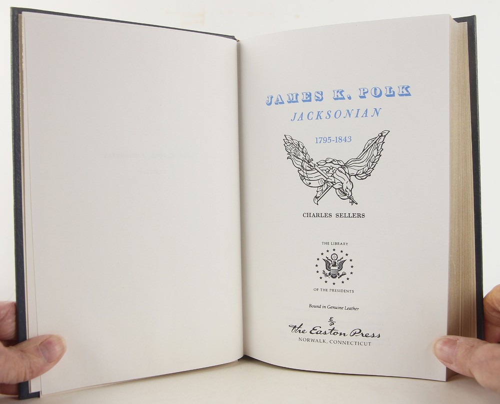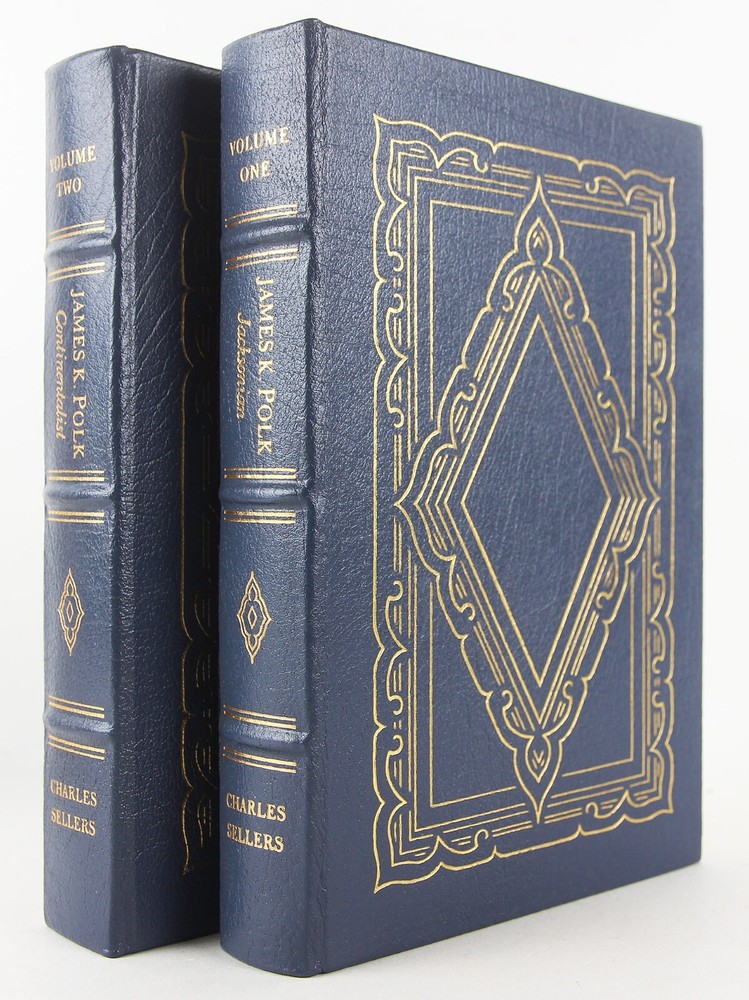 James K. Polk: Jacksonian 1795-1843; James K. Polk: Continentalist 1843-1846 2 Volume Set by Charles Grier Sellers 1987 Easton Press (Norwalk, Connecticut), two 6 3/8 x 9 1/2 inches tall blue full leather bound volumes, gilt decoration to covers, three raised bands and gilt lettering to spines, all page edges gilt, ribbon marker sewn in, [v.1] xiv, 526; [v.2] x, 513 pp. (1,063 pages total.) Very slight rubbing and minor abrasions to covers. Bookplate (with no name) to front pastedown of Volume 1 (the bookplate is unattached and laid in on Volume 2). Otherwise, a very good set - clean, bright and unmarked. An important contribution to American political history, a fascinating study of the interaction of state and national policies, and an illuminating delineation of the career of one of our least-known Presidents.