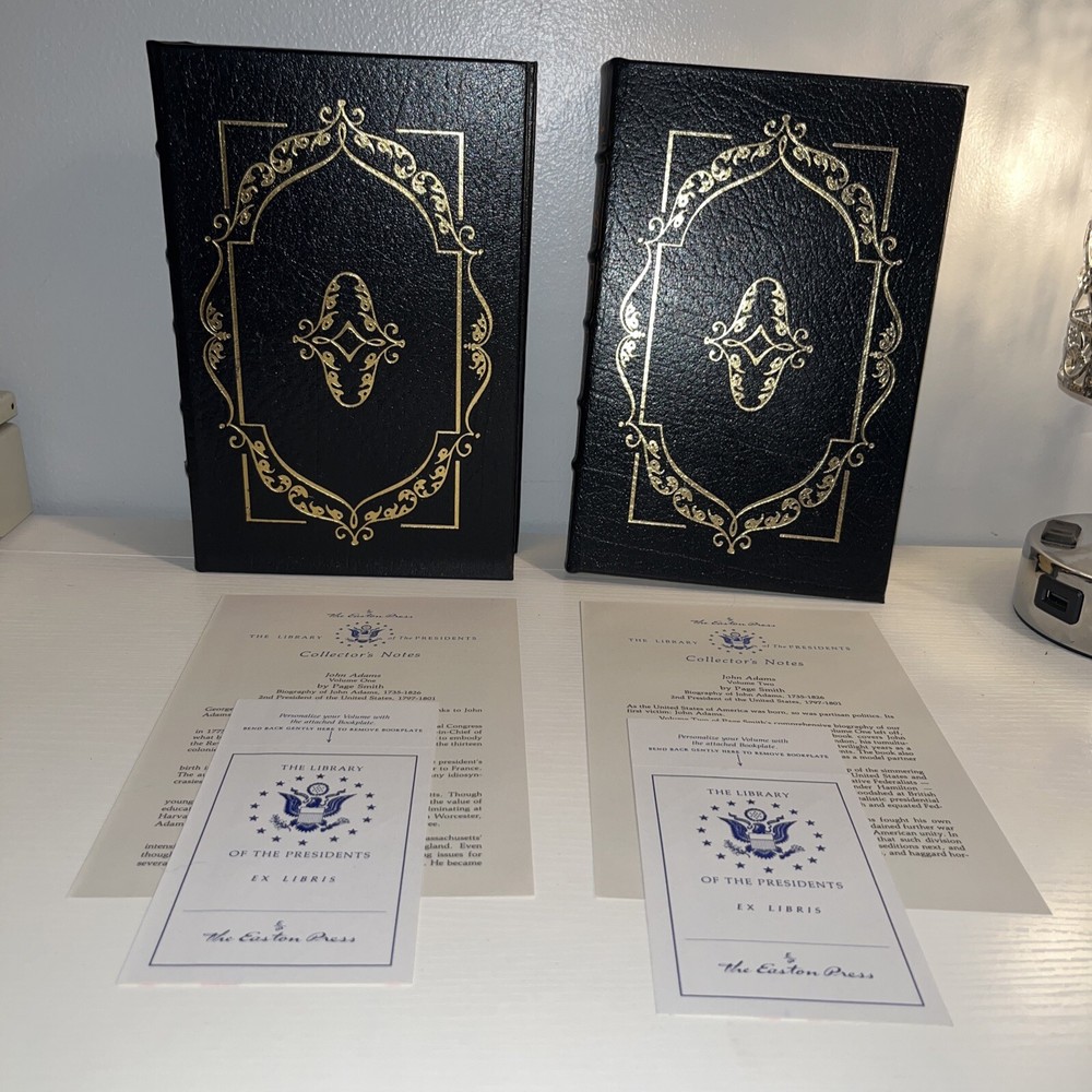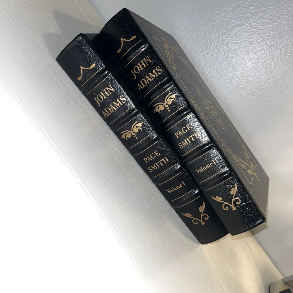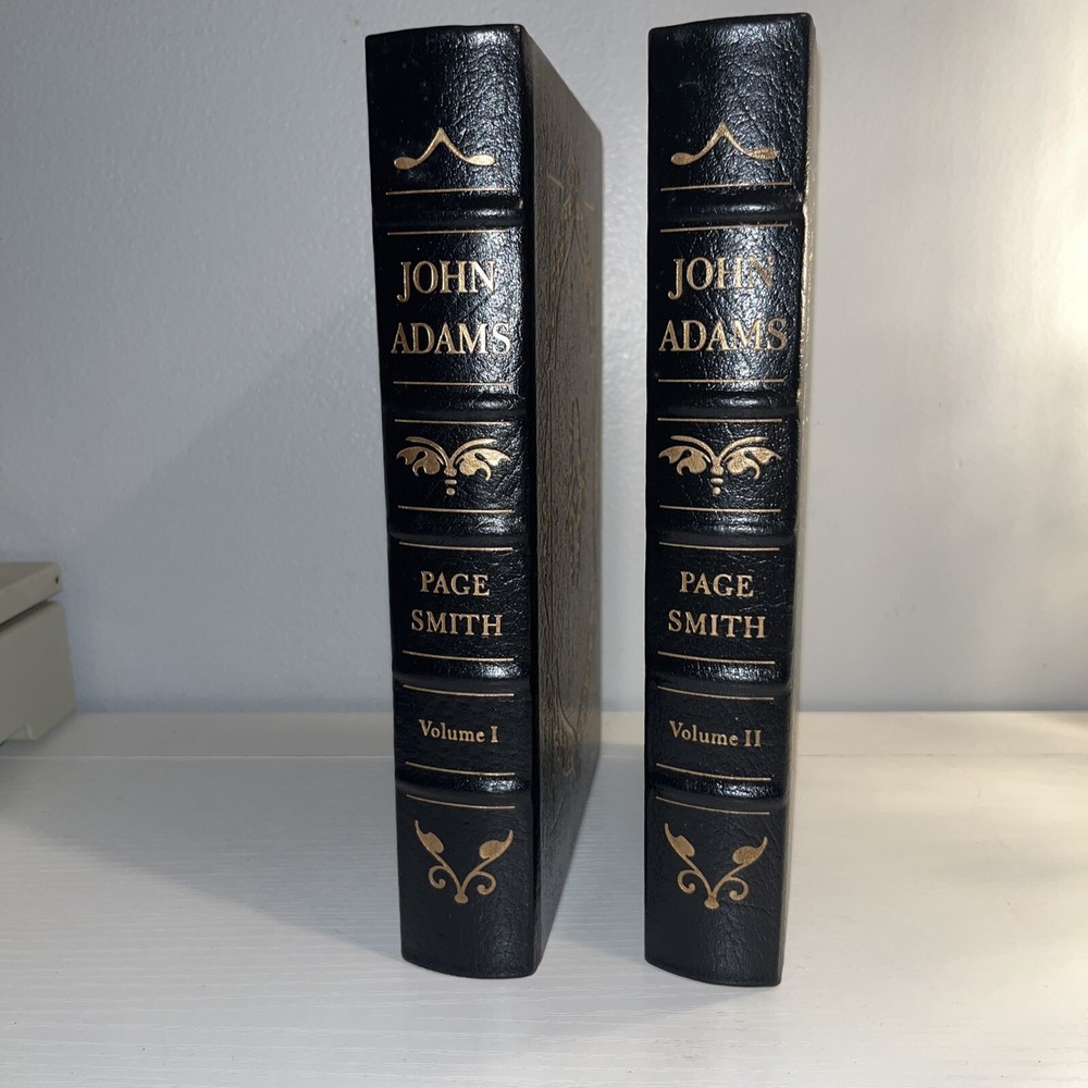 Easton Press : John Adams by Page Smith (1962&63, Leather, 2 Vol. set). Facebook‘s are in extremely good condition. There are some minor blemishes on the front cover. More significant on volume two. I have highlighted this in the photos. It consists of like whitish or silver marks that I believe was from the book it was sitting against on the bookshelf. There are also Several areas where the gold finish in the detailing has worn away or turned