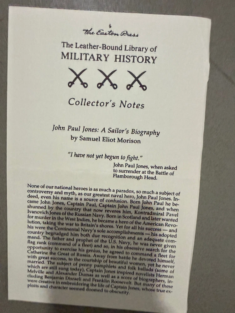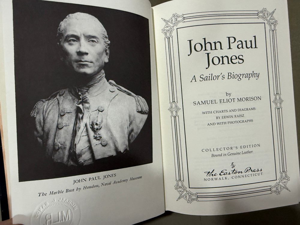 John Paul Jones “A Sailor’s Biography” - Morison Easton Press Military Very Good Plus Condition with Collectors Notes; the previous owner embossed stamp! New Books get listed daily !!! 100s of Easton Press and Franklin Library books available!! All books get cleaned with a leather cleaner to remove any dust, odor and restore the beauty of leather!! Combined Shipping Discount: USA buyers - every book $1 off International combined shipping: 1 or 2 books - $45 3 or 4 books - $75 5 + books $17 per book 10+ books $13 per book WE SHIP DAILY!! RETURNS: Hassle-Free 30-days return policy and we pay for a return !! Check our Inventory (Link to eBay Store): http://stores.ebay.com/EastonFranklinBooks