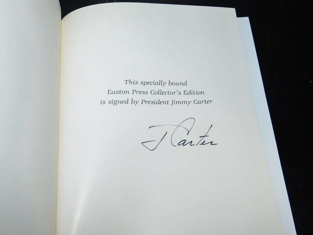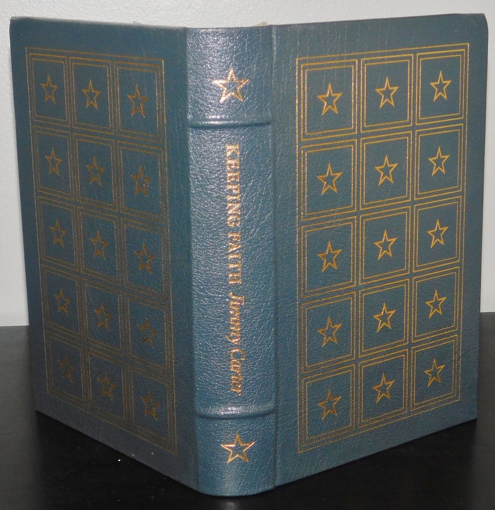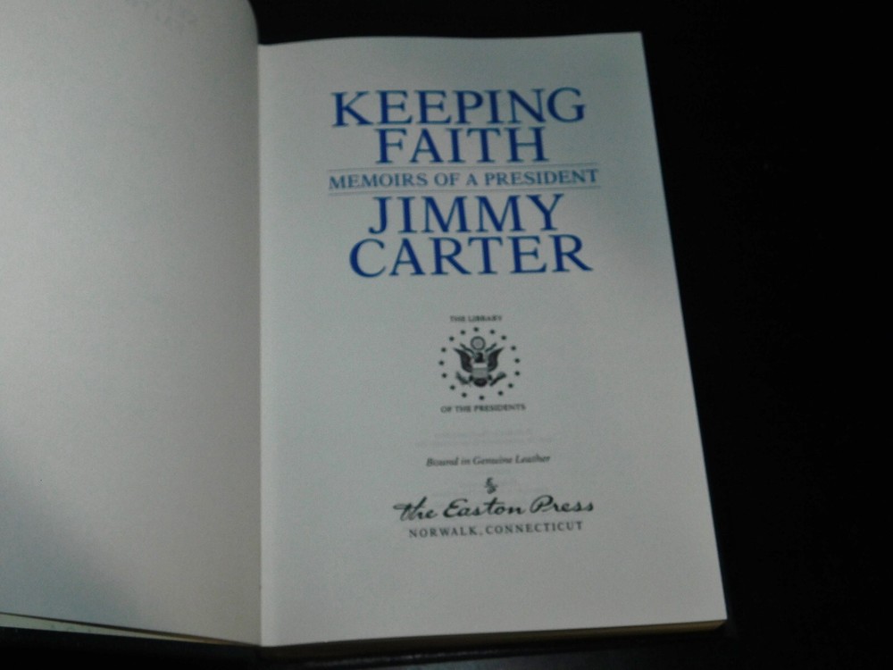 KEEPING THE FAITH Memoirs of a President by Jimmy Carter Easton Press Signed by Jimmy Carter Published by Easton Press, this is a beautiful, leather bound hardcover edition from Easton Press' "The Library of the Presidents" collection. The spine is ribbed and the page edges have a gold gilt. The spine, boards, and page edges are decorated with 22k gold gilt. There is a a satin page ribbon/marker and decorated end-papers. The pages are clean. There are a few light marks on the gilded page edges. Also included with this listing is the introductory pamphlet (written by Edmund S. Muskie) and an unused bookplate specific to the "The Library of the Presidents" collection. The pamphlet has a previous owner's initials written in red ink on the top left corner of the front page. From a smoke-free home. See pictures I will package the book well, using bubble wrap in a box to ensure they arrive the same way they look now.