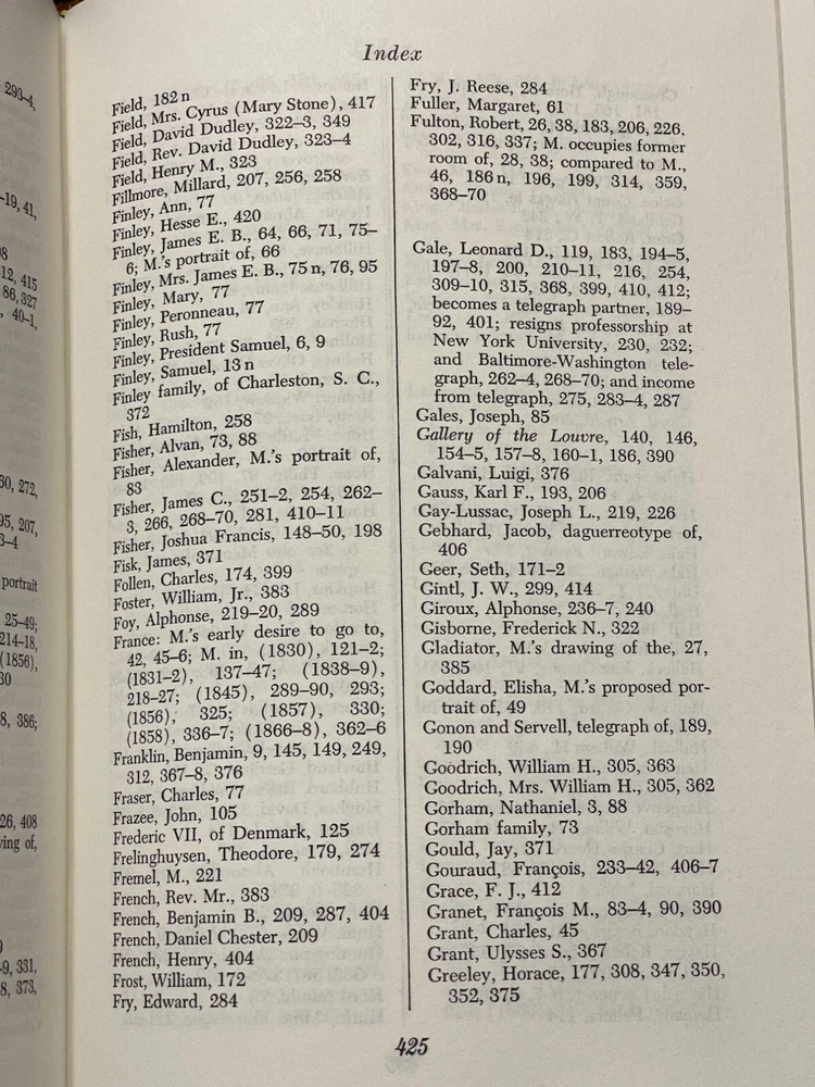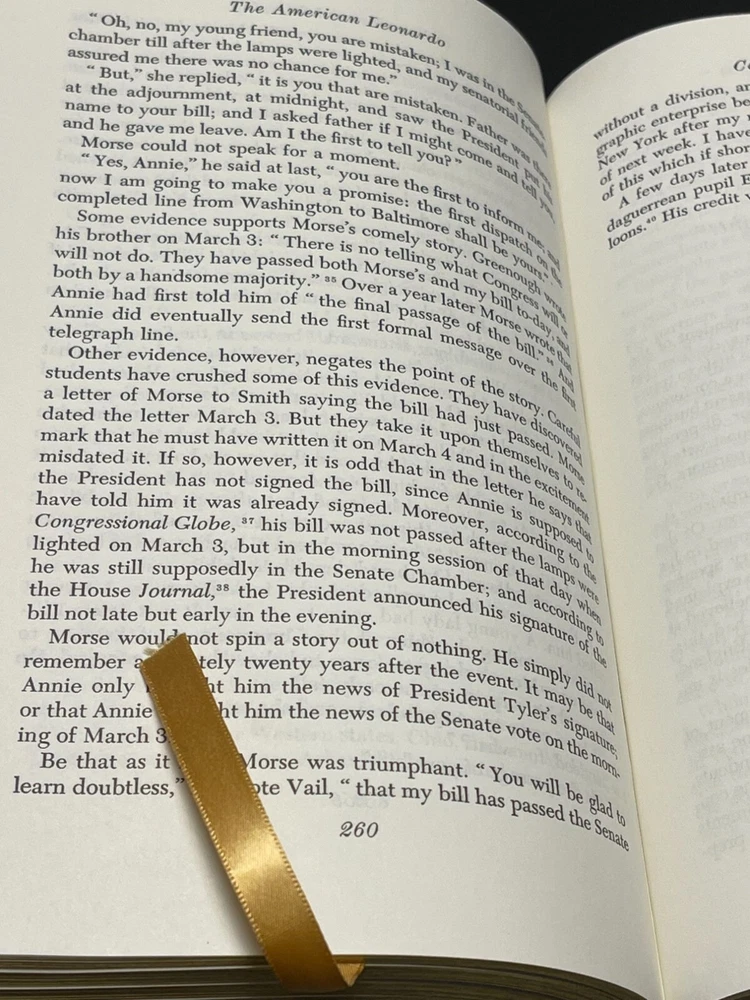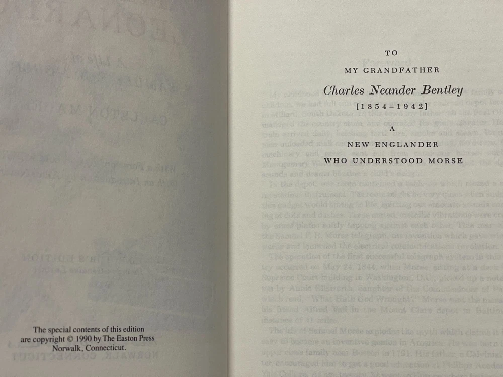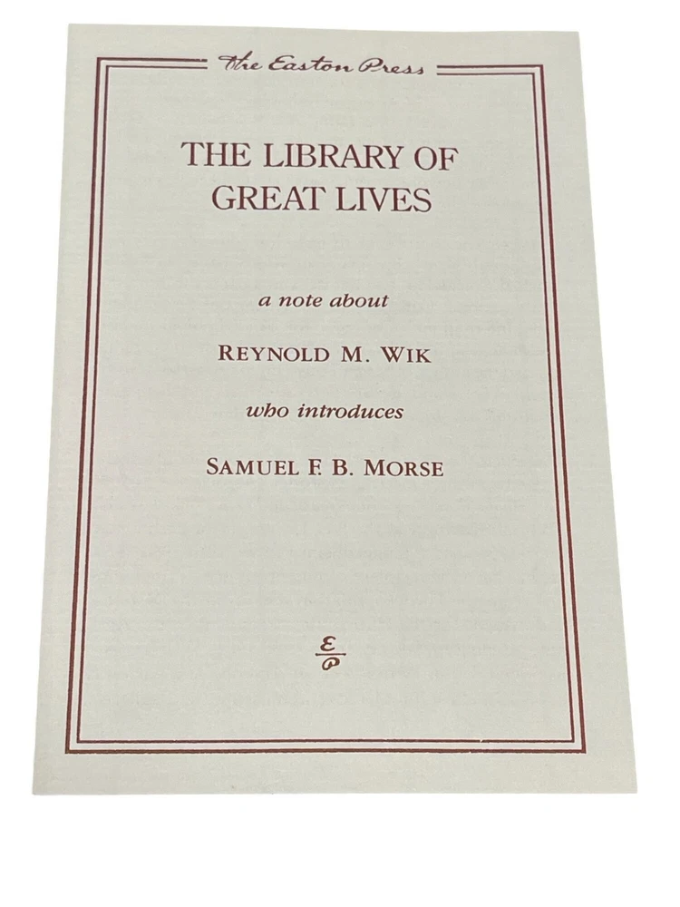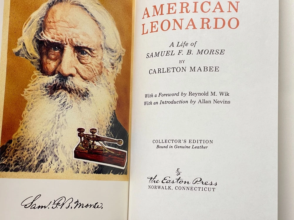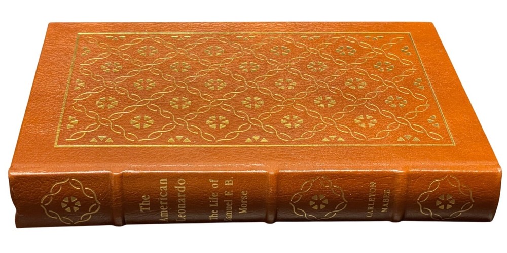 The Easton Press published this edition of THE AMERICAN LEONARDO - THE LIFE OF SAMUEL F. B. MORSE by Carleton Maber ©1990, and the title resides in the publisher's Library of Great Lives. The handsome leather binding measures 6." x 9.25" and consumes 309 pages of text including Referenxces, an Index and a frontispiece. A note from Easton about Reynold M. Wik, who wrote the Introductioin, is laid in. Condition: Like new, fine book in gift-quality. Features include: Fully bound in genuine leather. 22kt gold deeply inlaid on the "hubbed" spine. Superbly printed on acid-neutral paper that lasts for generations. Sewn pages — not just glued like ordinary books. Handsome moiré endpages and a satin-ribbon page marker. Printed and bound in the USA. Imported materials. Rigorous inspection at every stage ensures adherence to ... exacting standards. Superb craftsmanship and commitment to quality. From Wikipedia Overview: Samuel Finley Breese Morse was an American inventor and painter. He is best known for inventing the single-wire telegraph and Morse Code. Morse's invention was significant because it allowed for near-instant communication around the world. Although he didn't invent the telegraph, he developed it, commercialized it, and invented the code that bears his name. Morse was a Yale graduate who trained as an artist in England. Condition: Pre-Owned Like New As new, fine book in gift-quality.