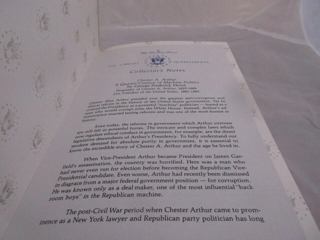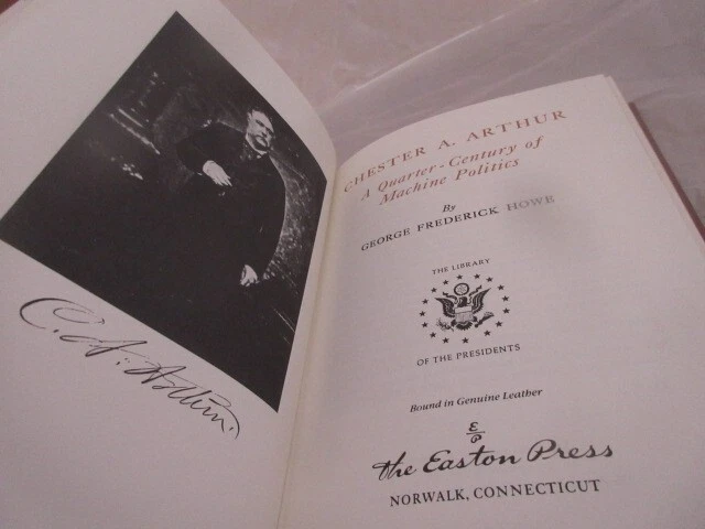 Easton Press Leather Bound Book Easton Press Leather Bound Book Chester A. Arthur A Quarter Century of Machine Politics 1987 By George Frederick Howe With Collector's Notes - The Library of the Presidents - The book is in good condition with some wear on the gilding. The wear looks like scratches and white spots. The book is approximately 6 1/4" x 9 1/2". Total approximate pages is 307 pages. Please see the photos. Please check the photos carefully and I would be happy to answer any questions. USA and Worldwide International shipping okay. Returns will be accepted within 14 days but please be careful when you make your purchase. Buyer pays return shipping. Item is the exact item as described in the photos.