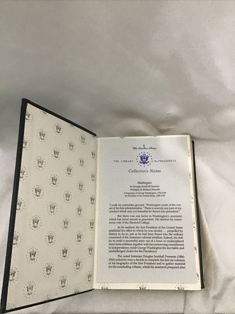 This stunning leather-bound book by Douglas Southall Freeman, titled Washington 1985, is a must-have for any presidential history enthusiast. Published by Easton Press, this book is a part of their prestigious Library of the Presidents collection, making it a rare and valuable addition to any collection. The book was printed in 1985 in English and has no modifications or personalized elements. It features a biography and autobiography of George Washington, making it a great read for anyone interested in the history of the United States. The book has a beautiful leather binding and was published in Connecticut. It is signed by the author and has special attributes that make it a collectible item. Don't miss your chance to own this rare piece of history!
