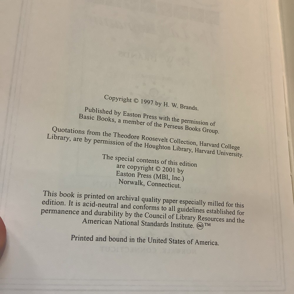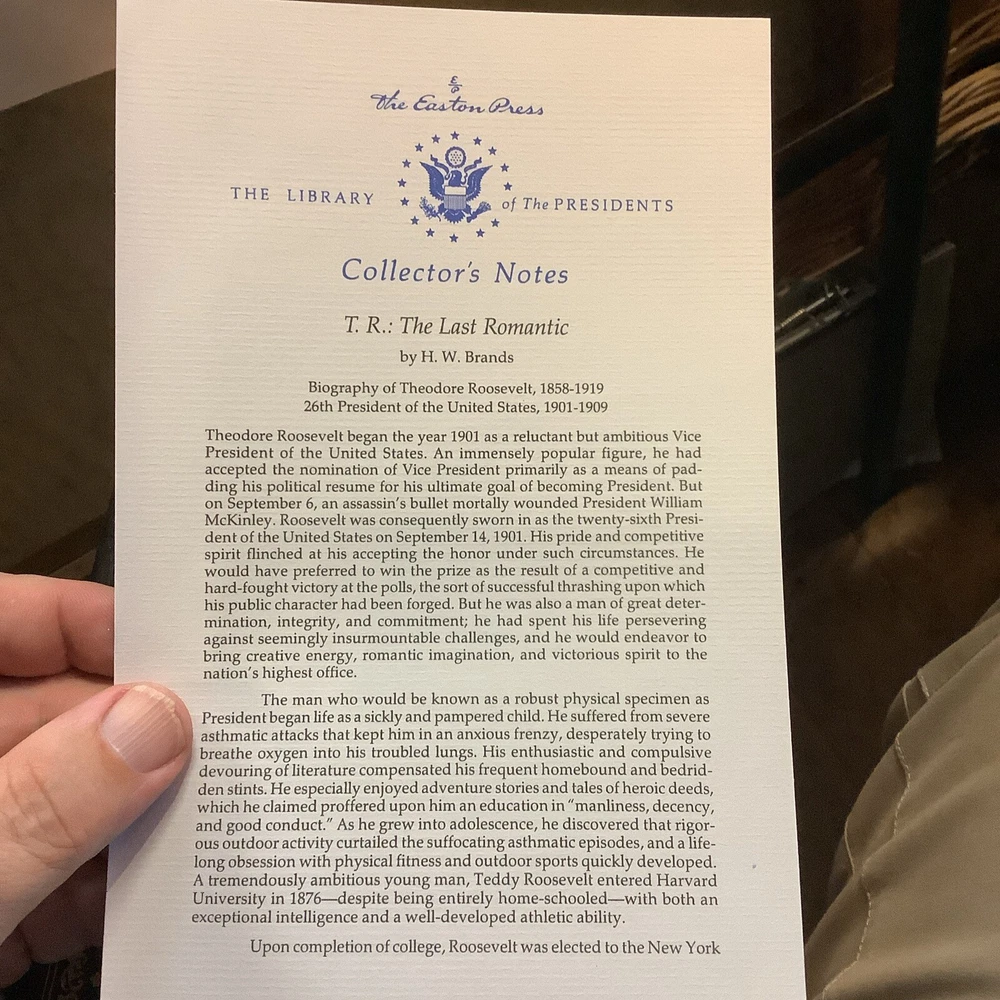 T.R. The Last Romantic by H.W. Brands. Published by The Easton Press, 2001. Full leather binding. Bookplate affixed to page opposite title page. Sheet of Collector's Notes laid in.