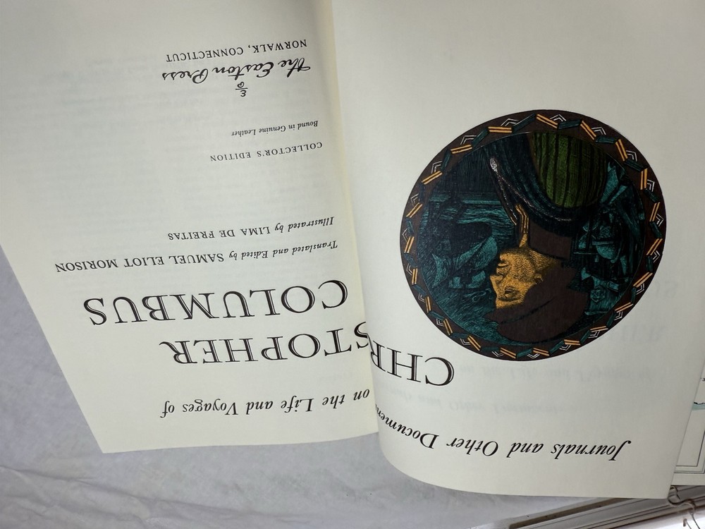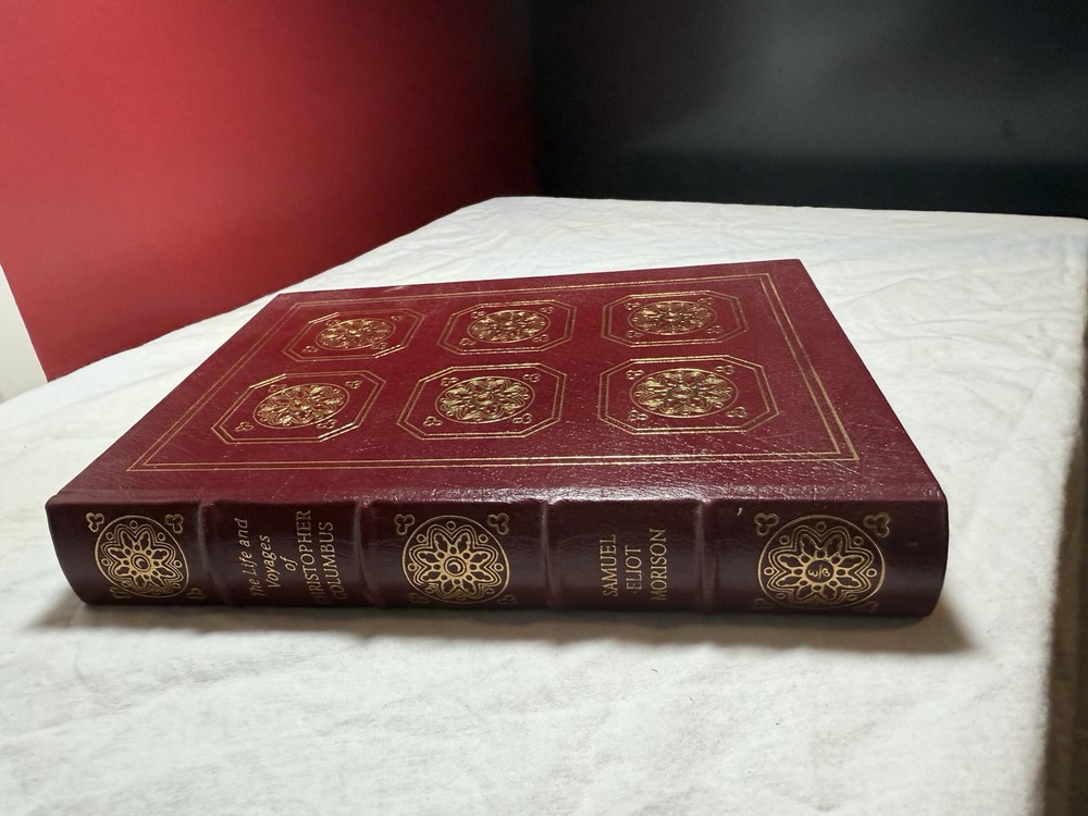 This is a leather-bound edition of "The Life and Voyages of Christopher Columbus" by Morison, published by Easton Press. The book is a collectible item for those interested in antiquarian and rare books.