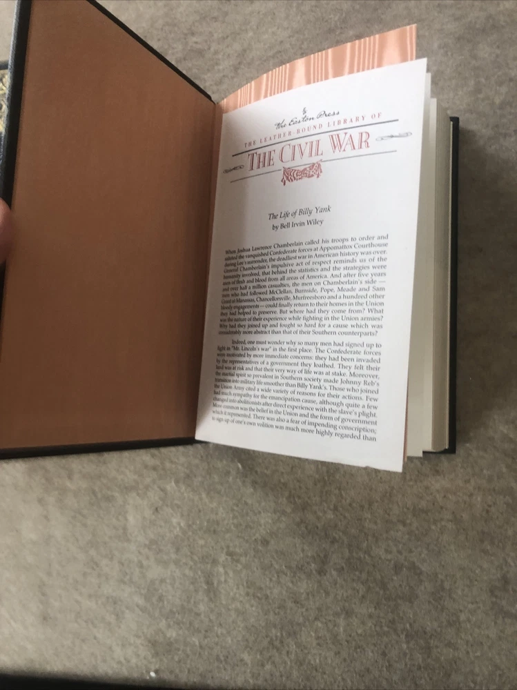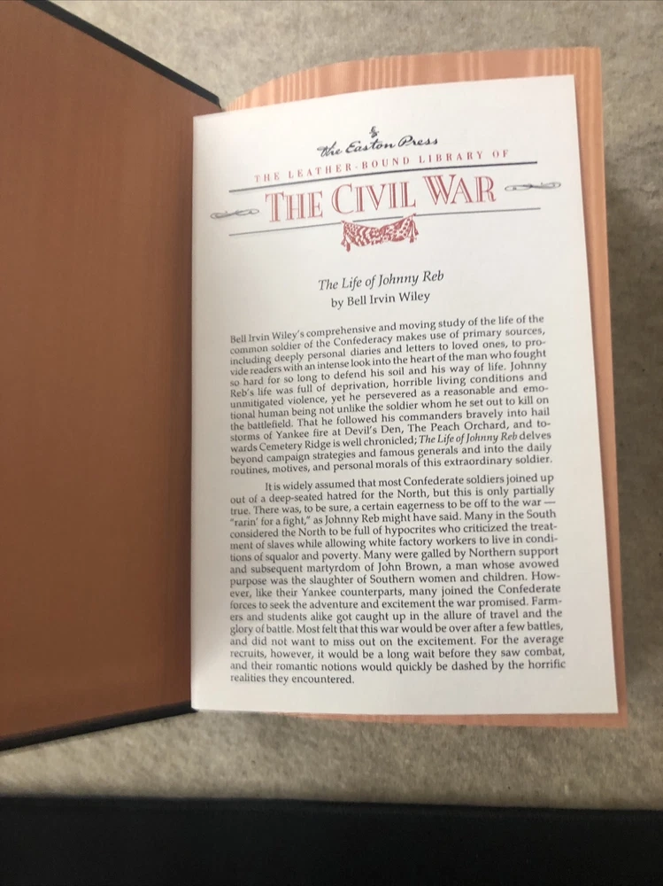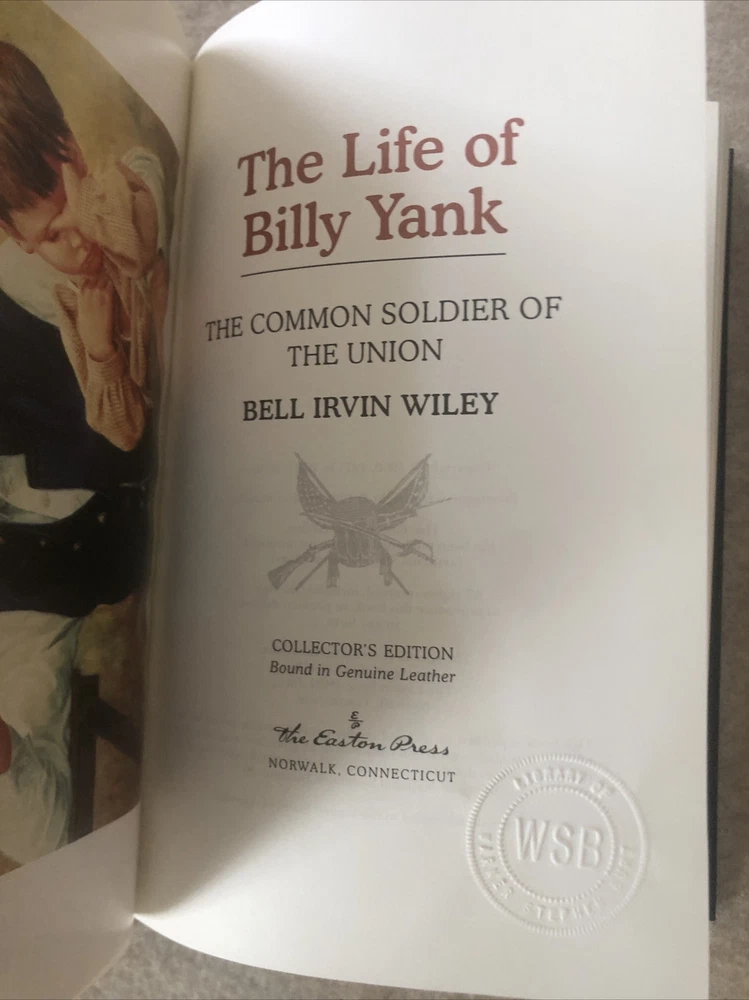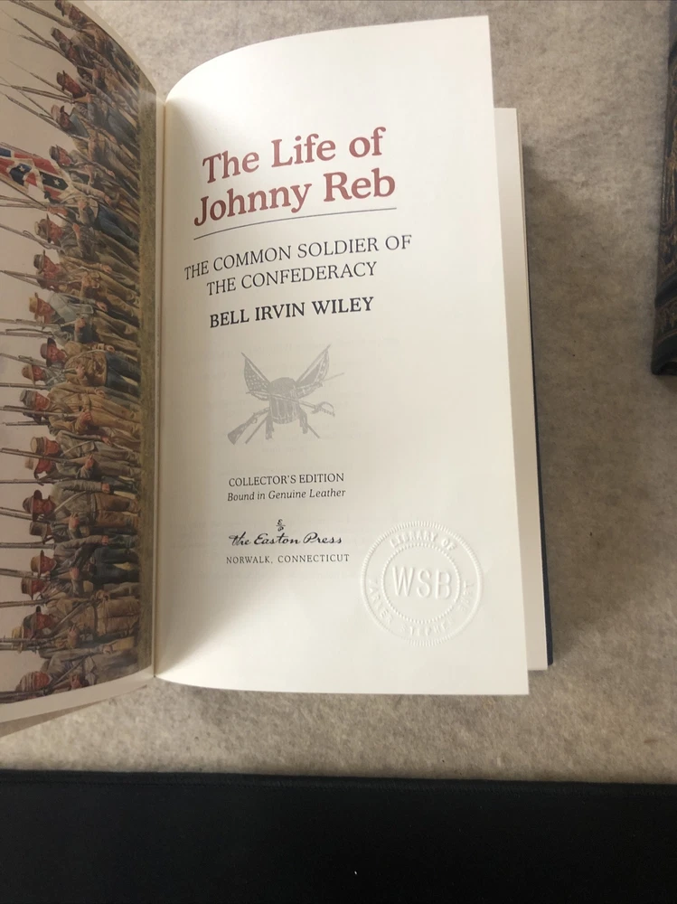 Easton Press The Life of Billy Yank and The Life of Johnny Reb (2 volumes) by Bell Irvin Wiley The books are full leather. This books are in near mint condition with no wear. There is a stamped impression from a previous owner on the second page of each volume. The gold on the covers looks like new. The end pages show no fading. The gilt on the edge of the pages is in almost perfect condition with a tiny scratch on the bottom of Johnny Reb. Please see photos. We try to describe as accurately as possible so you will be satisfied with your purchase. We have more books from this set on eBay and we would be happy to combine on shipping to save you money. All books are sent with insurance via USPS Media Mail.