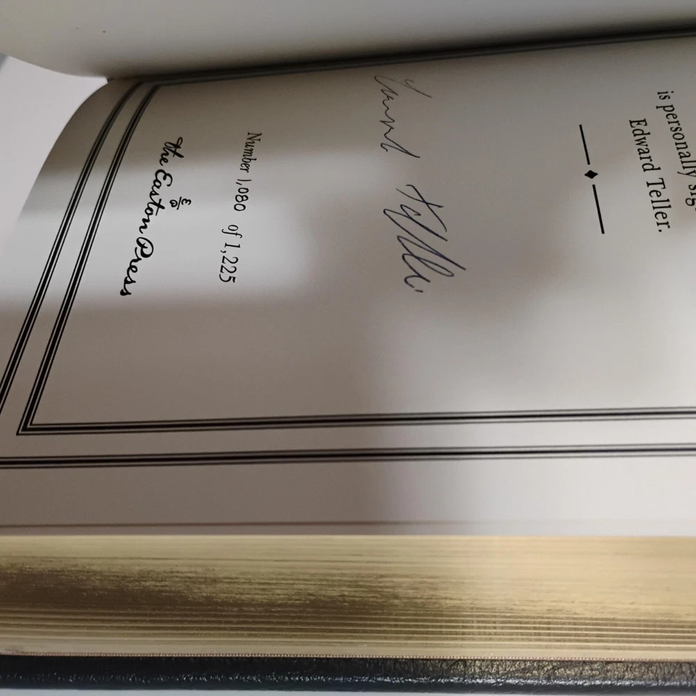 This Easton Press edition of Edward Teller’s *Memoirs* is absolutely stunning—a pristine, signed first edition bound in elegant gray leather with gold gilt detailing. Teller’s signature adds incredible historical value, especially for a book covering his pivotal role in the Manhattan Project. The condition is flawless, unmarked inside and out, and the included COA and publisher’s notes make it even more collectible. A must-have for anyone passionate about science, history, or rare signed books!