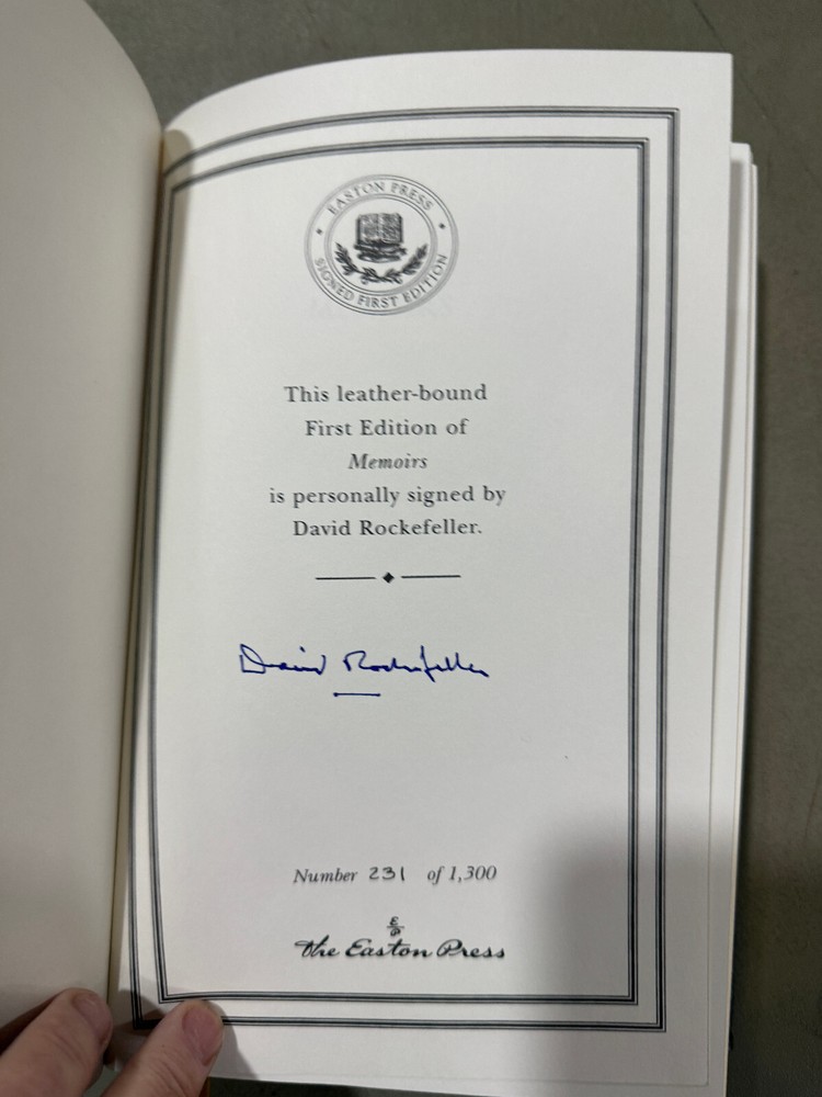 Memoirs - David Rockefeller SIGNED Easton Press 1st Editions Excellent Condition! New Books get listed daily !!! 100s of Easton Press and Franklin Library books available!! All books get cleaned with a leather cleaner to remove any dust, odor and restore the beauty of leather!! Combined Shipping Discount: USA buyers - every book $1 off International combined shipping: 1 or 2 books - $45 3 or 4 books - $75 5 + books $17 per book 10+ books $13 per book WE SHIP DAILY!! RETURNS: Hassle-Free 30-days return policy and we pay for a return !! Check our Inventory (Link to eBay Store): http://stores.ebay.com/EastonFranklinBooks