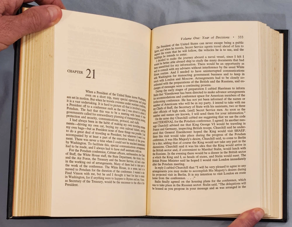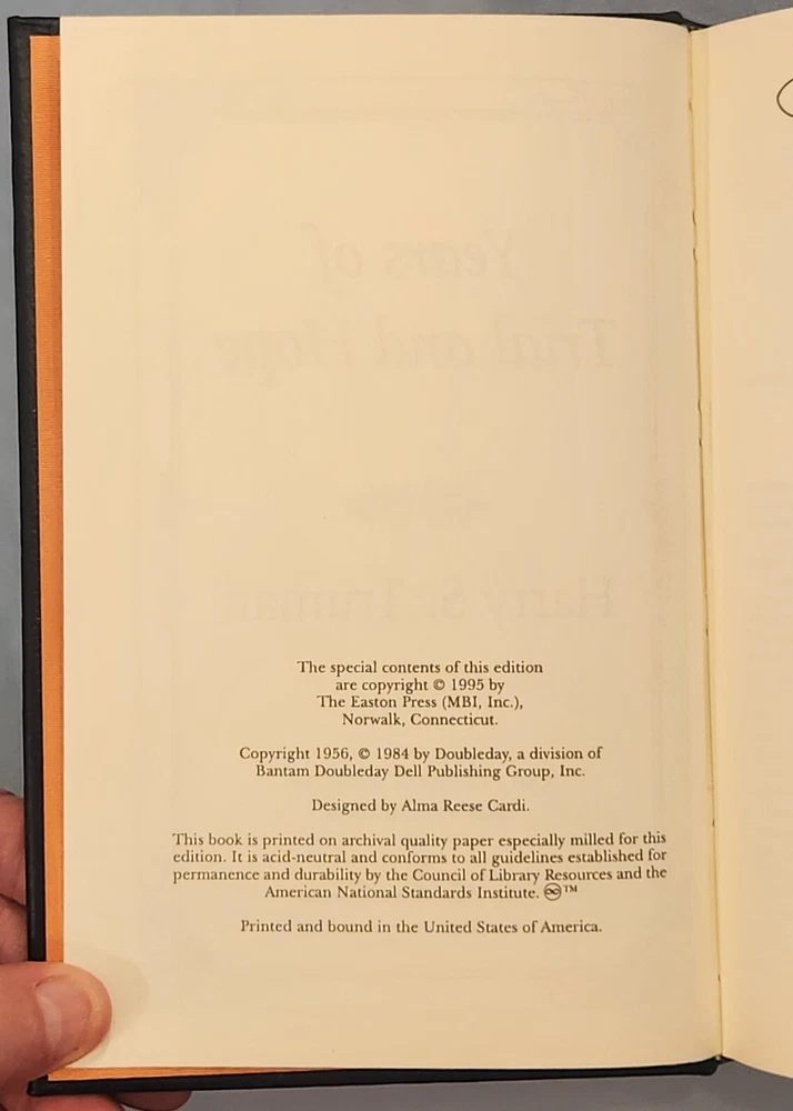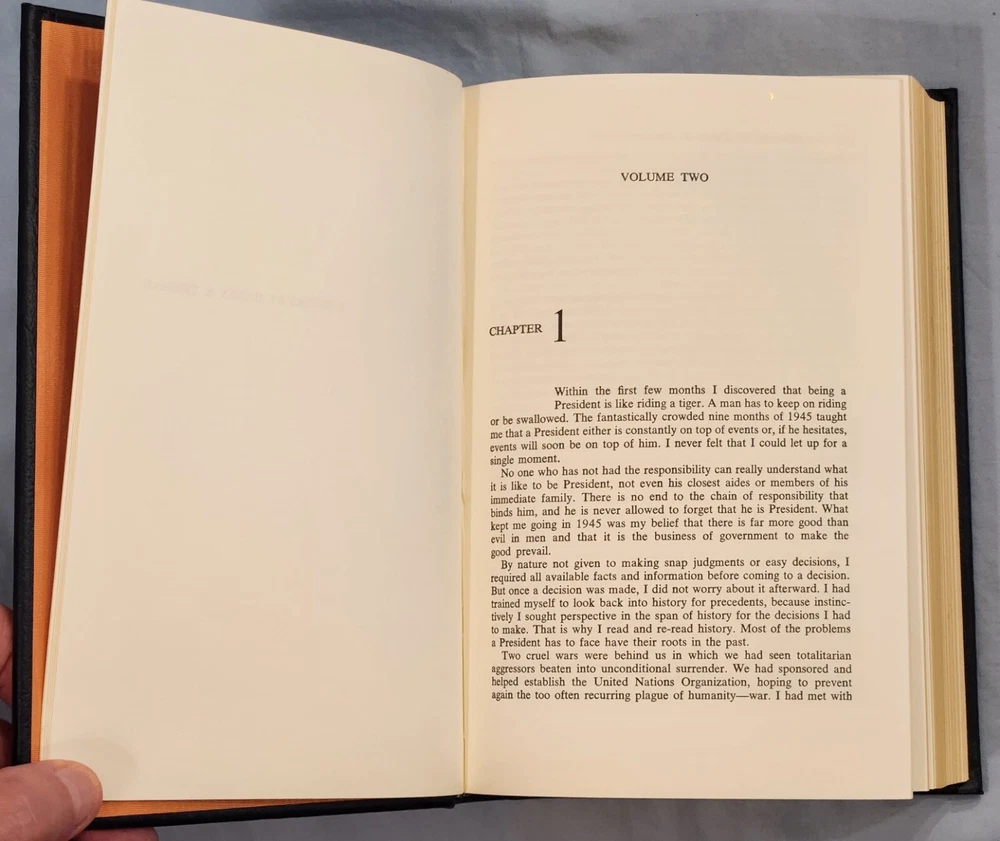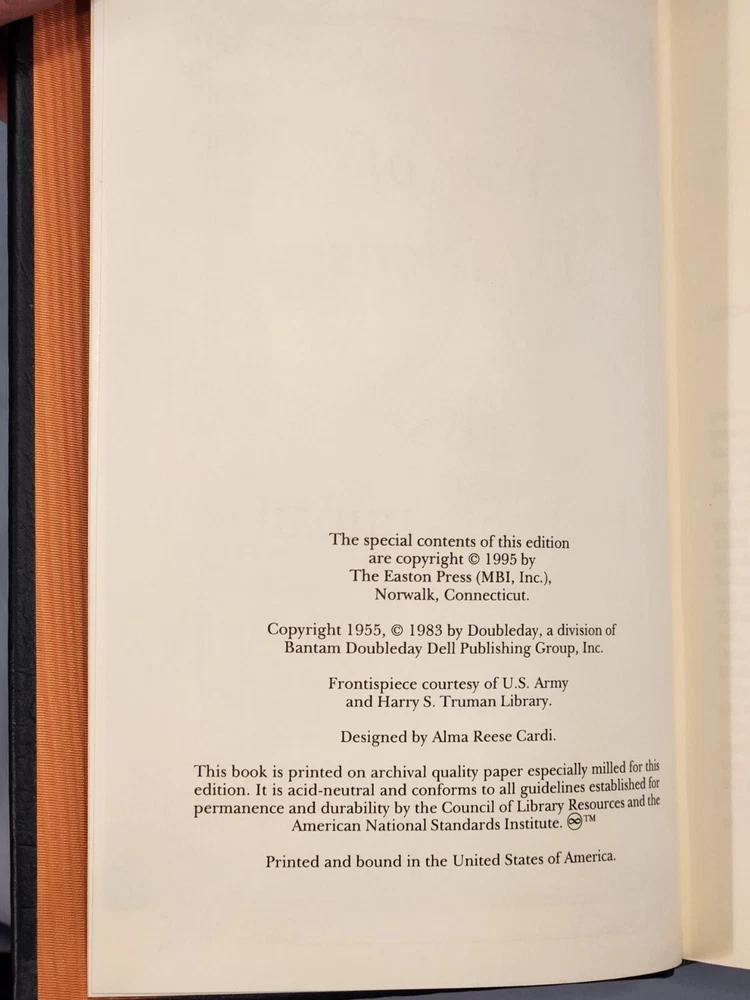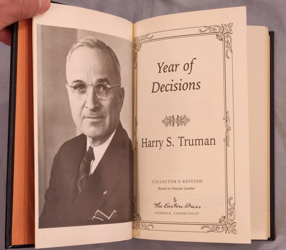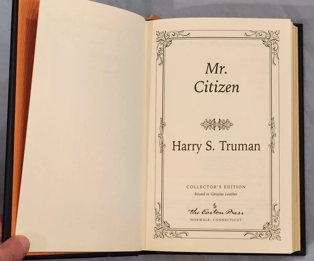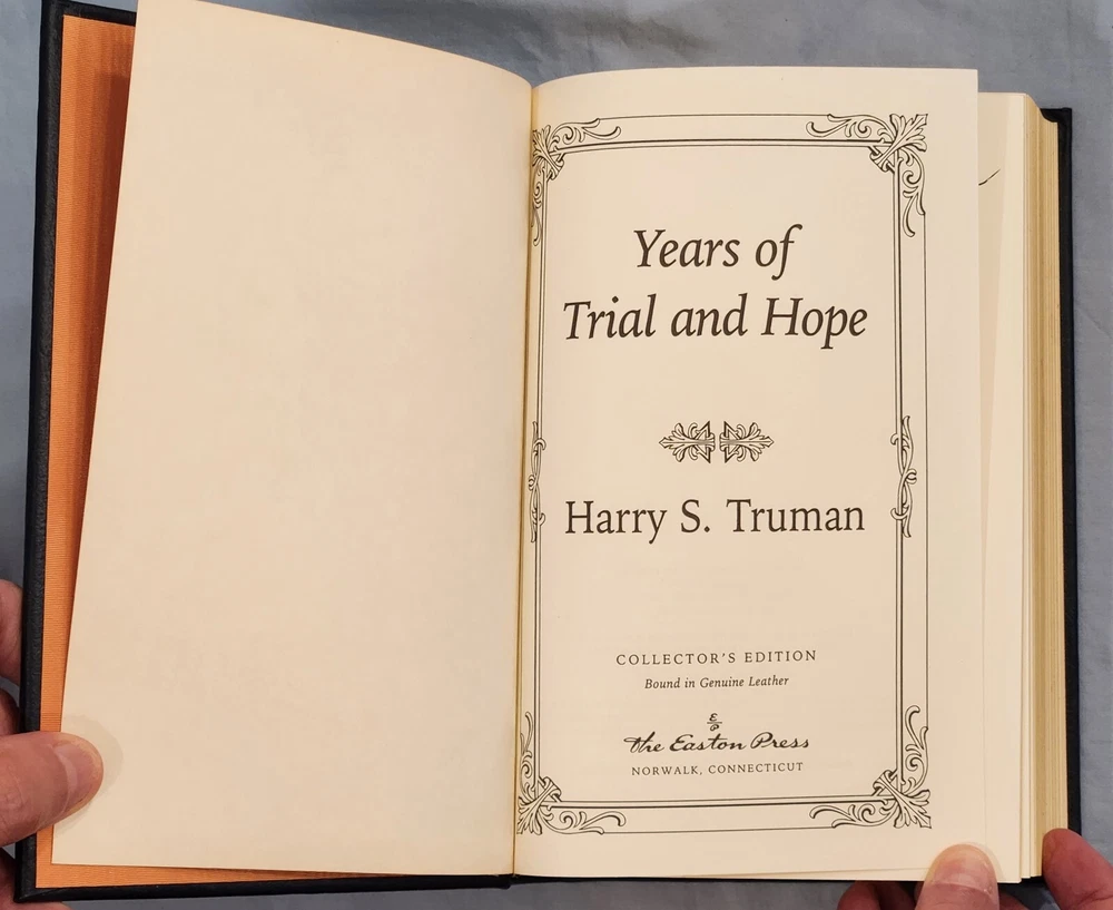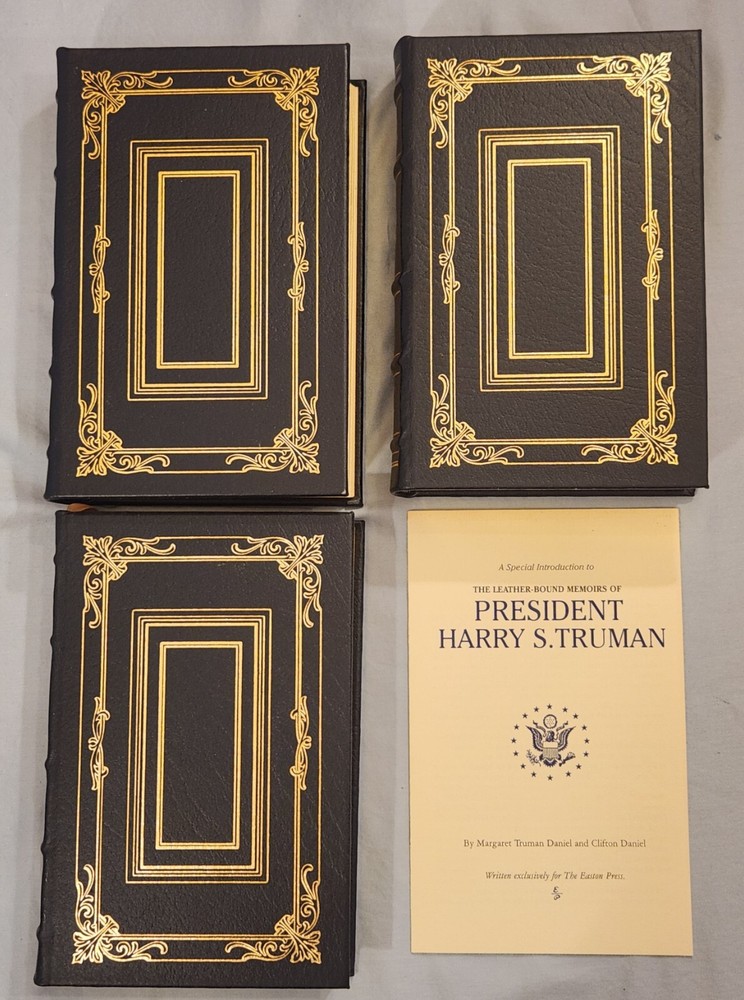 This is three of four volumes of Harry S. Truman's Memoirs. This set includes Year of Decisions, Years of Trial and Hope, and Mr. Citizen. The set is missing the fourth volume Truman Speaks. The set is Easton Press collectible set bound in quality leather with gold gilt. The work is printed on quality archival paper. Condition is Very Good. The previous owner's name is written on a couple of the volumes. The binding is good. The cover is in good condition. The pages are straight and clean. See pictures.