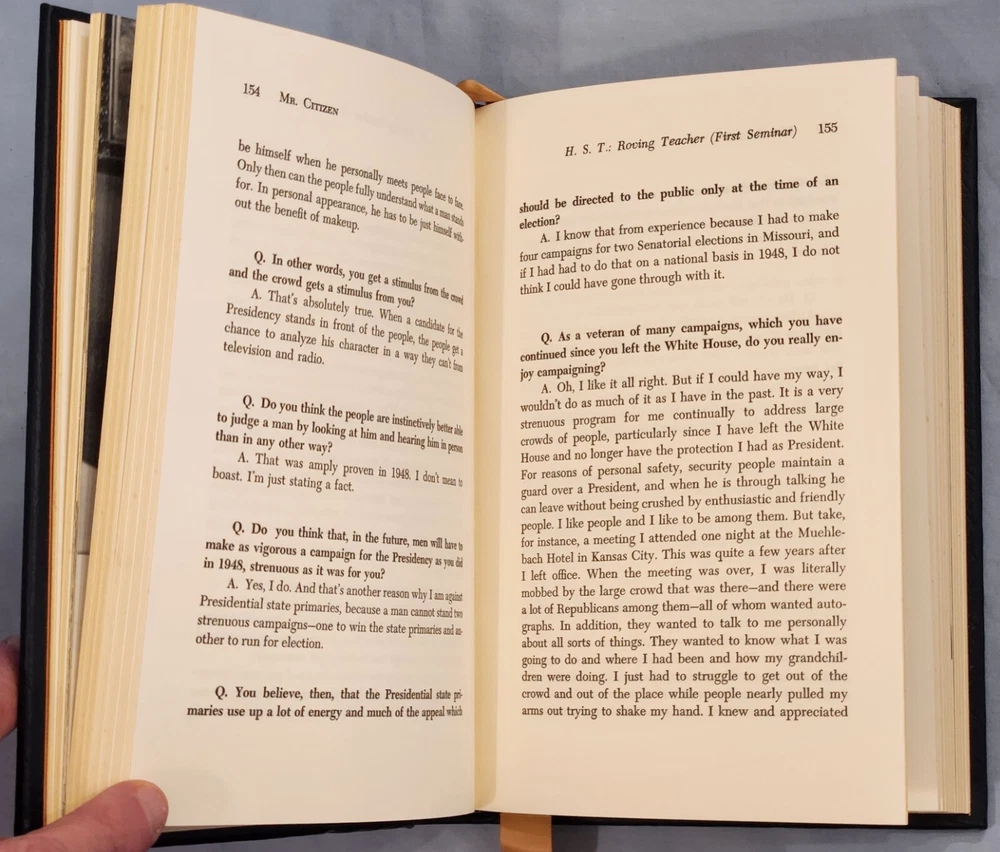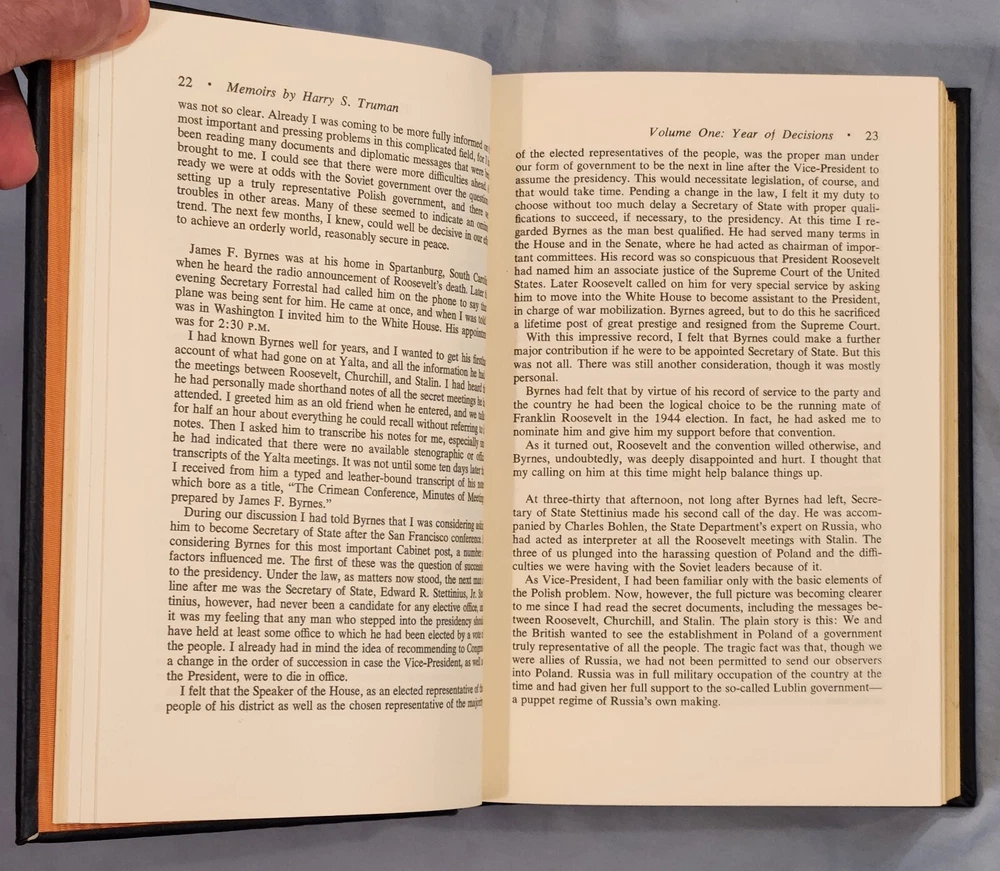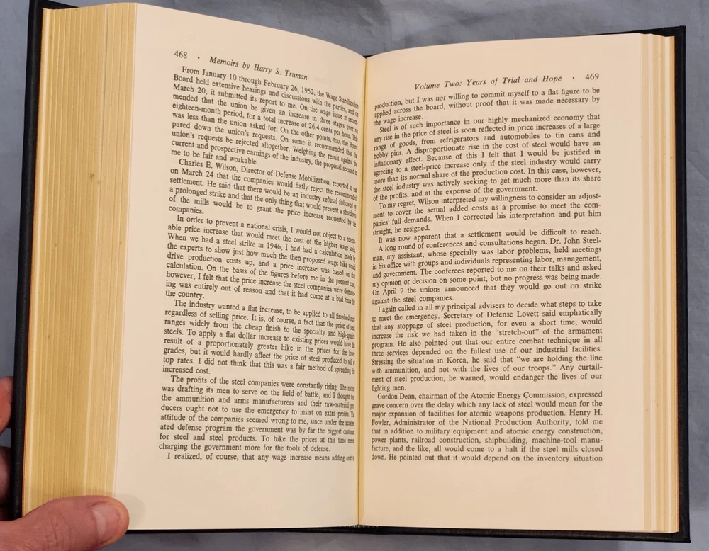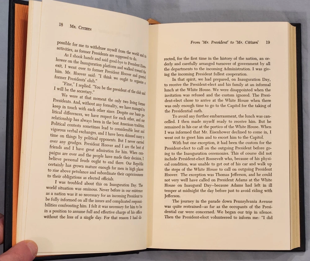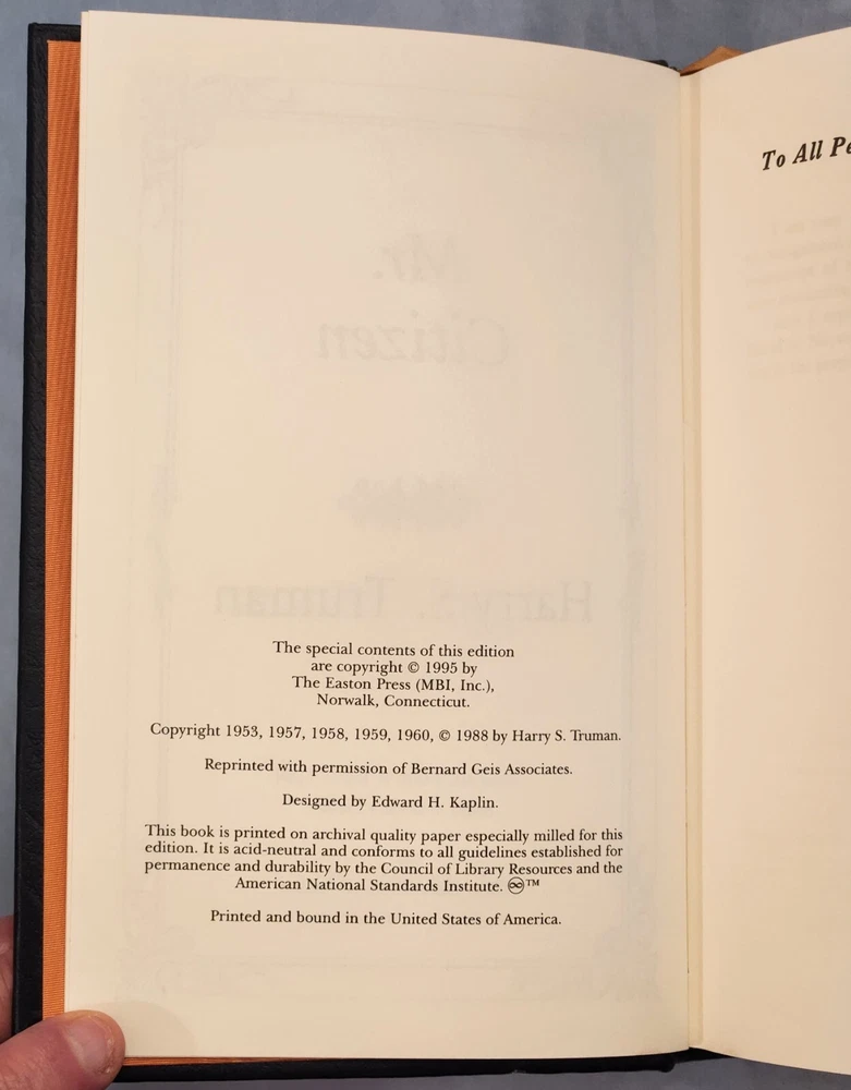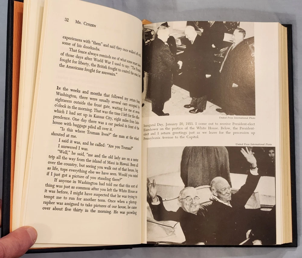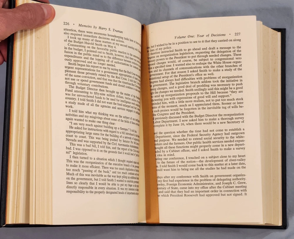 This is three of four volumes of Harry S. Truman's Memoirs. This set includes Year of Decisions, Years of Trial and Hope, and Mr. Citizen. The set is missing the fourth volume Truman Speaks. The set is Easton Press collectible set bound in quality leather with gold gilt. The work is printed on quality archival paper. Condition is Very Good. The previous owner's name is written on a couple of the volumes. The binding is good. The cover is in good condition. The pages are straight and clean. See pictures.