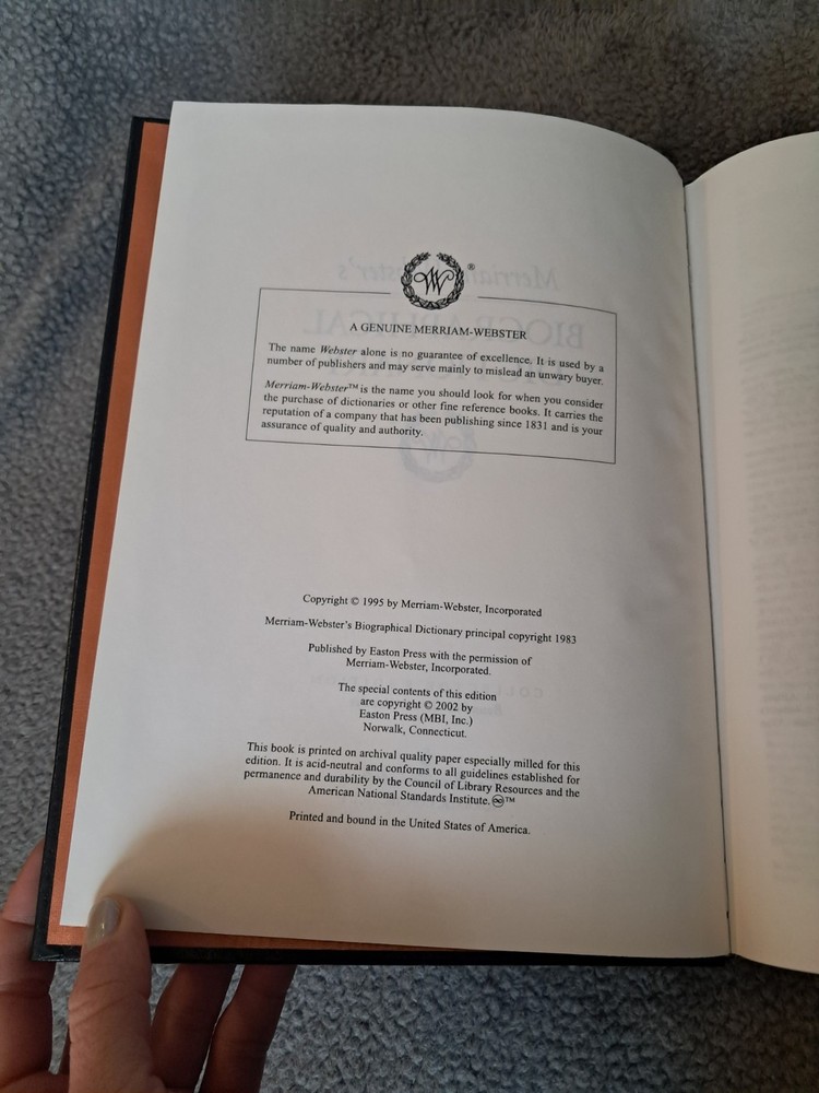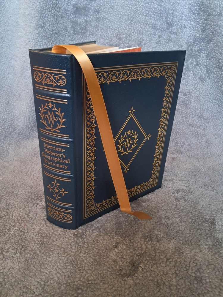 Easton Press collector's edition Merriam-Webster's Biographical Dictionary Features: Fully and tightly bound in genuine leather. 22kt gold accents deeply inlaid on the "hubbed" spine. Heavy duty binding boards enhance the book’s durability. Superbly printed on acid-neutral paper that lasts for generations. Sewn pages — not just glued like ordinary books. Handsome moiré endpages and a satin-ribbon page marker. Gilded page ends. Printed and bound in the USA using imported materials. Superb craftsmanship and commitment to quality you'd expect from Easton Press. 1170 pages Excellent condition