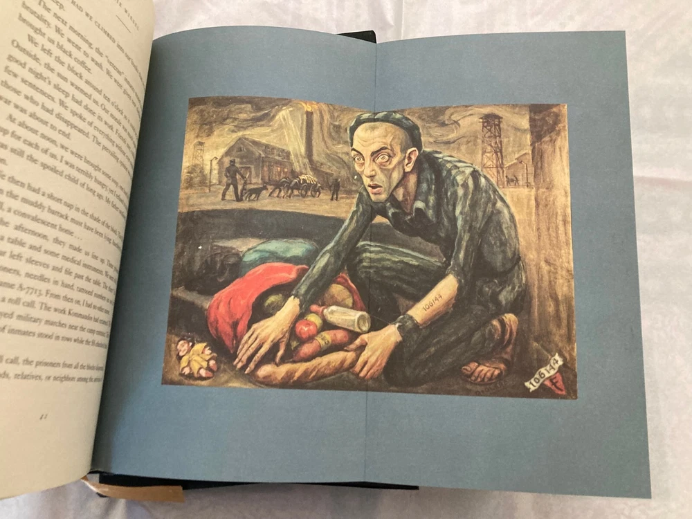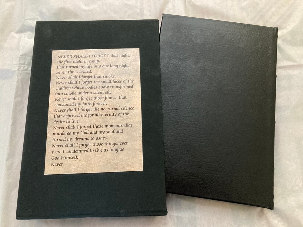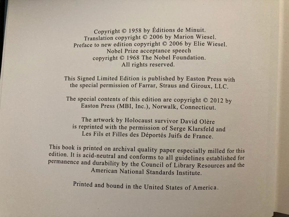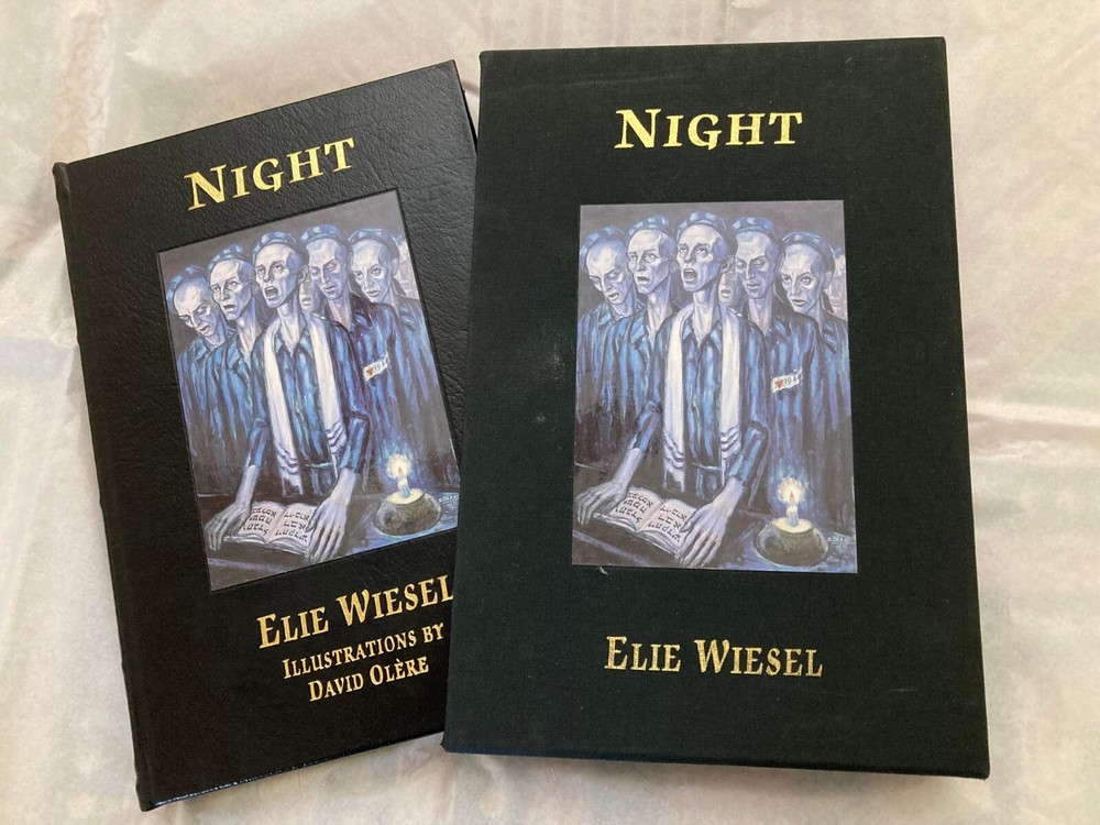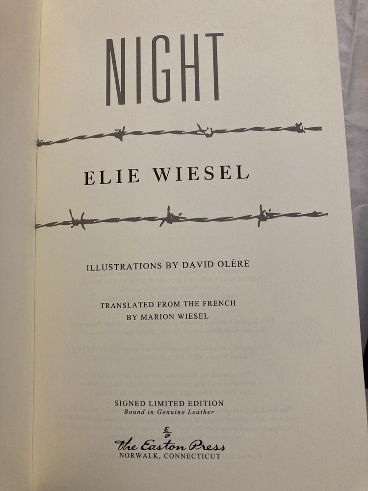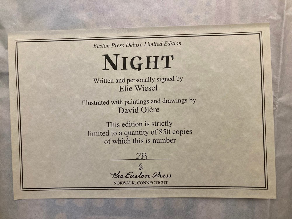 Night By Elie Wiesel (1928-2016) Translated from the French by Marion Wiesel Illustrated by David Olère (1902-1985) Published 2012 Includes Certificate of Authenticity Limited edition of 850 hand-numbered copies – this is #28. From Easton Press, a collectible slipcased deluxe limited edition of Wiesel's classic Holocaust survival memoir, signed by the author. #28/850. The book is bound in leather with 22k gold accents inlaid on the hubbed spine. It’s printed on heavy-weight, acid-neutral paper, with sewn pages, a satin ribbon page marker, and gilded page edges. Wiesel himself approved this 2006 translation by his wife, and wrote a new Preface for it. The Foreword is by François Mauriac. Also includes a short biography of the illustrator, famed Polish-French artist David Olère . Olère , like Wiesel, was an Auschwitz survivor committed to informing the world about the horrors of the Holocaust. Olère ’s gorgeous and heart-breaking large-format illustrations appear on fold-out pages. Condition is like-new – the book has been looked at but not read; there is a smudge on the front of the slipcase. Slipcased book size is 10.5" x 7" x 1.5".