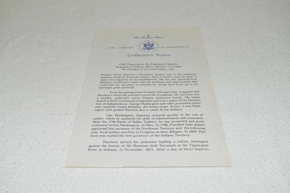 From the Easton Press Library of the Presidents Collector's Edition Series... Old Tippecanoe Biography of William Henry Harrison by Freeman Cleaves Copyright 1986 by The Easton Press Bound in Premium Full Leather This volume contains all of the classic Easton Press trimmings: Premium Leather Decorated Endleaves Distinctive Cover Design Hubbed Spine, Accented in Real 22KT Gold Satin Ribbon Page Marker Gilded Page Edges Long-lasting, High Quality Acid-neutral Paper Smyth-sewn Pages for Strength and Durability A very scarce title in any condition, this copy is in Fine condition. The front and back covers are both in near perfect condition and the gilded page edges show hardly any wear (see pictures). There are no writing, markings, bookplates, or other signs of prior ownership in this book. The binding is tight and square without spine lean. This book is part of the Library of Presidents published by Easton Press and comes complete with a Collector's Notes. It would be a beautiful addition to your Easton Press collection. This book is very elusive in this superior condition, as only a limited number of them were ever published, so now is the time to act. Hopefully you can add this book to your collection and enjoy it in the years to come... Please Email Me With Any Questions You Might Have! Shipping Info: Buyer to Pay Shipping and Handling International Bidders Pay Extra Shipping Forms of Payment Accepted: Paypal Good luck and happy bidding! Powered by eBay Turbo Lister The free listing tool. List your items fast and easy and manage your active items.
