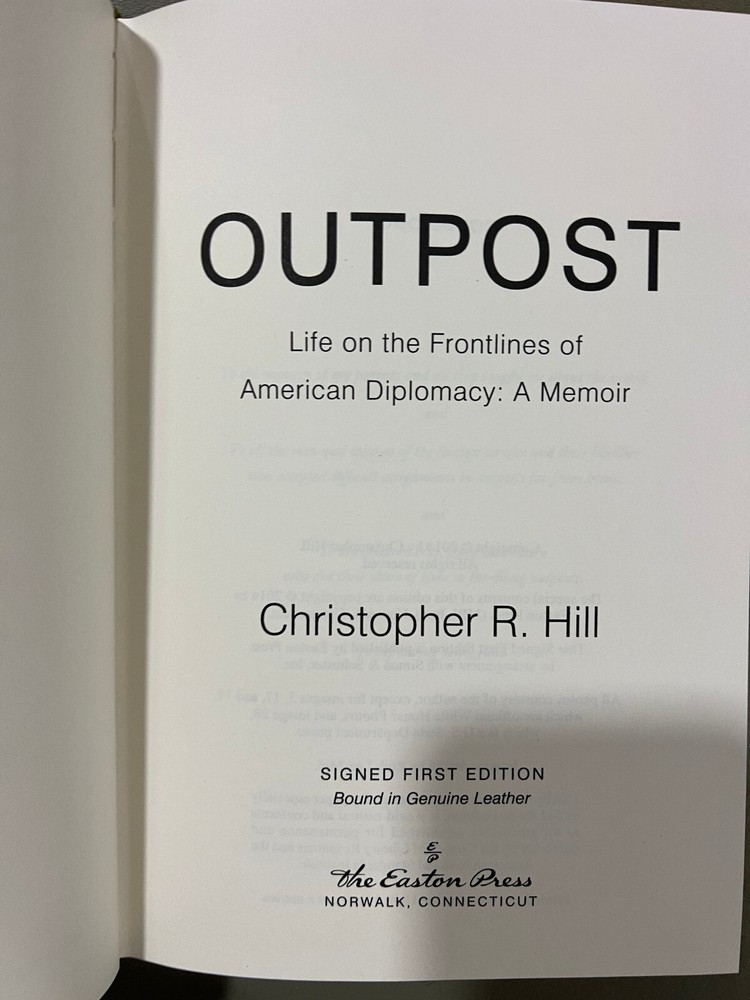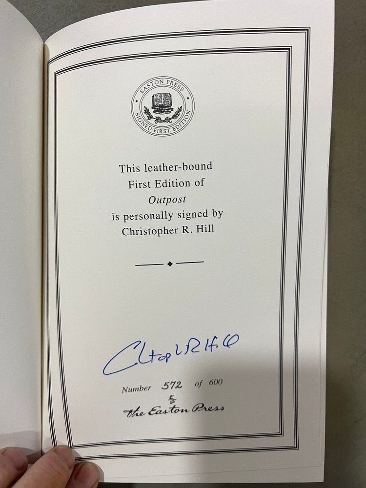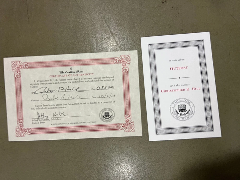 Outpost A Memoir by Christopher Hill SIGNED Easton Press 1st Editions Excellent Condition with Certificate of Authenticity! New Books get listed daily !!! 100s of Easton Press and Franklin Library books available!! All books get cleaned with a leather cleaner to remove any dust, odor and restore the beauty of leather!! Combined Shipping Discount: USA buyers - every book $1 off International combined shipping: 1 or 2 books - $45 3 or 4 books - $75 5 + books $17 per book 10+ books $13 per book WE SHIP DAILY!! RETURNS: Hassle-Free 30-days return policy and we pay for a return !! Check our Inventory (Link to eBay Store): http://stores.ebay.com/EastonFranklinBooks