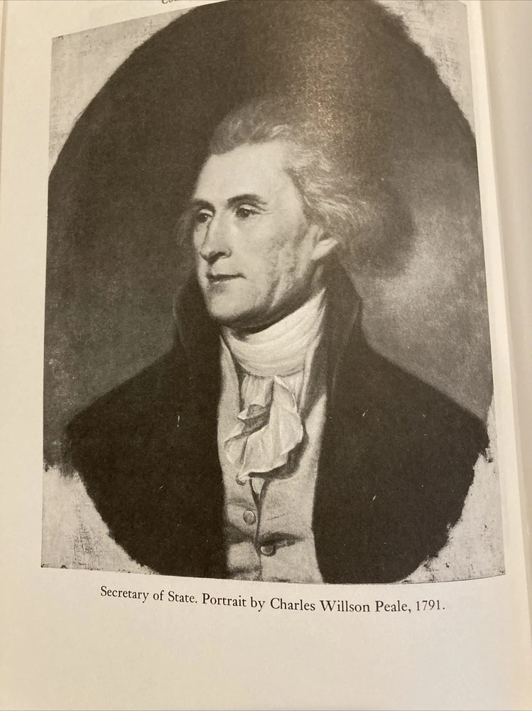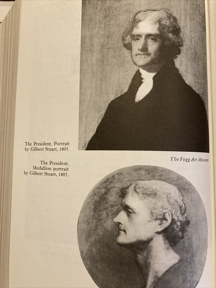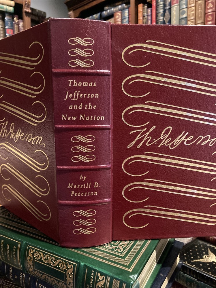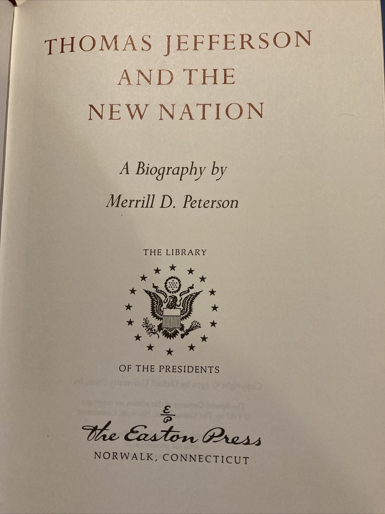 Easton Press leather edition of Merrill D. Peterson's "Thomas Jefferson and the New Nation," a COLLECTOR'S edition, Illustrated with Period Photographs, Frontispiece Portrait of Jefferson by Rembrandt Peale, one of the LIBRARY OF THE PRESIDENTS series, published in 1987. Bound in deep burgundy leather, the book has decorative paper end leaves, a satin book marker, acid-free paper, Symth-sewn binding, hubbed spine, gold gilding on three edges---in near FINE condition. COLLECTOR'S NOTES is included. Thomas Jefferson, who lived from 1743-1826, was the 3rd President of the U.S., 1801-1809. No other founding father had as powerful and as lasting an effect on the future of the new nation. Politician, poet, architect, philosopher, lawyer, farmer, philanthropist, scientist, inventor, writer---Jefferson was all of these things. Jefferson rose to fame as one of the most outspoken of the American revolutionaries. A graduate of the College of William and Mary, and an attorney who had studied with GEORGE WYETH, Jefferson secured a prominent place in history as the author of the Declaration of Independence. Jefferson served as Governor of Virginia, Vice President with JOHN ADAMS, and later as President of the U.S. He kept the young nation out of war and arranged the LOUISIANA PURCHASE, which doubled the territory of the U.S. He fought and won passage of a bill that nearly halved the sale price of government-owned lands, thus encouraging settlement of the West. Jefferson organized and helped plan the LEWIS and CLARK EXPEDITION of 1804. Jefferson married MARTHA WAYLES and they became parents to two daughters, Mary and Martha, who married THOMAS MANN RANDOLPH. When Jefferson retired from the Presidency in 1809, he returned to MONTICELLO where he lived with Martha and his 11 grandchildren. He is "rumored" to have fathered several children with his mulatto, SALLY HEMINGS. Monticello was the name of a mountain, the name of a farm, and above all the name of a house. When Jefferson returned from France in 1790, he remodeled Monticello, stating "Architecture is my delight." Jefferson's estate was in sad repair when he left the presidency. In 1810, Jefferson described his daily routine: "My mornings are devoted to correspondence. From breakfast to dinner, I am in my shops, my garden, or on horseback among my farms; from dinner to dark, I give to society and recreation with my neighbors and friends, and from candle light to early bed-time, I read." Jefferson was the founder of the UNIVERSITY OF VIRGINIA, and an opponent of slavery---although he owned hundreds of slaves. Jefferson also served as Minister to France. 1072 pages----including a Select Bibliography and Index. I offer Combined shipping.