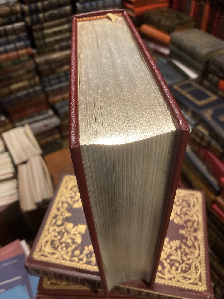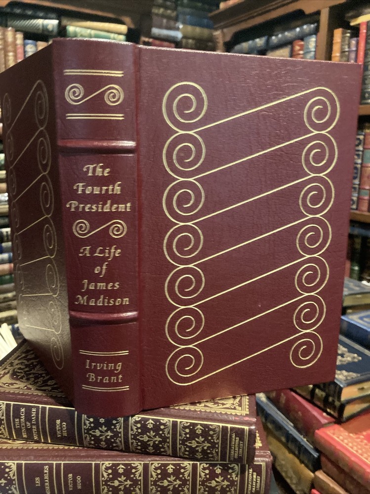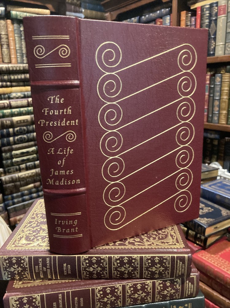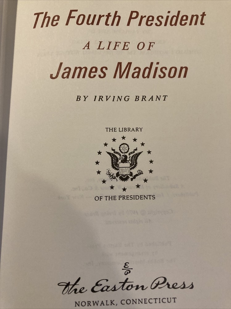 Easton Press leather edition of Irving Brant's "The Fourth President: A Life of James Madison," a Collector's editions, one of the LIBRARY OF THE PRESIDENTS series, published in 1978. Bound in brown leather, the book has decorative paper end leaves, satin book marker, hubbed spine, gold gilding on three edges---in near FINE condition. COLLECTOR'S Notes is included. James Madison, who lived from 1751-1836, was the chief architect of our country's Constitution. Born in Port Conway, VIRGINIA, he graduated from the College of New Jersey (later Princeton). Brant writes that Madison might have become a clergyman or a lawyer, but from 1775 he was almost continuously in public office. An active and intelligent delegate to the Continental Congress sessions of 1780-83 and 1787-88, he attained his first federal position as U.S. Congressman (1789-97), and served as Secretary of State during the Thomas JEFFERSON administration, 1801-09. He was elected to the Presidency in 1808 and again in 1812. Physically, Madison was the smallest of all our presidents, being only five feet six inches tall, and weighing but 100 pounds. Reticent in public, nearly inaudible in speech---yet witty in conversation--he was a scholarly man. Madison married widow, DOLLY PAYNE, a dashingly attractive Quaker girl. Madison was forty-three years old when he married Dolly and later adopted her son. James and Dolly did not have any children; however, their marriage was seemingly very loving. Dolly served as JEFFERSON'S social hostess at the White House and later when her husband was President, she saved the GEORGE WASHINGTON painting before the British burned the White House in 1814. Dolly was infamous for her "turban hats" and gracious style of entertaining. In theory, Madison was opposed to owning slaves but his family owned nearly 100. When Madison returned on visits to his family's plantation at Montpelier, the slaves were "elated" and would shout, "Mister Jemmy has come." He sought ways to make a living that did not involve slave labor, buying 900 acres in partnership with James Monroe, but this 'western land' did not provided the money Madison needed. Madison, who served during the WAR OF 1812 with the British, was personal friends with GEORGE WASHINGTON, THOMAS JEFFERSON, and JAMES MONROE---and they were often referred to as the "Virginia dynasty." 681 pages. Combined shipping is available.